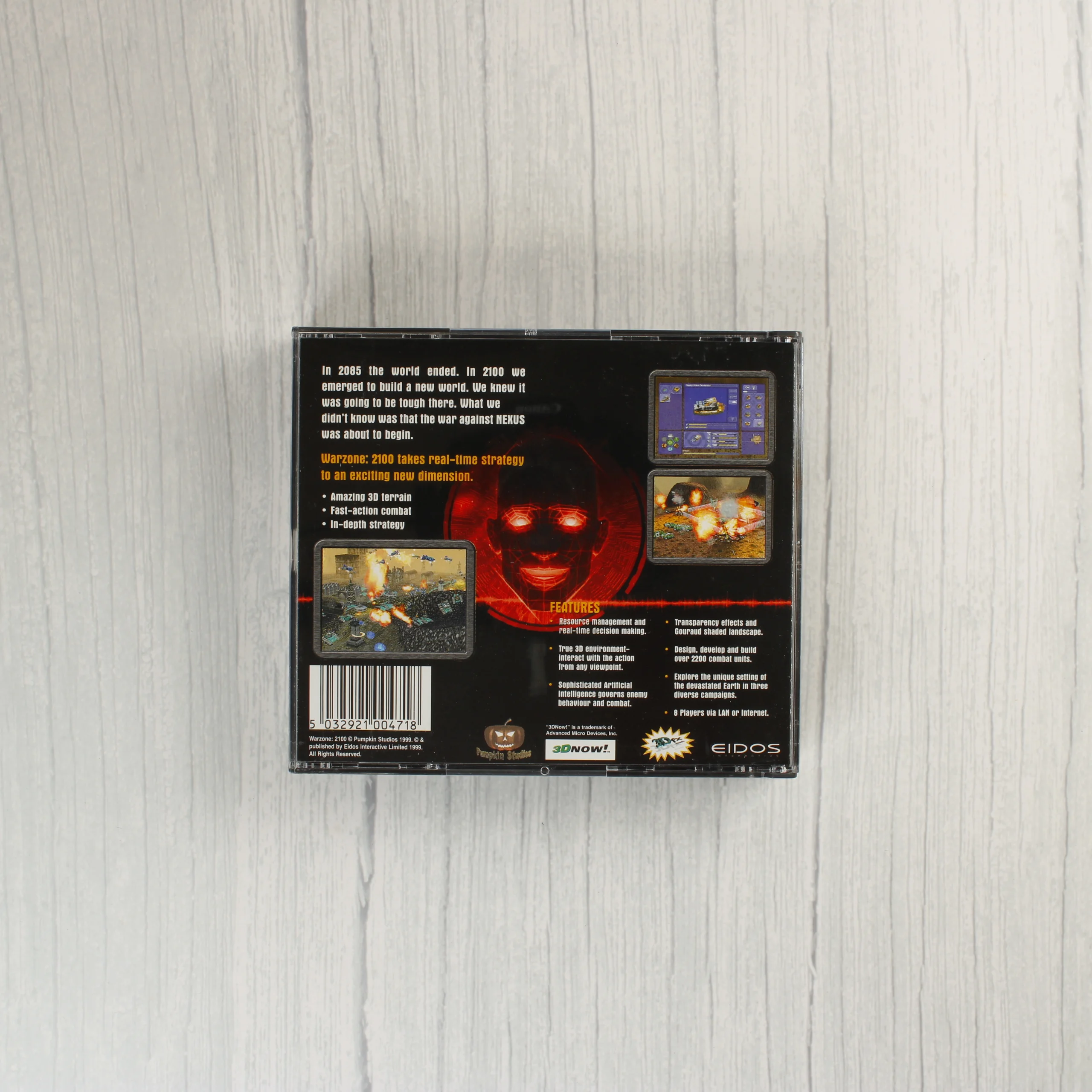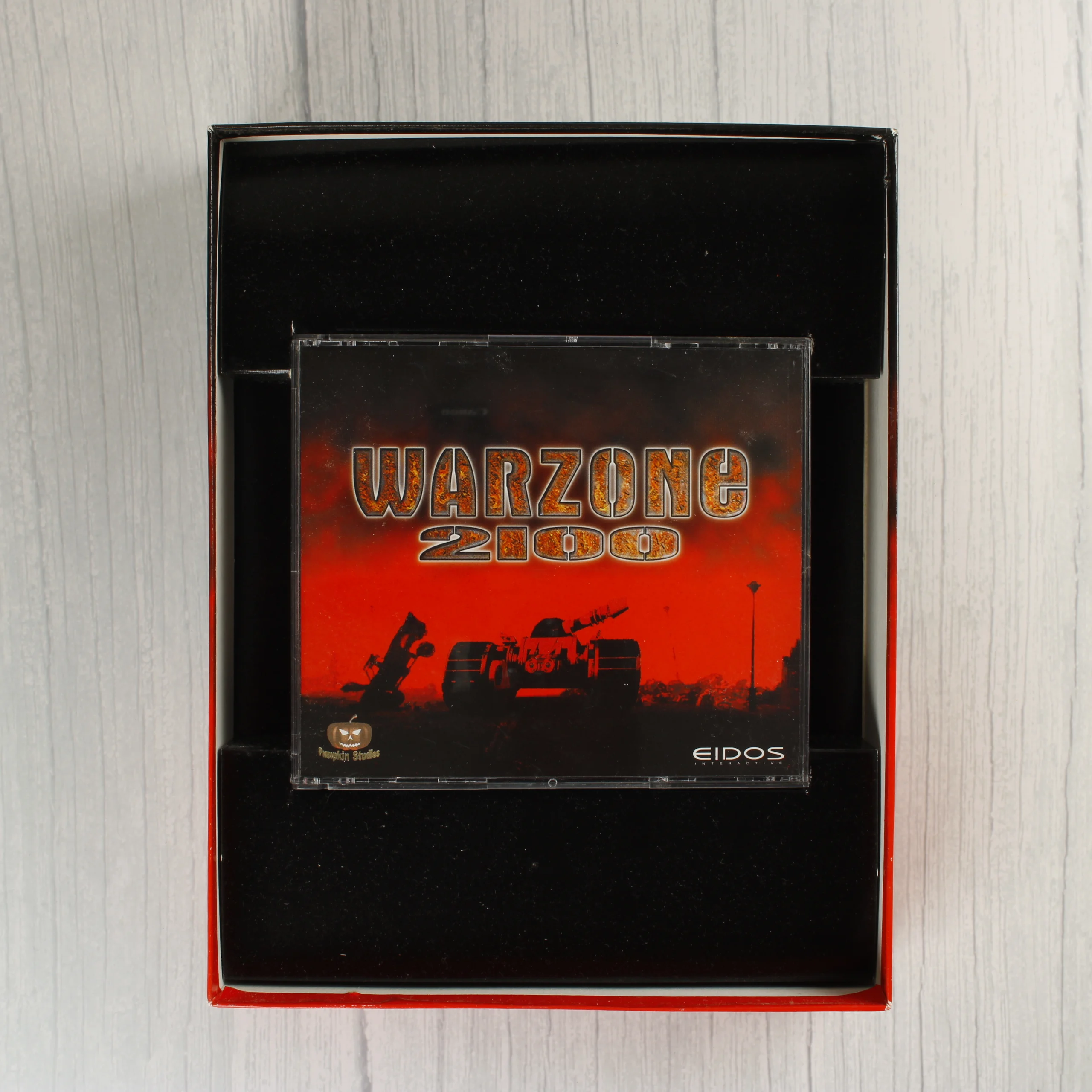 A Warzone 2100 című videójáték PC-s kiadása, eredeti nagy kartondobozos csomagolásban. A készlet tartalmazza a külső papírdobozt, egy vastag műanyag tokot két CD-vel, valamint a színes használati útmutatót. A doboz grafikája vörös és fekete színekben pompázik, egy futurisztikus harckocsit ábrázolva. A hátoldalon játékmenet-képernyőképek és angol nyelvű leírás látható. A belső műanyag tok átlátszó, benne a két lemez szürke alapon fekete grafikával rendelkezik. A kiadványon az Eidos Interactive és a Pumpkin Studios logói szerepelnek.