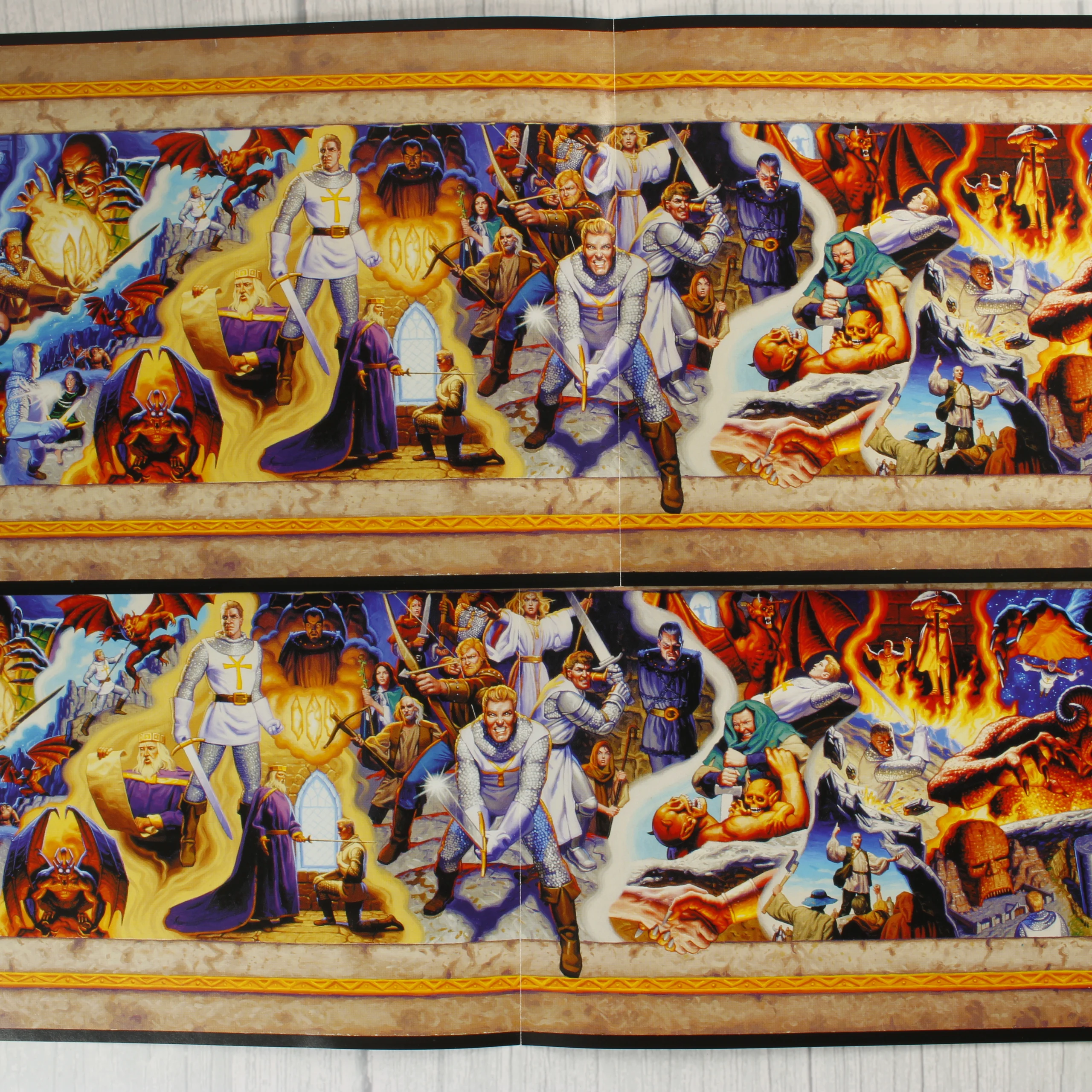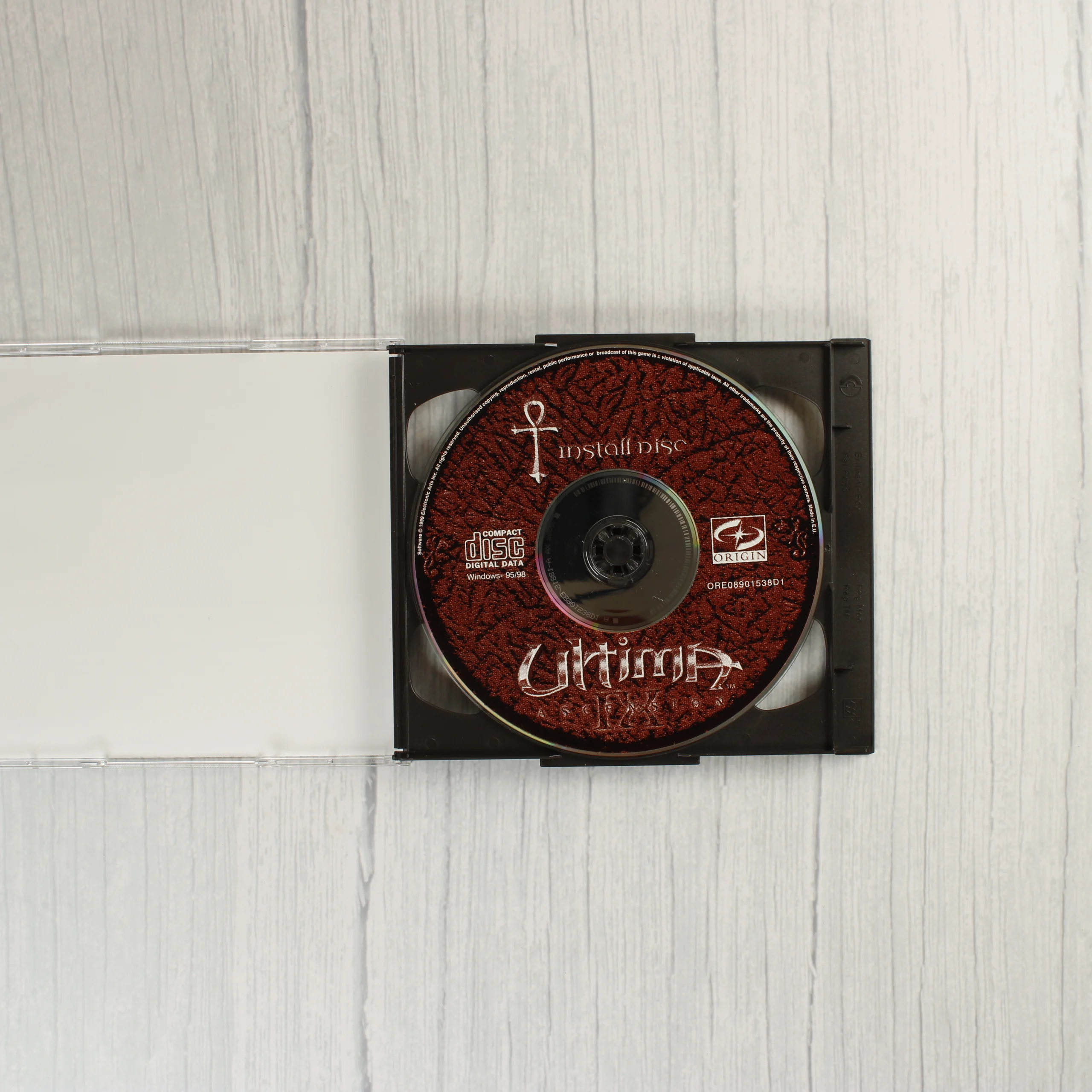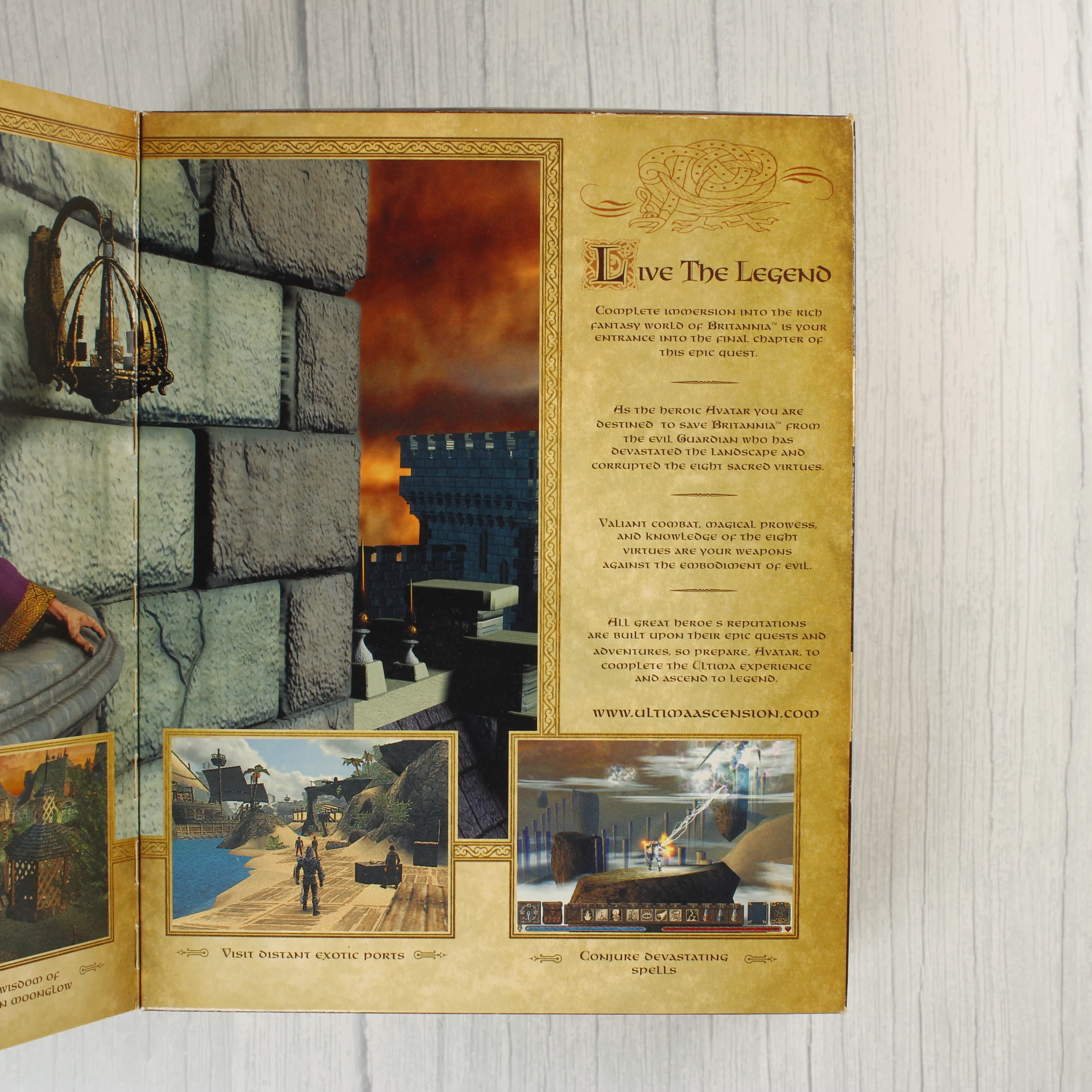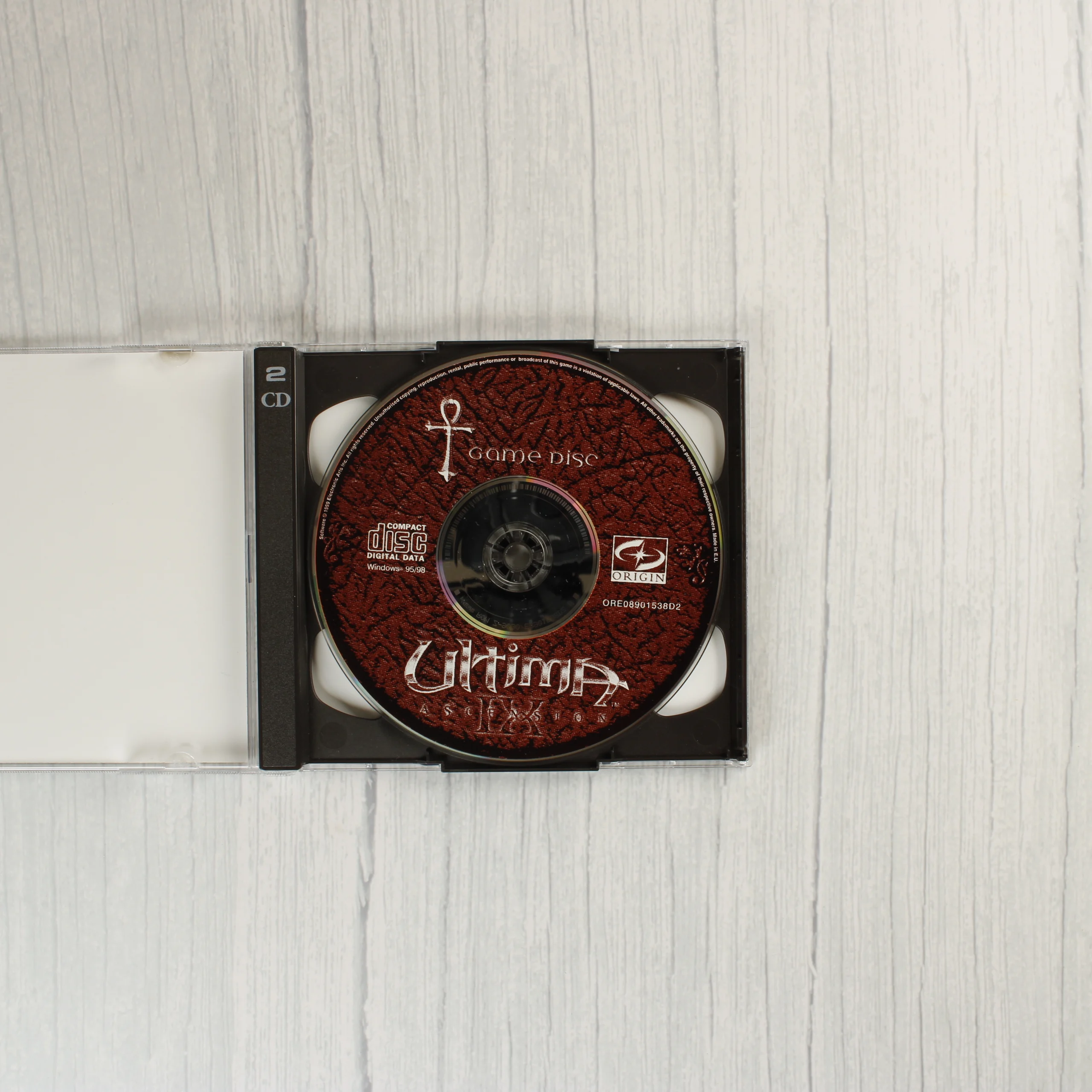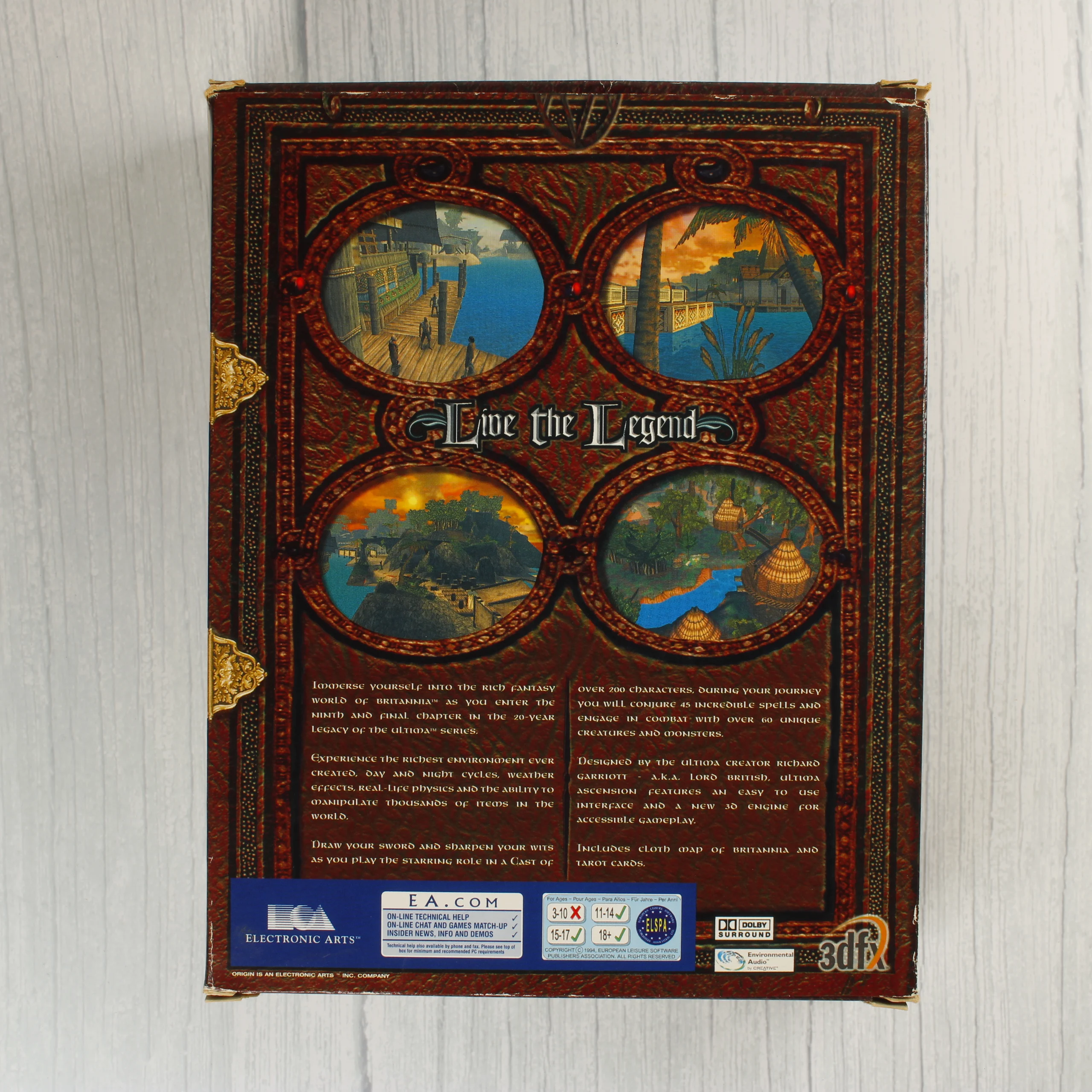 Az Ultima IX Ascension videójáték nagy méretű, díszes kartondobozos kiadása. A csomag tartalmazza a játékot két CD-lemezen, amelyek egy dupla műanyag tokban helyezkednek el. A készlet része továbbá egy barna, bőrszerű textúrával ellátott magyar nyelvű kézikönyv, nyolc darab színes illusztrációval díszített tarot kártya és egy nagyméretű, színes poszter. A doboz elején egy páncélos alak látható boltíves keretben, aranyozott hatású sarokdíszekkel. A hátoldalon játékmenet-képek és angol nyelvű leírás olvasható. A doboz élei mentén enyhe kopás és fehéredés látható, különösen a sarkoknál, de a belső tartalom megkímélt állapotúnak tűnik.