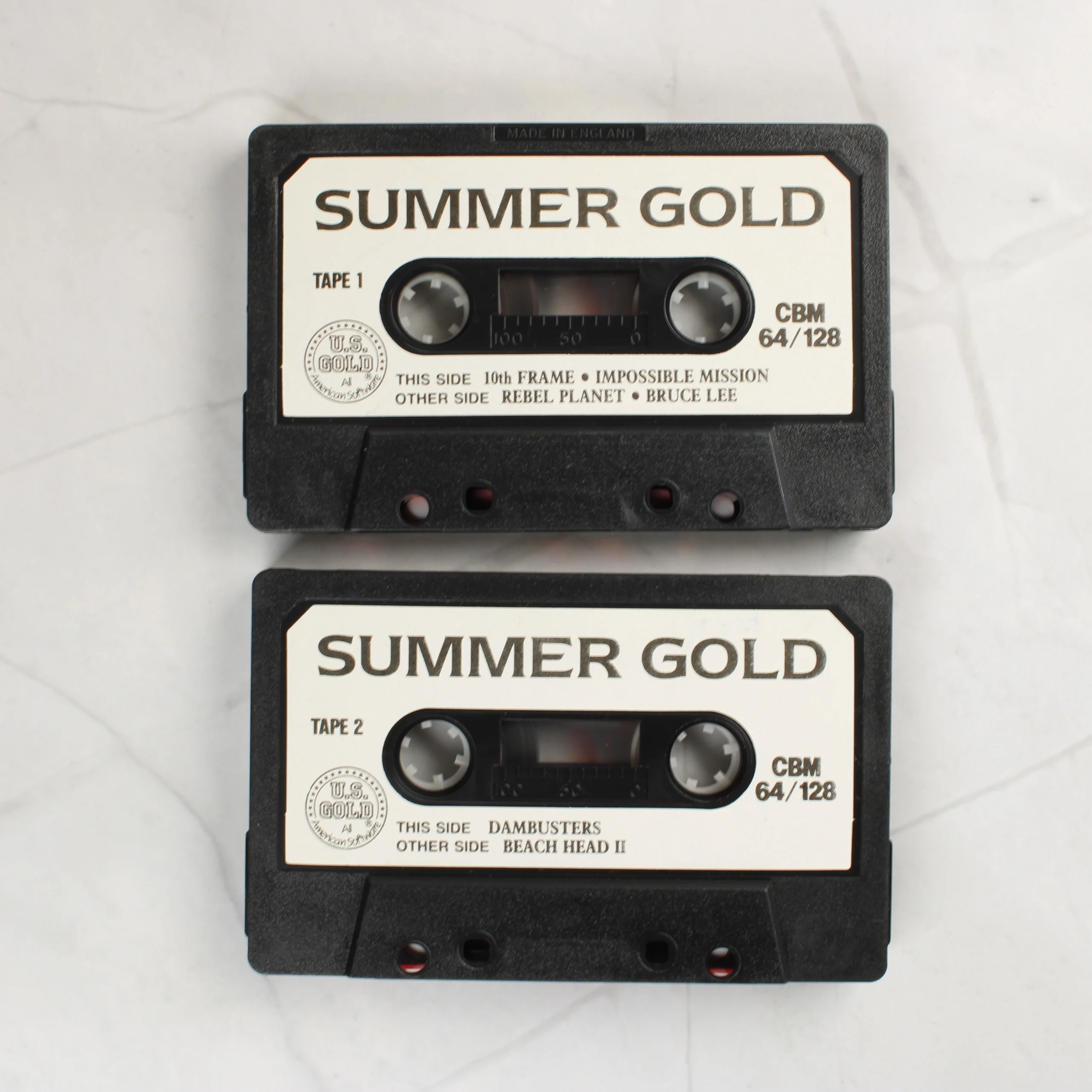 A Summer Gold egy hat klasszikus videójátékot tartalmazó válogatás Commodore 64 és 128 rendszerekhez. A csomag két darab fekete színű, fehér címkés magnókazettát tartalmaz, amelyek egy átlátszó műanyag tokban helyezkednek el. A borítón nyári, tengerparti illusztráció látható sárga és kék színekkel, rajta a 10th Frame, Impossible Mission, Rebel Planet, Dambusters, Bruce Lee és Beach Head II játékok címeivel. A kazetták címkéi tiszták, a feliratok jól olvashatóak, a szalagok épnek tűnnek. A műanyag tok felületén apróbb karcok és használati nyomok láthatóak, de szerkezetileg ép. A hátoldalon vonalkód és a kiadó adatai szerepelnek.