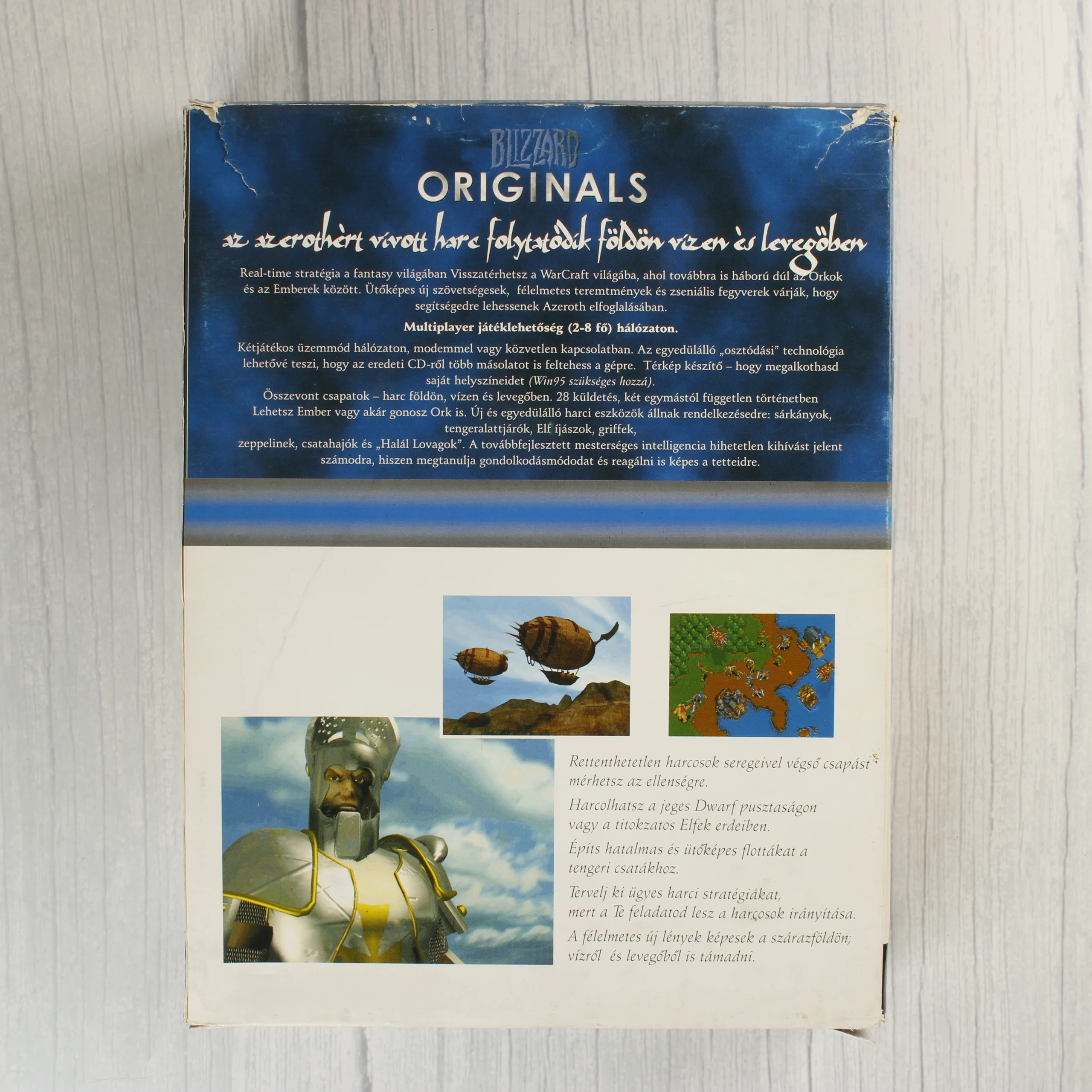 A Warcraft II: Tides of Darkness videójáték magyar nyelvű, Blizzard Originals kiadása. A csomag tartalmazza az alapjátékot és a Beyond the Dark Portal kiegészítőt két különálló CD-ROM lemezen, amelyek átlátszó műanyag tokban helyezkednek el. A külső kartondoboz fehér és kék színvilágú, az elején az ikonikus ork és ember harcos látható. A doboz hátoldalán magyar nyelvű leírás és játékmenet-képek szerepelnek. A kiadvány MS-DOS platformra készült. A doboz alsó részén jelentős felületi sérülés, szakadás és anyaghiány látható, ahol a papír felső rétege levált. A sarkok és élek kopottak, a doboz teteje enyhén deformált. A CD-tokok karcosak, de épek.