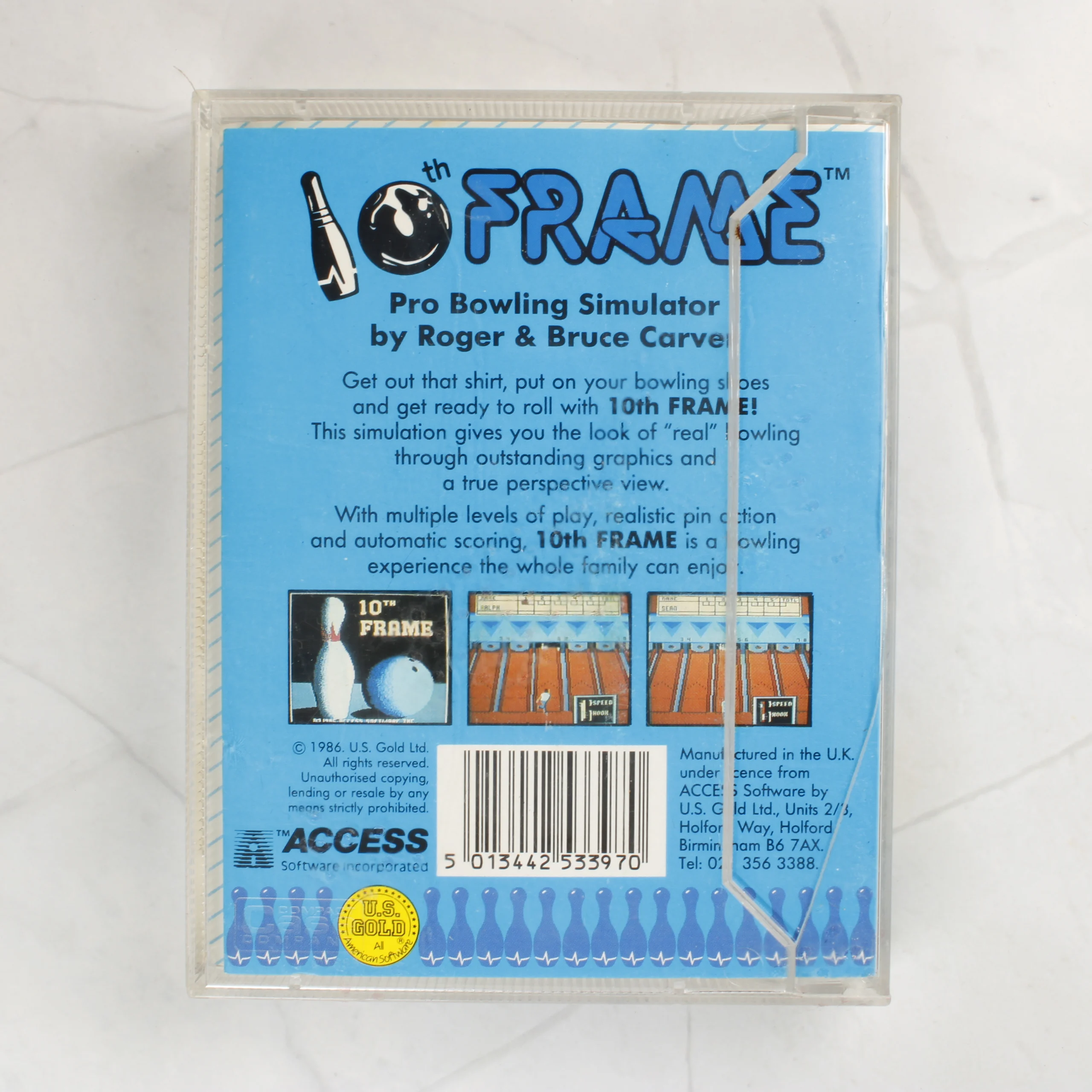 A 10th Frame egy Commodore 64 és 128 rendszerekre megjelent bowling szimulátor videójáték, amely kazetta formátumban érhető el. A termék egy átlátszó műanyag tokban található, amelyben egy színes papírborító látható. A borító grafikája egy bowlingozót, repülő bábukat és egy golyót ábrázol, élénk kék, piros és sárga színekkel. A hátoldalon angol nyelvű leírás és képernyőmentések láthatóak a játékmenetből. A csomag részét képezi egy szürke színű, feliratozott kazetta is, amelyen a játék címe és a platform megjelölése szerepel. A kiadó az U.S. Gold, a fejlesztő pedig az Access Software. A borítón több európai zászló is látható, utalva a többnyelvű terjesztésre.
