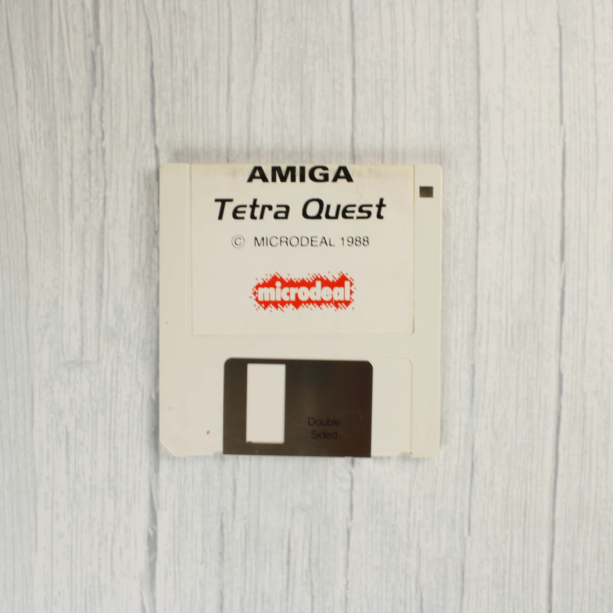 A Tetra Quest egy 1988-as kiadású videójáték Amiga számítógépre, amelyet a Microdeal jelentetett meg. A csomag tartalmaz egy eredeti 3,5 colos floppy lemezt és egy átlátszó műanyag tokot a hozzá tartozó borítóval. A borító előlapján egy futurisztikus űrhajó látható, amint egy kék gömbökből álló akadály felé repül. A hátoldalon angol nyelvű leírás, készítői adatok és képernyőmentések találhatók a játékról. A floppy lemez fehér színű, rajta a játék címe, a kiadó logója és a szerzői jogi információk olvashatók. A fém védőlemez 'Double Sided' felirattal van ellátva. A műanyag tok az idő múlásával enyhén besárgult, de szerkezetileg ép.