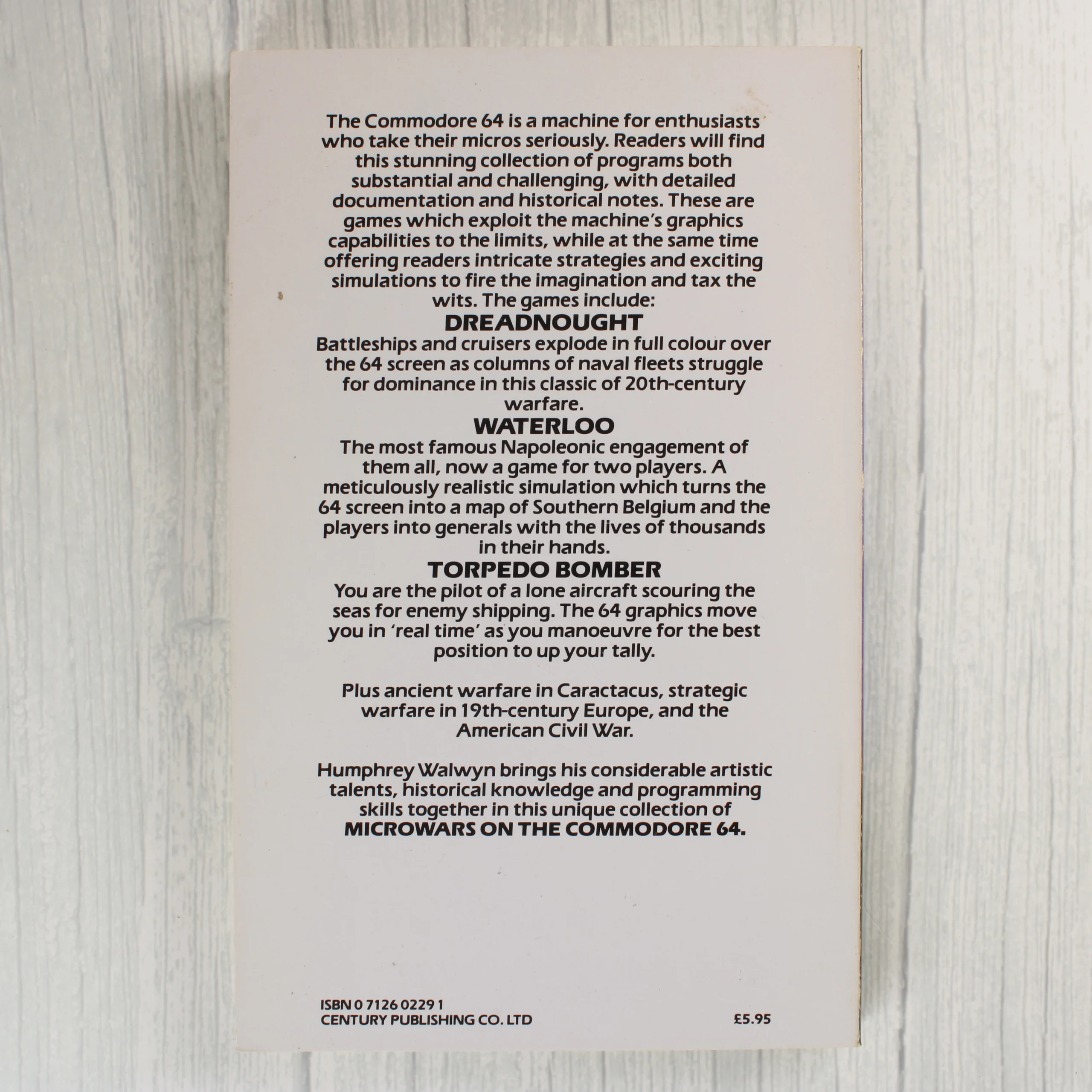 A Micro Wars on the Commodore 64 című könyv Humphrey Walwyn tollából, a Century Publishing gondozásában. A puhafedeles kötet borítója kék alapszínű, amelyen fehér és piros feliratok láthatók, alul pedig korabeli katonai figurák illusztrációja szerepel. A hátoldalon a könyv tartalmának részletes leírása olvasható, amely különböző stratégiai és háborús szimulációs programokat mutat be a Commodore 64 platformra. A borító élei mentén apróbb kopások és használati nyomok fedezhetők fel, de a könyv szerkezetileg ép és tiszta állapotban van.