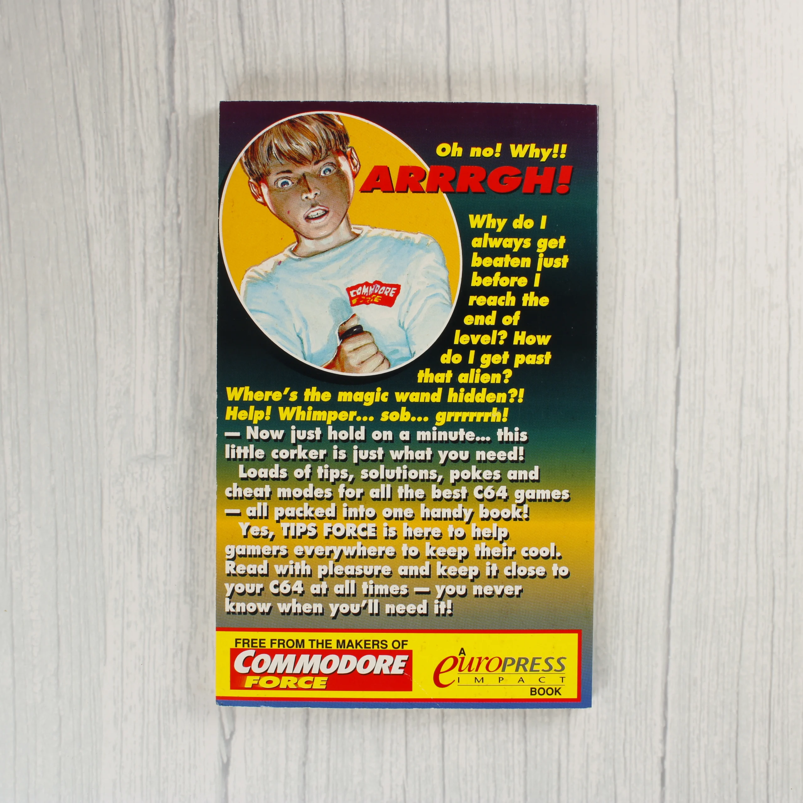 A Commodore Force Presents: Tips Force egy 100 oldalas, puhafedeles kiadvány, amely tippeket, csalásokat és megoldásokat tartalmaz Commodore 64 videójátékokhoz. Az elülső borítón egy illusztráció látható, amelyen egy fiatal fiú látható játék közben, kezében egy joystickkal. A borító színes, dominánsan sárga, piros és sötétkék árnyalatokkal, rajta a Tips Force felirat nagy, sárga betűkkel olvasható. A hátoldalon további leírás található a könyv tartalmáról, valamint a Commodore Force és az Europress Impact logói láthatóak. A kiadvány állapota megkímélt, a sarkok és élek épek, a borító felülete tiszta, jelentős gyűrődés vagy szakadás nem látható rajta. A fűzés szorosnak tűnik, a lapok nem járnak ki.
