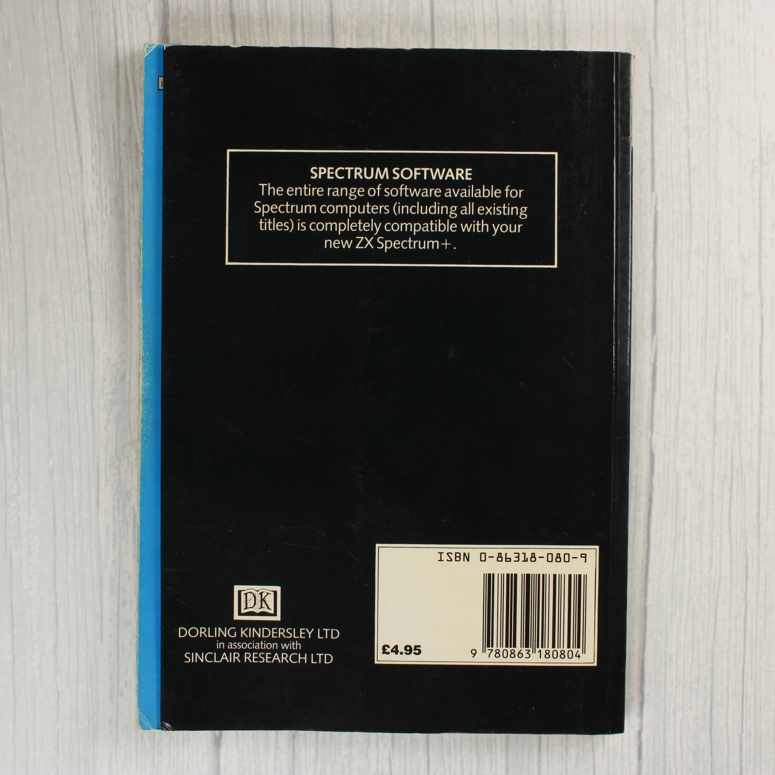 A Sinclair ZX Spectrum+ számítógéphez készült eredeti felhasználói kézikönyv. A kiadvány fekete borítóval rendelkezik, amelyen a Sinclair logó, a termék megnevezése piros és fehér betűkkel, valamint a jellegzetes négyszínű szivárvány motívum látható. A hátoldalon a Dorling Kindersley Ltd és a Sinclair Research Ltd logója, egy rövid ismertető szöveg a szoftverkompatibilitásról, valamint az ISBN azonosító és a vonalkód szerepel. A könyv gerince kék színű. A borító felületén apróbb használati nyomok, enyhe kopások és karcolások figyelhetők meg, különösen a széleken és a sarkokon. A papír állapota korának megfelelő, a színek jól megőrződtek.
