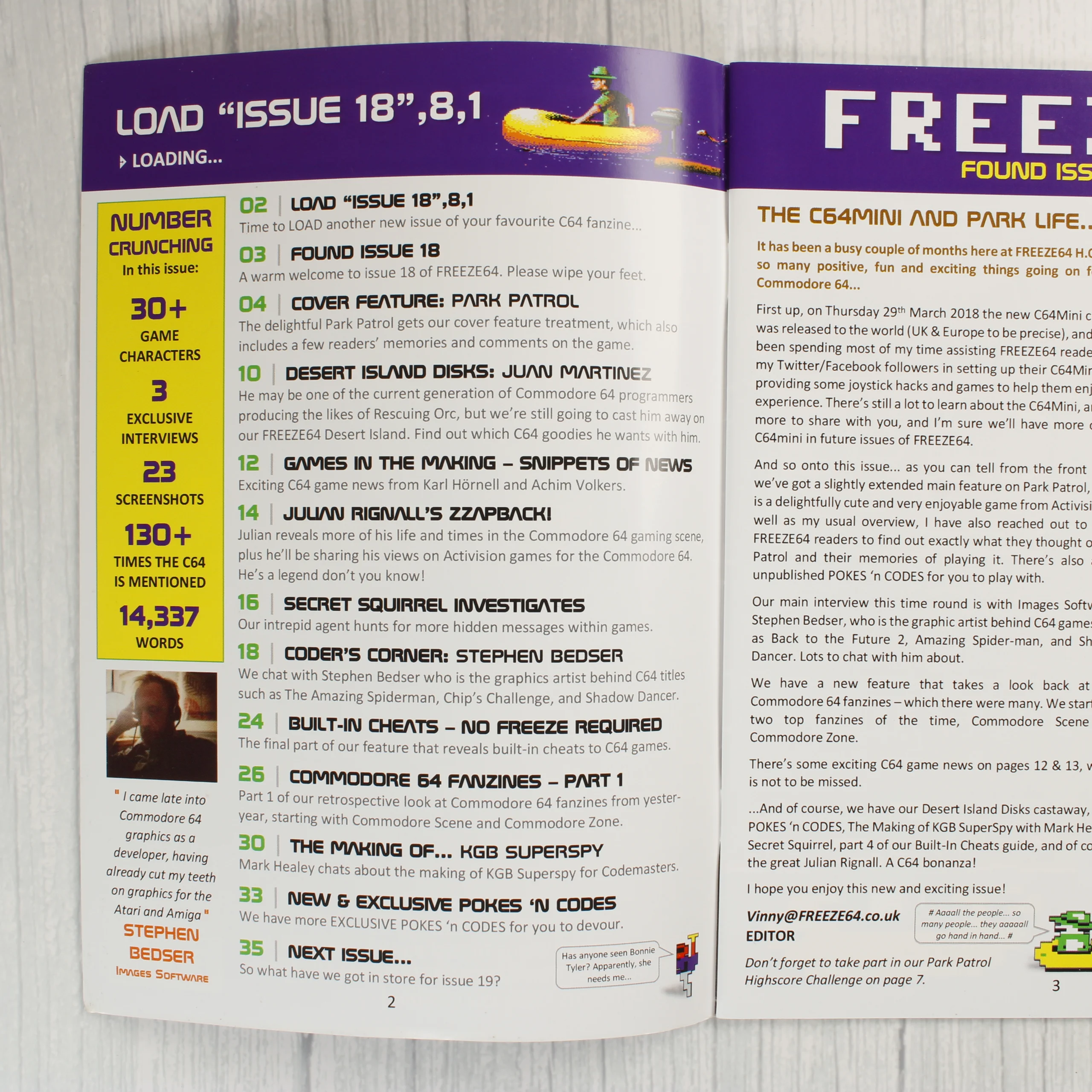 Freeze64 fanzin 18. szám (2018. június) Commodore 64 rajongóknak. Park Patrol címlapsztori, interjúk és csalások egy megkímélt állapotú magazinban.