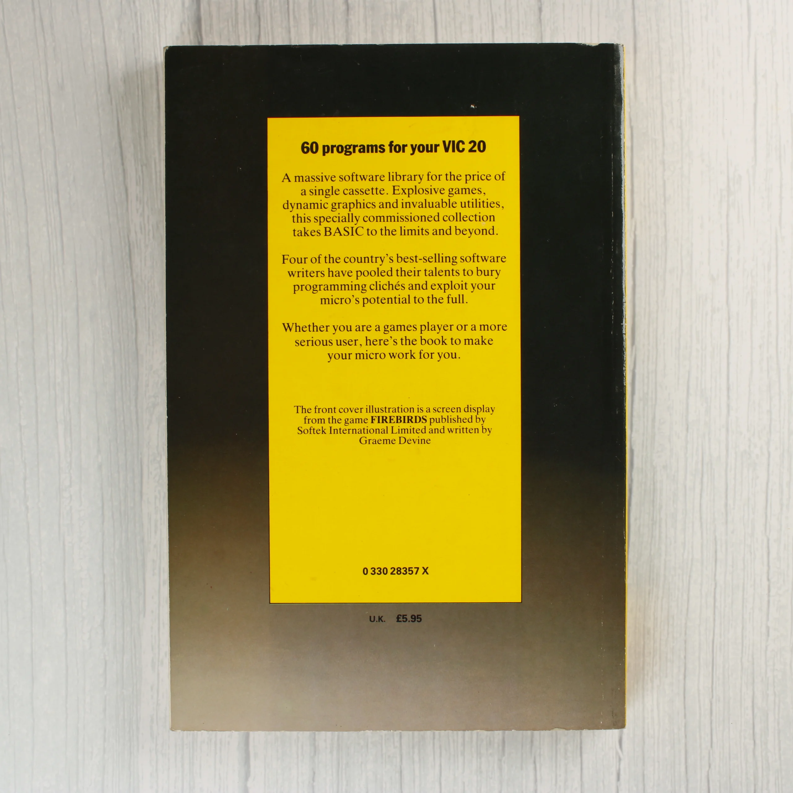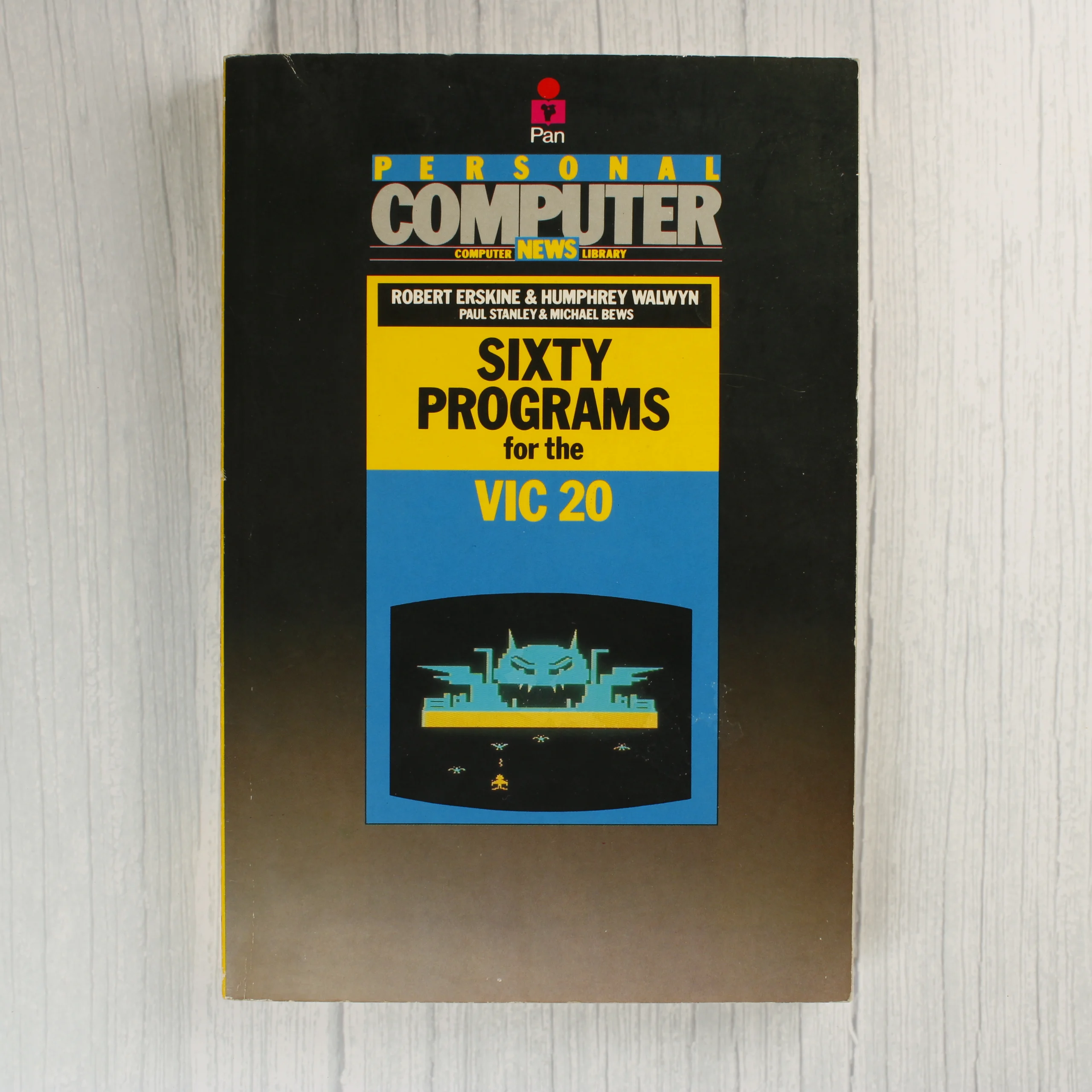 A Sixty Programs for the VIC 20 egy puhafedeles számítástechnikai szakkönyv, amely a Pan Personal Computer News Library sorozat része. A borító fekete alapszínű, középen sárga és kék sávokkal, amelyeken a cím és a szerzők nevei olvashatók. Az előlapon egy videójátékból származó képernyőmentés látható. A könyv Robert Erskine, Humphrey Walwyn, Paul Stanley és Michael Bews munkája. A hátoldalon sárga keretben olvasható a tartalom rövid összefoglalója és az ISBN azonosító. A kiadvány élei mentén enyhe kopás és használati nyomok látszanak, a sarkok minimálisan lekerekedtek, de a kötés épnek tűnik.