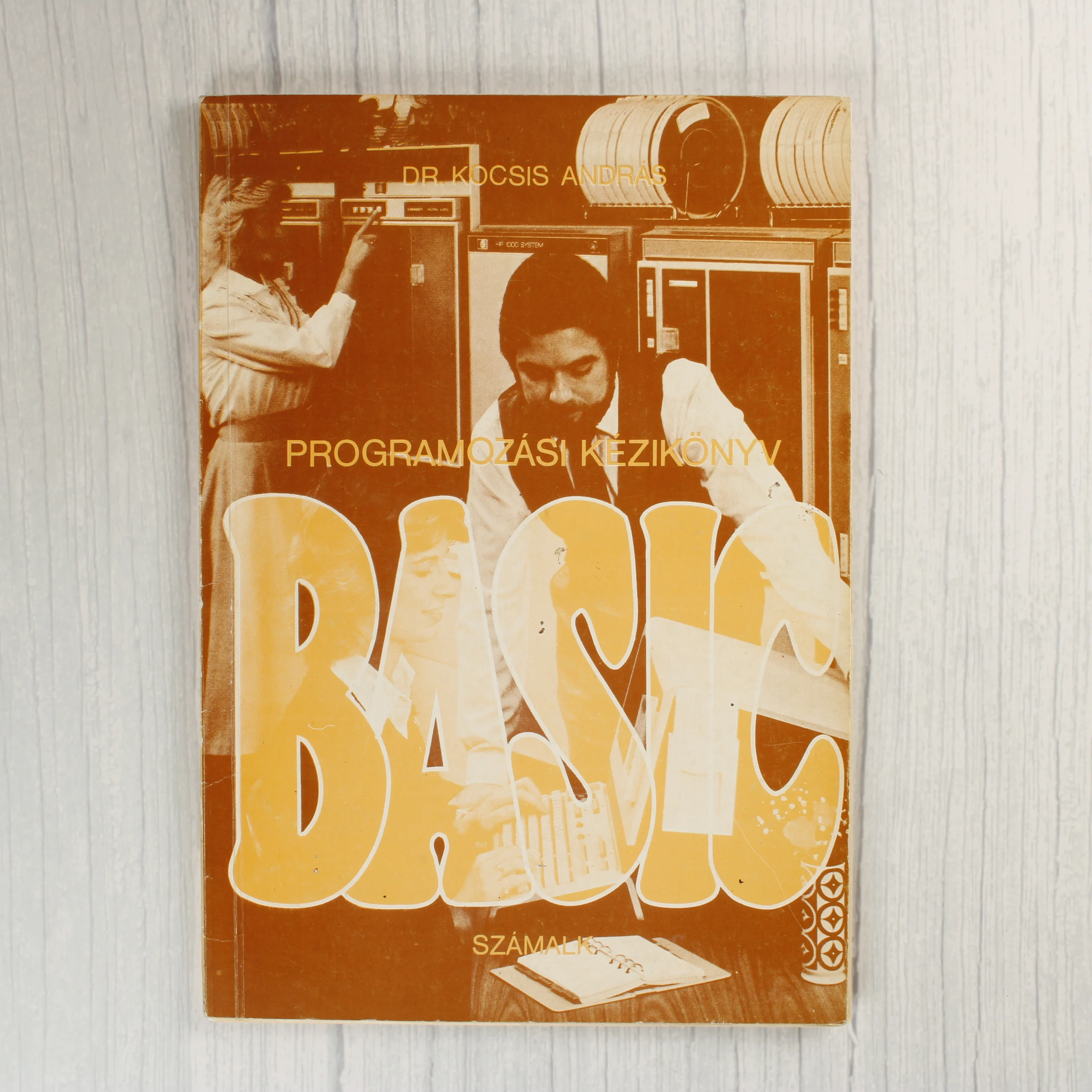 Dr. Kocsis András BASIC programozási kézikönyv című kötete, amelyet a Számítástechnika-alkalmazási Vállalat (SZÁMALK) adott ki. A puhafedeles könyv borítója barna tónusú, rajta egy korabeli számítógépteremben dolgozó alakok láthatóak, valamint a BASIC felirat nagy, sárga betűkkel. A belső oldalakon a szöveg tiszta, jól olvasható, fekete betűkkel nyomtatott, ábrákat és kódrészleteket is tartalmaz. A papír az idő múlásával enyhén sárgult, ami a korának megfelelő természetes folyamat. A borító élei és sarkai minimális kopást mutatnak, de a kötés épnek tűnik.