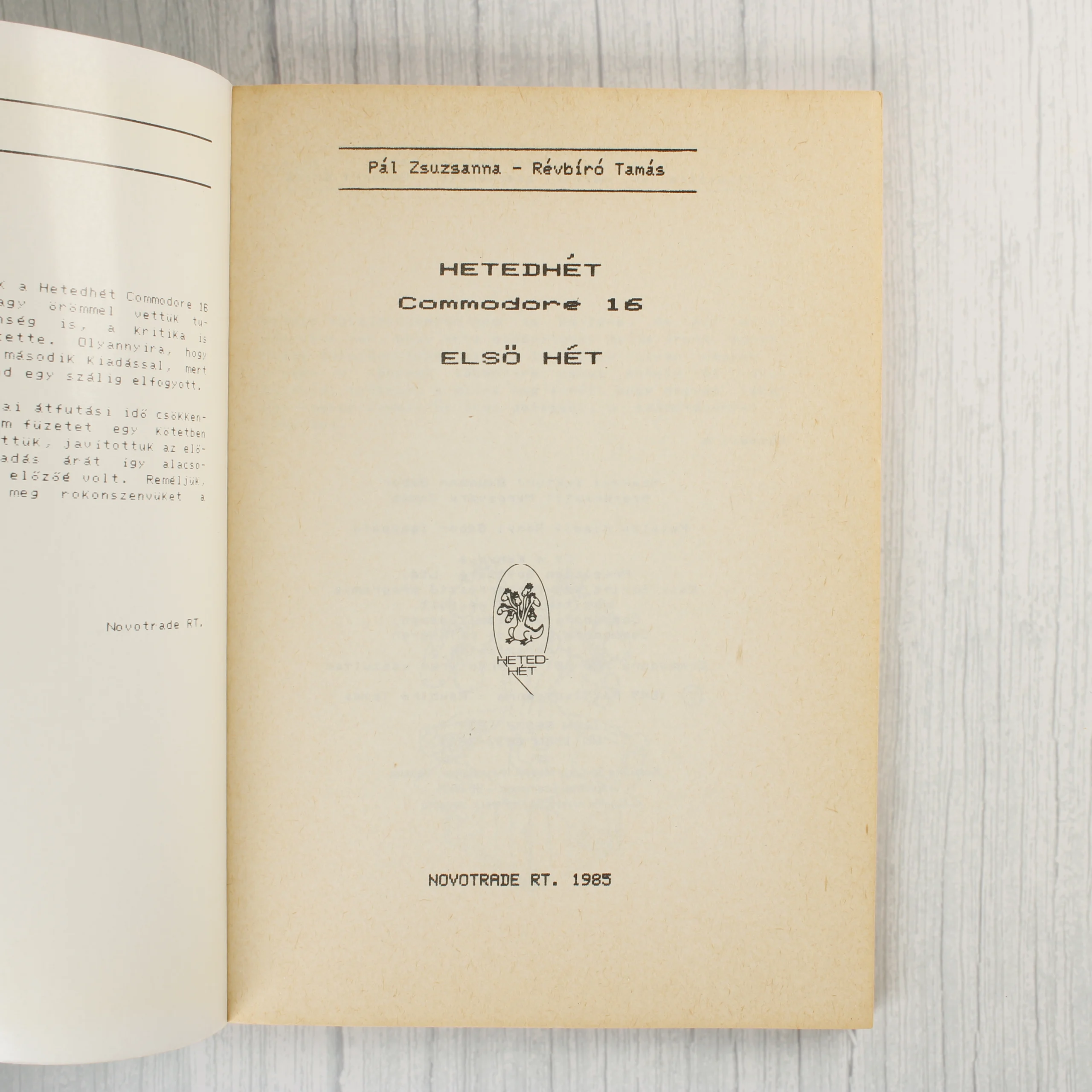 A Hetedhét Commodore 16 című kiadvány egy 1985-ben megjelent számítástechnikai könyv, amely a Novotrade RT. gondozásában látott napvilágot. A puhafedeles borító világoskék alapszínű, rajta a Commodore logóval és egy hétfejű sárkányt ábrázoló emblémával. A belső oldalakon géppel írt szöveg és egyszerű illusztrációk láthatók, amelyek a BASIC programozási nyelv alapjait magyarázzák el. A papír az idő múlásával enyhén megsárgult, ami a korabeli nyomdatechnikára jellemző. A borító élei és sarkai minimális kopást mutatnak, de a kötés ép és a lapok tiszták.