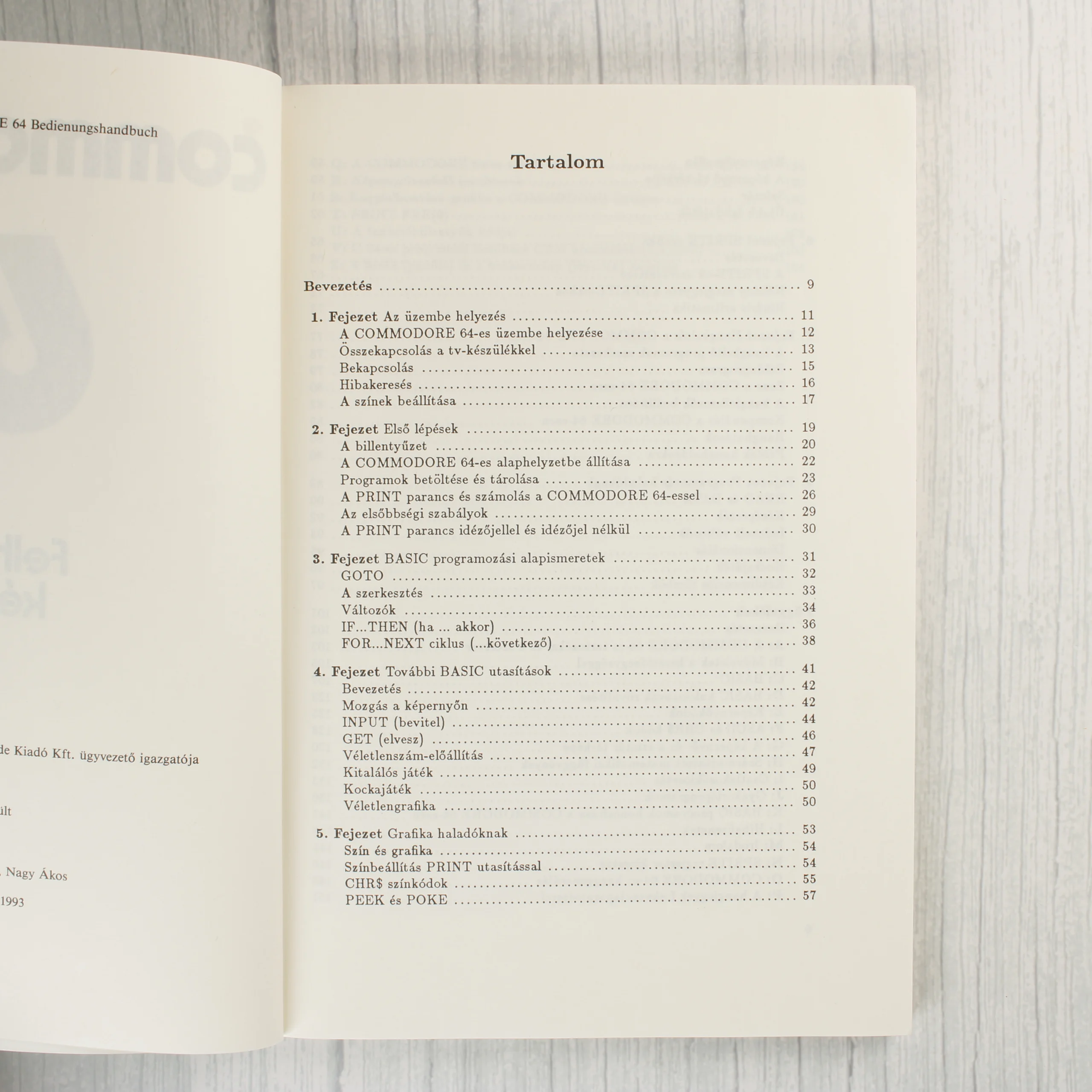 Eredeti magyar nyelvű Commodore 64 felhasználói kézikönyv a Novotrade gondozásában. Részletes útmutató a BASIC programozáshoz és a gép használatához.