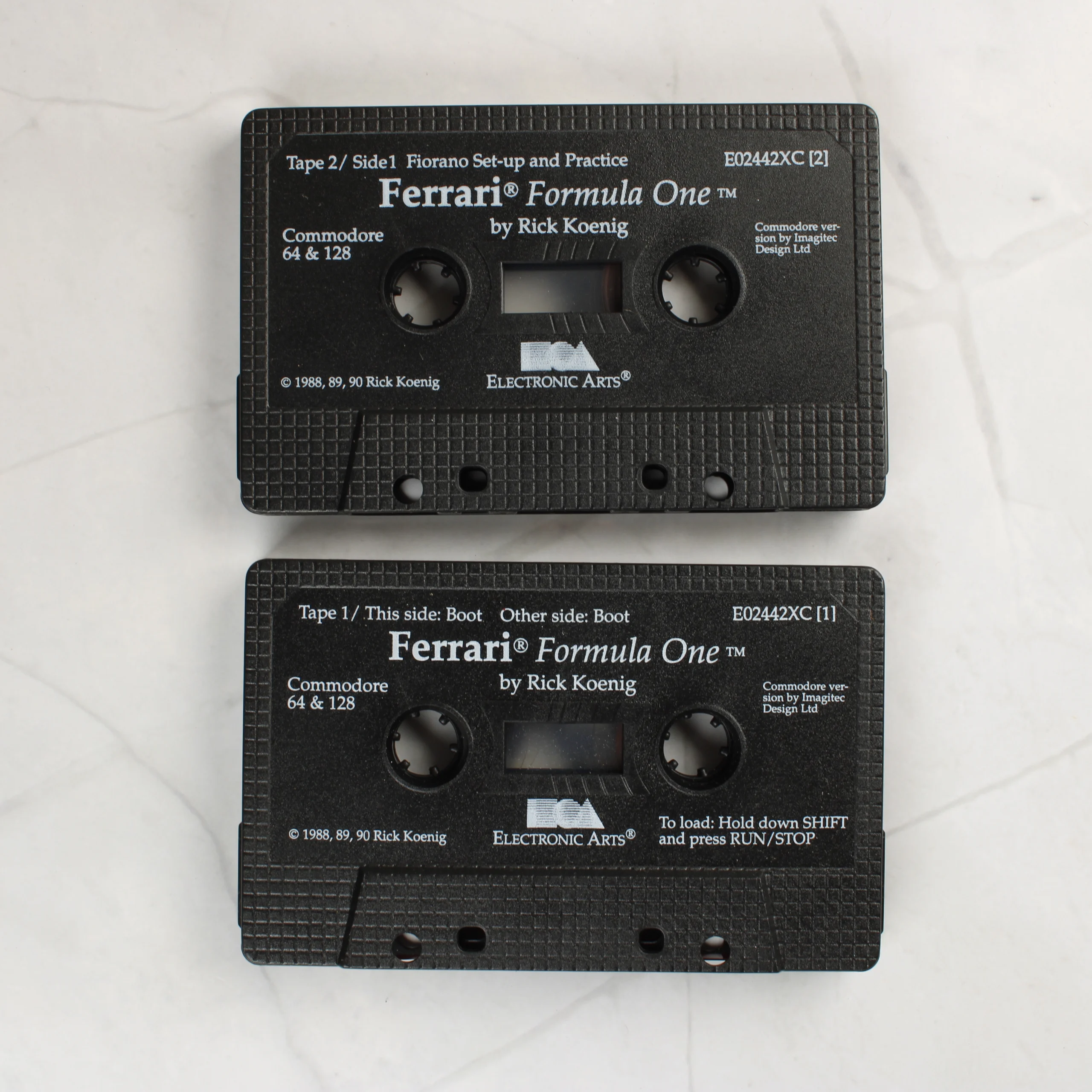 Ferrari Formula One videójáték Commodore 64 és 128 gépekhez. Kétkazettás kiadás az Electronic Arts-tól, Rick Koenig szimulátora.