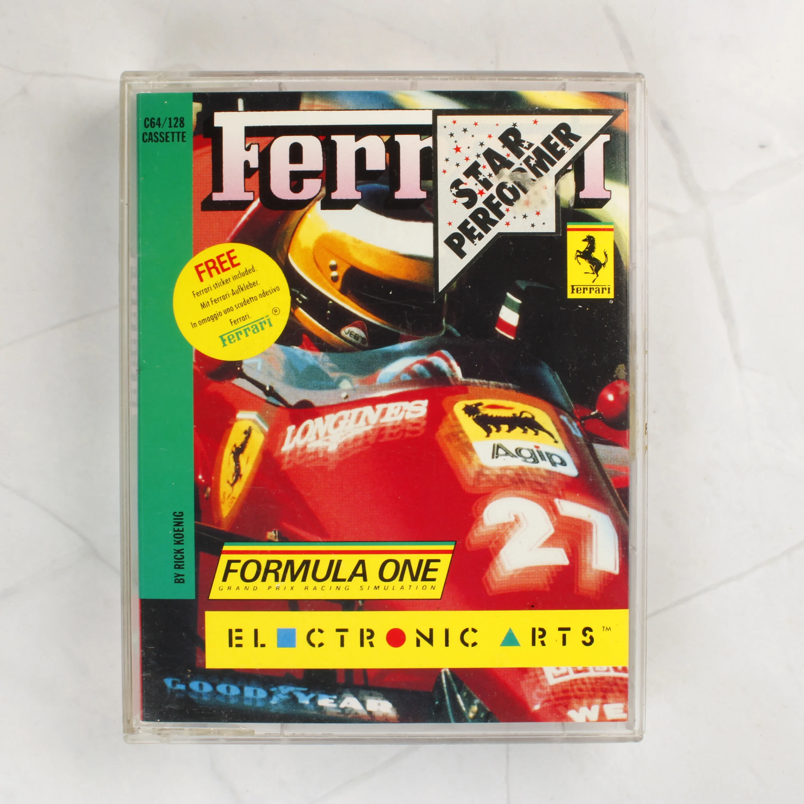 A Ferrari Formula One egy Commodore 64 és 128 rendszerekre megjelent videójáték, amelyet az Electronic Arts adott ki. A csomag két darab fekete színű mágnesszalagos kazettát tartalmaz, amelyek Rick Koenig szimulációs játékát hordozzák. A borítón egy piros Ferrari versenyautó látható a 27-es rajtszámmal, valamint a Star Performer sorozat logója és egy sárga matrica, amely ingyenes Ferrari matricát ígér. A műanyag tok átlátszó, a hátoldalán színes képernyőmentések és többnyelvű rövid leírások találhatók a játékmenetről. A kazettákon fehér felirattal szerepelnek a technikai adatok, a betöltési útmutató és a szerzői jogi információk. A termék az 1980-as évek végéről származik, és az eredeti korszakra jellemző grafikai elemeket vonultat fel.