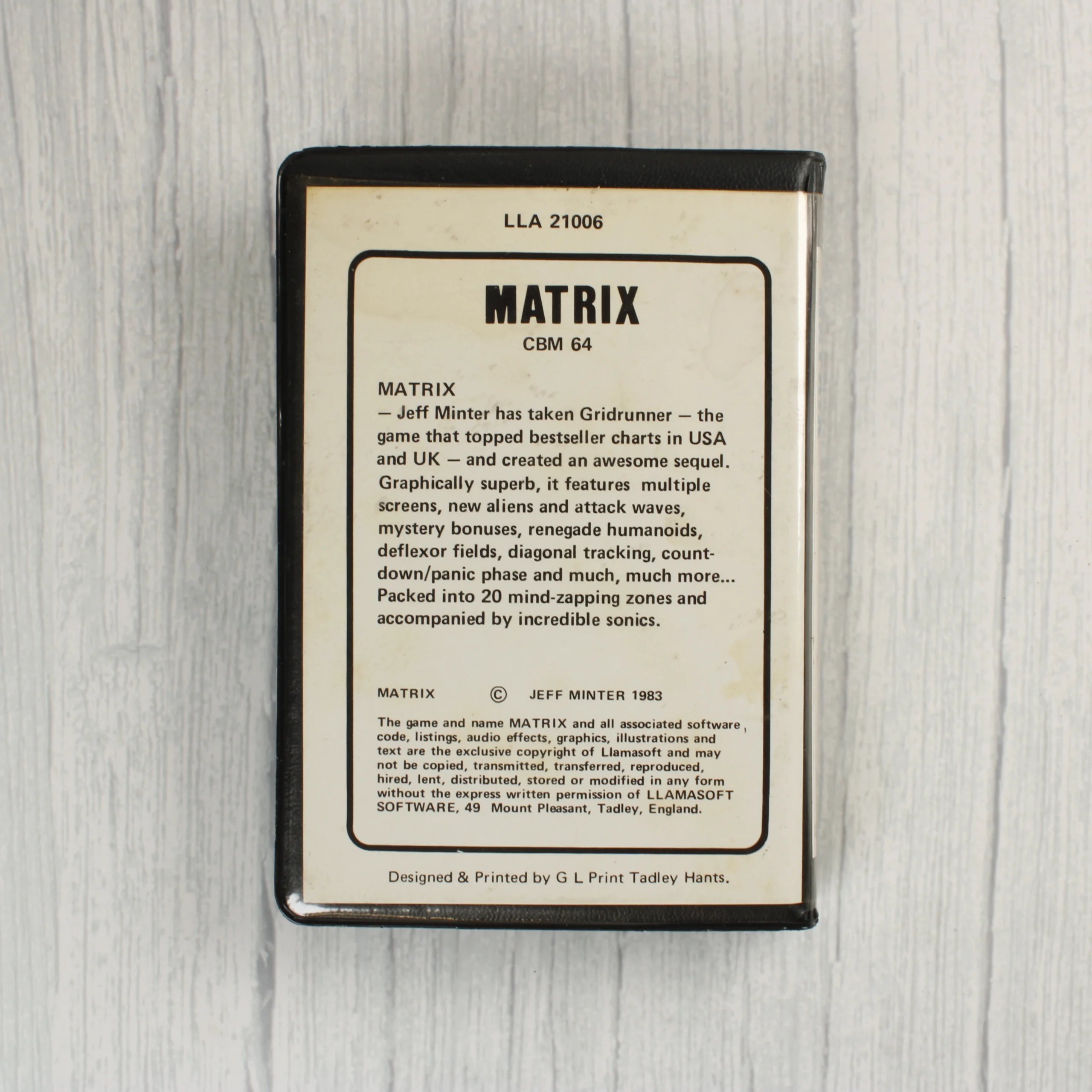 A Matrix című videójáték Commodore 64 platformra készült kiadása. A csomag egy fekete műanyag tokot tartalmaz, amelyben egy eredeti műsoros kazetta található. A borítón egy futurisztikus űrhajó látható sárga és barna háttér előtt, kék 'MATRIX' felirattal. A tok hátoldalán angol nyelvű leírás olvasható a játékról, valamint Jeff Minter neve és az 1983-as évszám szerepel. A kazetta fekete színű, fehér címkével, amelyen a Llamasoft Software logója és a játék címe látható. A borító elülső részén egy régi árcédula maradványa figyelhető meg.