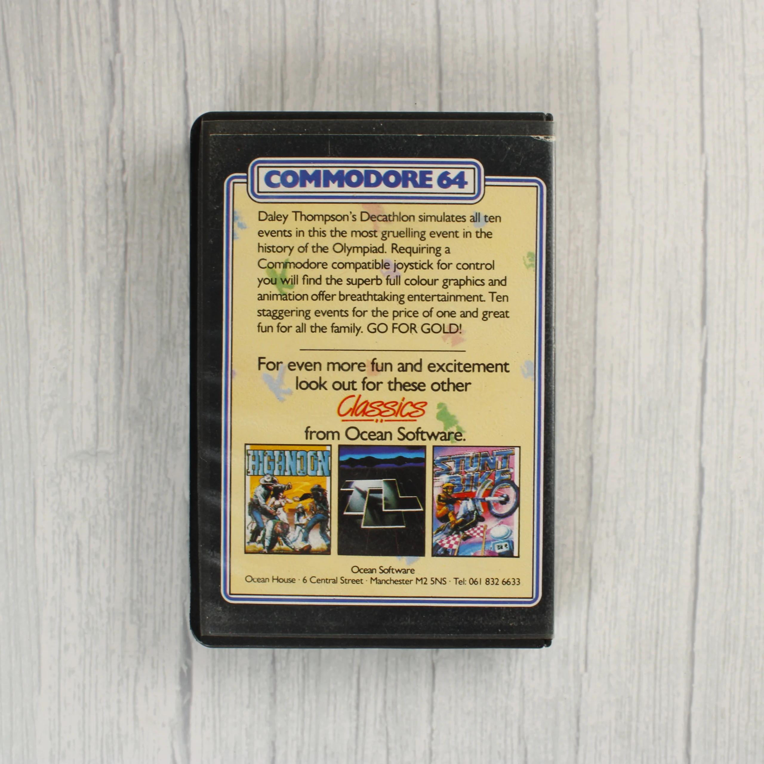 A Daley Thompson's Decathlon című videójáték Commodore 64 platformra készült kiadása. A csomag tartalmazza az eredeti fekete műanyag tokot a színes papírborítóval, valamint magát az adathordozó kazettát. A borítón Daley Thompson atléta látható verseny közben, az Ocean Software logójával és a Commodore 64 felirattal. A kazetta fekete színű, fehér alapú címkével, amelyen kék feliratok jelzik a játék címét és a kiadót. A hátoldali borító angol nyelvű leírást és más Ocean játékok hirdetéseit tartalmazza. A termék fizikai állapota a korának megfelelő, a műanyag tokon és a papírborítón kisebb használati nyomok láthatóak.