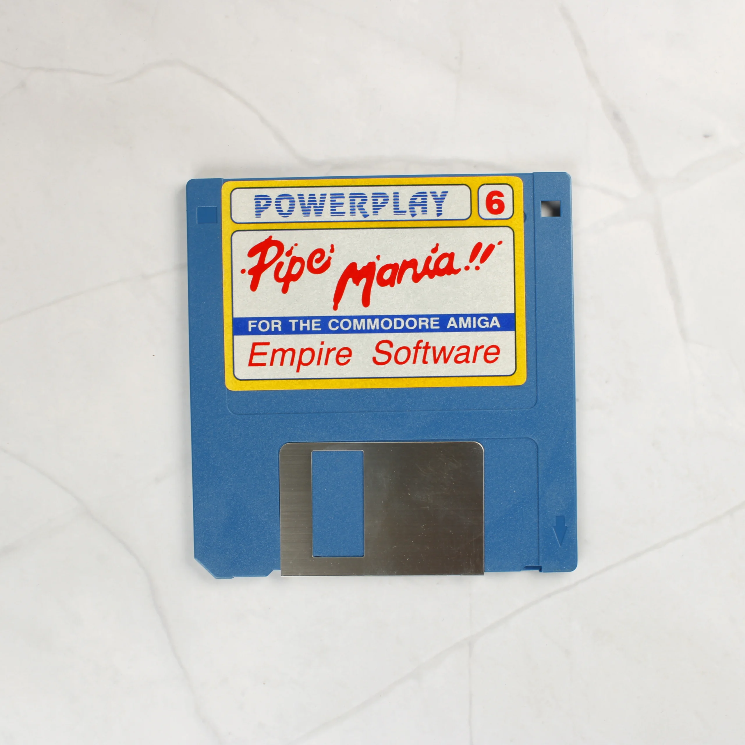 A Pipe Mania című videójáték Amiga platformra készült kiadása. A csomag egy kék színű, 3,5 colos floppy lemezt és egy átlátszó műanyag tokot tartalmaz. A tok előlapján színes illusztráció látható, amely egy csővezetékkel küzdő rajzfilmfigurát és egy kiabáló arcot ábrázol. A hátoldalon sárga alapon angol nyelvű leírás és egy képernyőkép látható a játékmenetről. A floppy lemezen fehér alapú címke található piros és kék feliratokkal, amelyen az Empire Software logója is szerepel. A termék az 1980-as évek végéről származó klasszikus logikai játék.