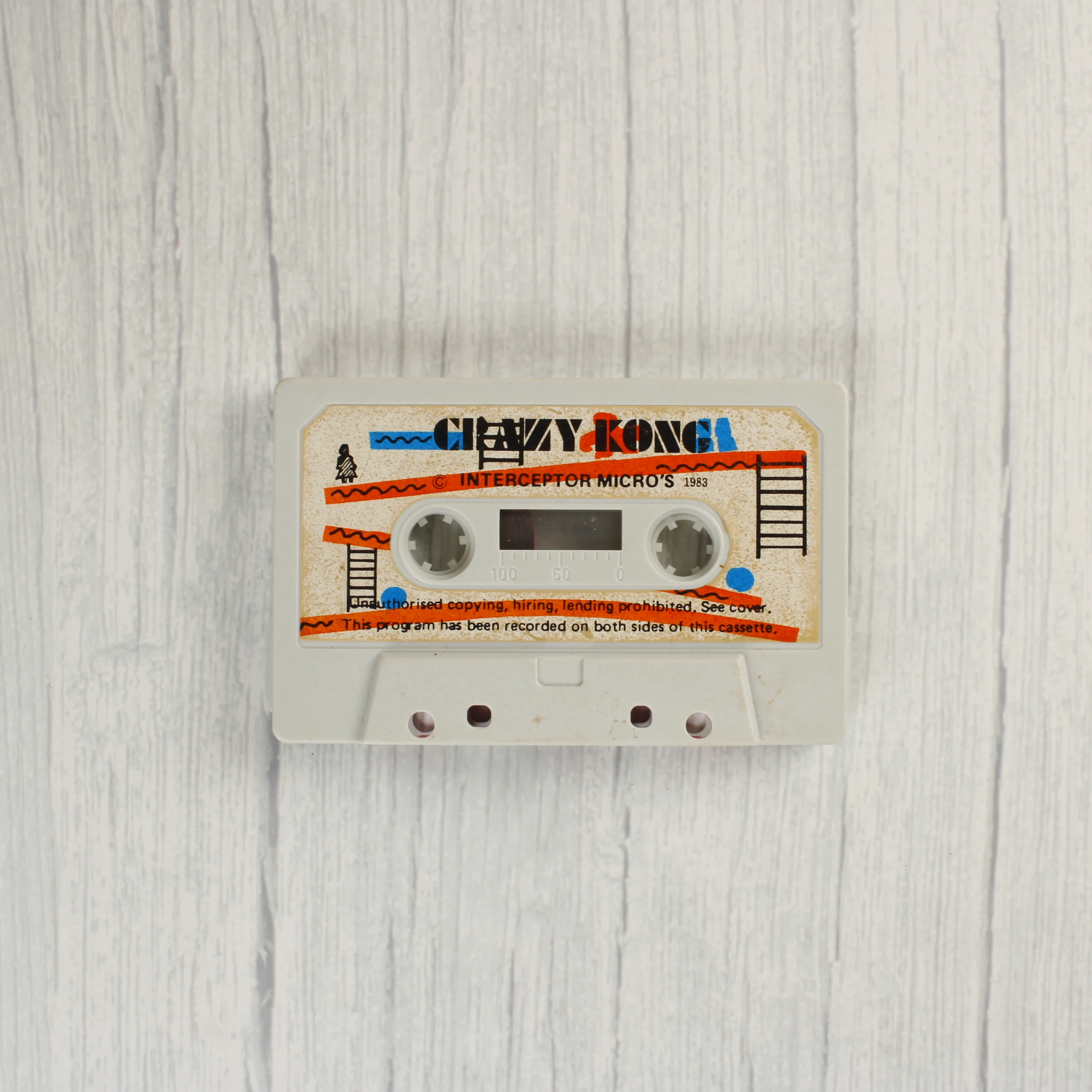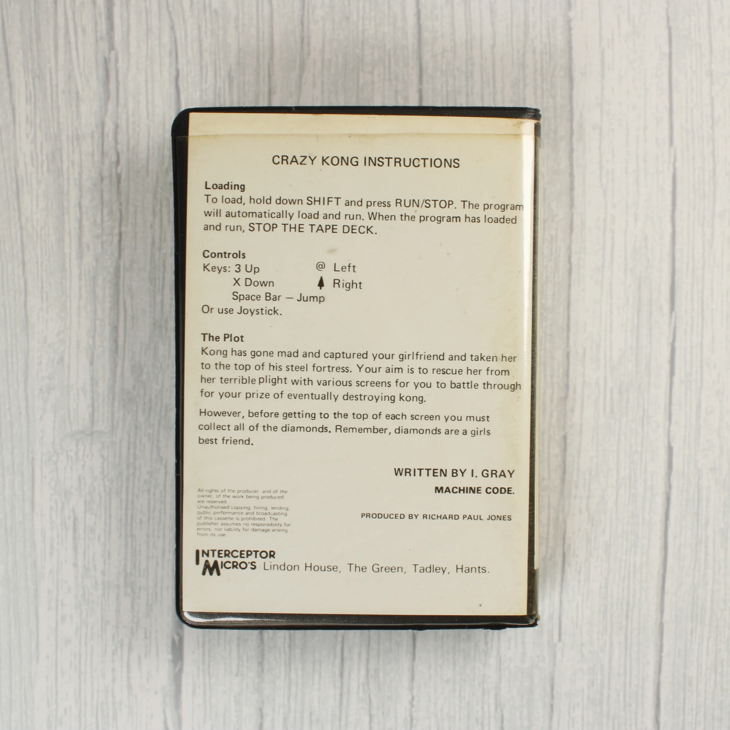 A Crazy Kong című videójáték Commodore 64 platformra készült kiadása. A csomag egy fekete műanyag tokot tartalmaz, amelyben egy színes illusztrációval ellátott papírborító található. Az előlapon egy dühös gorilla és egy menekülő alak látható, valamint egy régi árcédula. A hátoldalon angol nyelvű használati utasítás, betöltési segédlet és a játék rövid története olvasható. A készlet része egy világosszürke színű magnókazetta is, amelynek matricáján a játék címe, a kiadó neve és az 1983-as évszám szerepel. A kazetta matricája enyhén kopott és elszíneződött, a műanyag házon pedig használatból eredő apróbb nyomok látszanak.
