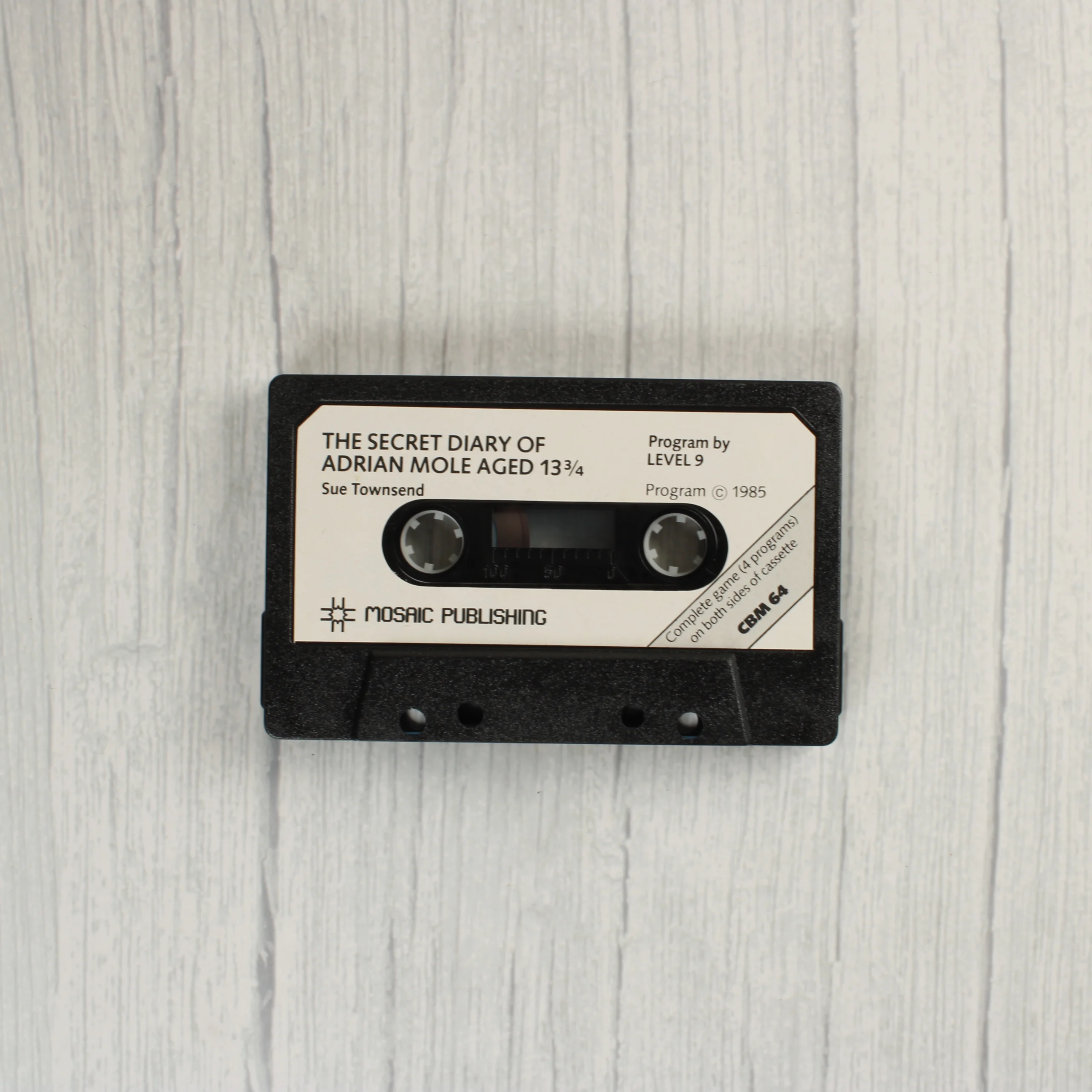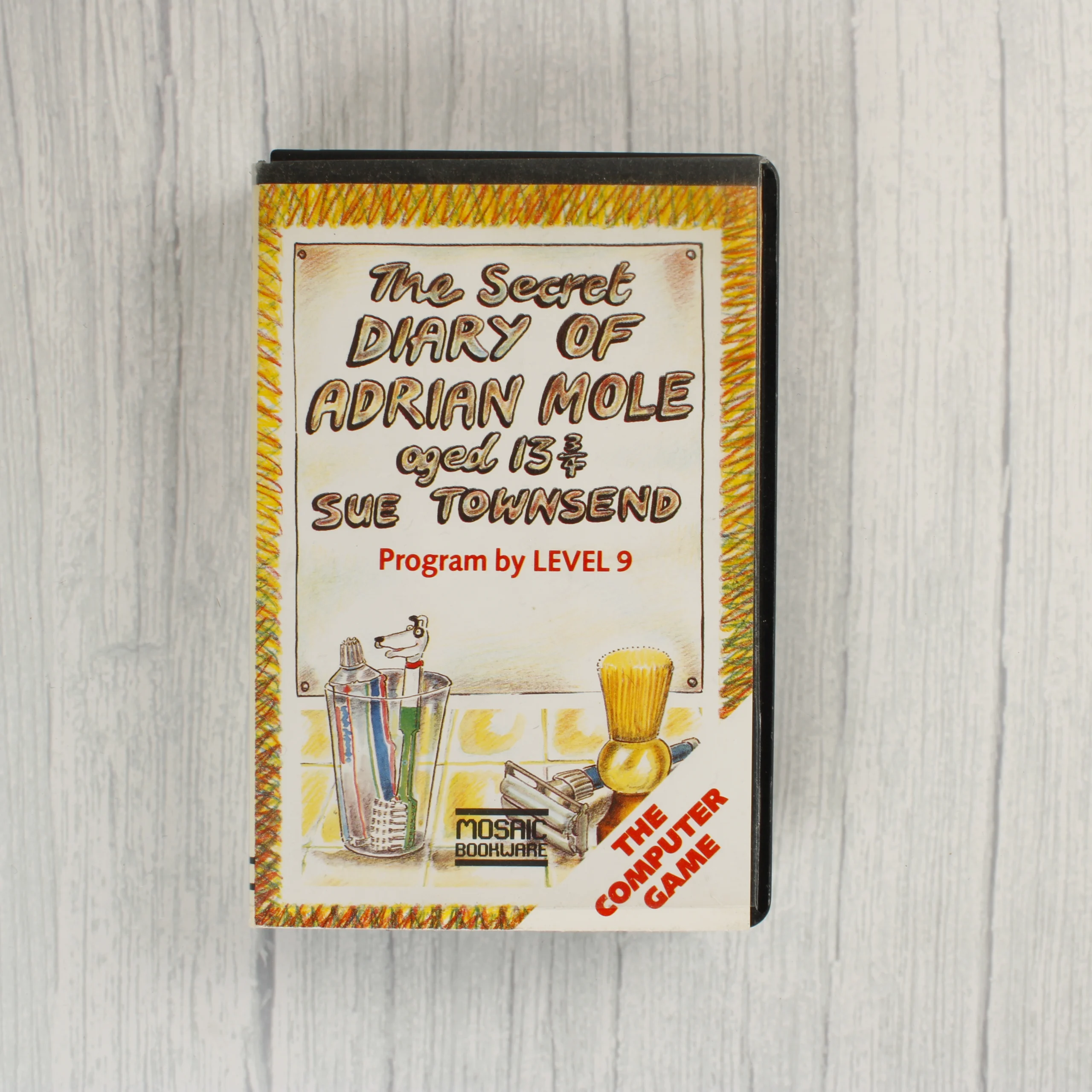 A The Secret Diary of Adrian Mole Aged 13 3/4 című videójáték Commodore 64 platformra készült kiadása. A csomag egy fekete műanyag tokot tartalmaz, amelyben egy illusztrált papírborító és egy fekete színű, fehér címkés kazetta található. A borító elején Sue Townsend neve, a Level 9 fejlesztőcsapat és a Mosaic Publishing logója látható, egy fürdőszobai eszközöket ábrázoló rajz kíséretében. A hátoldalon a játék leírása és két képernyőkép szerepel. A kazetta címkéjén olvasható a teljes cím, a szerző, a kiadó és a CBM 64 megjelölés. A termék fizikai állapota megkímélt, a papírborító élei épek, a kazetta felülete tiszta.