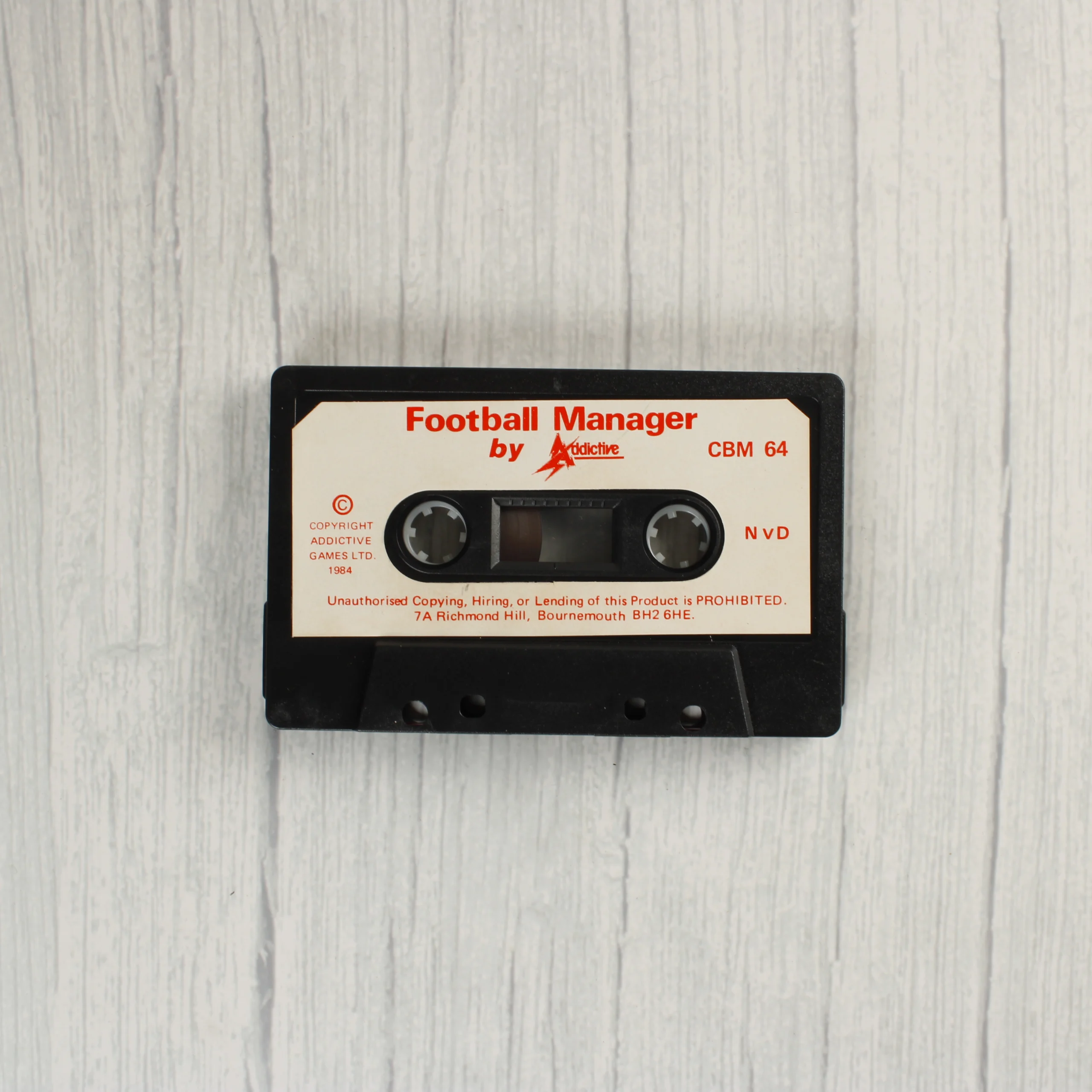 A Football Manager videójáték Commodore 64 platformra készült kiadása. A csomag egy fekete műanyag tokot tartalmaz, amelyben egy eredeti mágnesszalagos kazetta található. A borító kék alapszínű, rajta a játék címe, egy játékmenetet ábrázoló kép, valamint Kevin Toms tervező portréja látható. Az Addictive Games logója hangsúlyosan megjelenik a borítón és a kazetta címkéjén is. A hátoldalon a játék jellemzői, egy tabella és különböző sajtóvélemények olvashatók angol nyelven. A kazetta fekete házas, fehér papírcímkével, amelyen piros feliratok jelzik a címet és a kiadót.