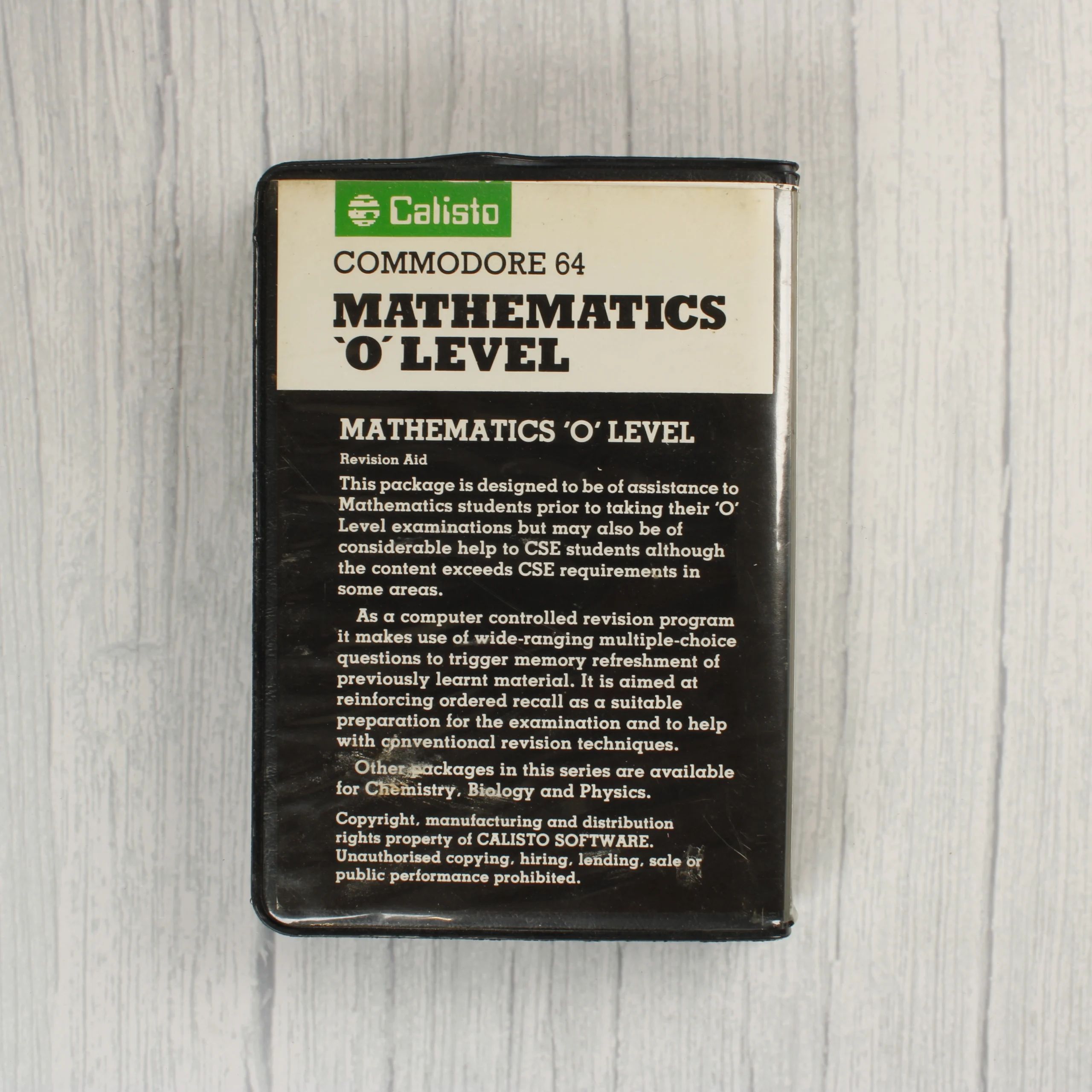 A Calisto Software által kiadott Mathematics 'O' Level egy oktatóprogram Commodore 64 számítógéphez. A csomag egy fekete műanyag tokból és egy mágnesszalagos kazettából áll. A tok előlapján színes, grafikus illusztráció látható számokkal és matematikai jelekkel, a felső részen pedig a Calisto logó és a program címe olvasható. A hátoldalon angol nyelvű leírás található a szoftver funkcióiról és a szerzői jogokról. A kazetta fekete műanyag házas, zöld színű papírcímkével, amelyen fehér betűkkel szerepel a gyártó és a program megnevezése. A termék korának megfelelő, használt állapotban van.