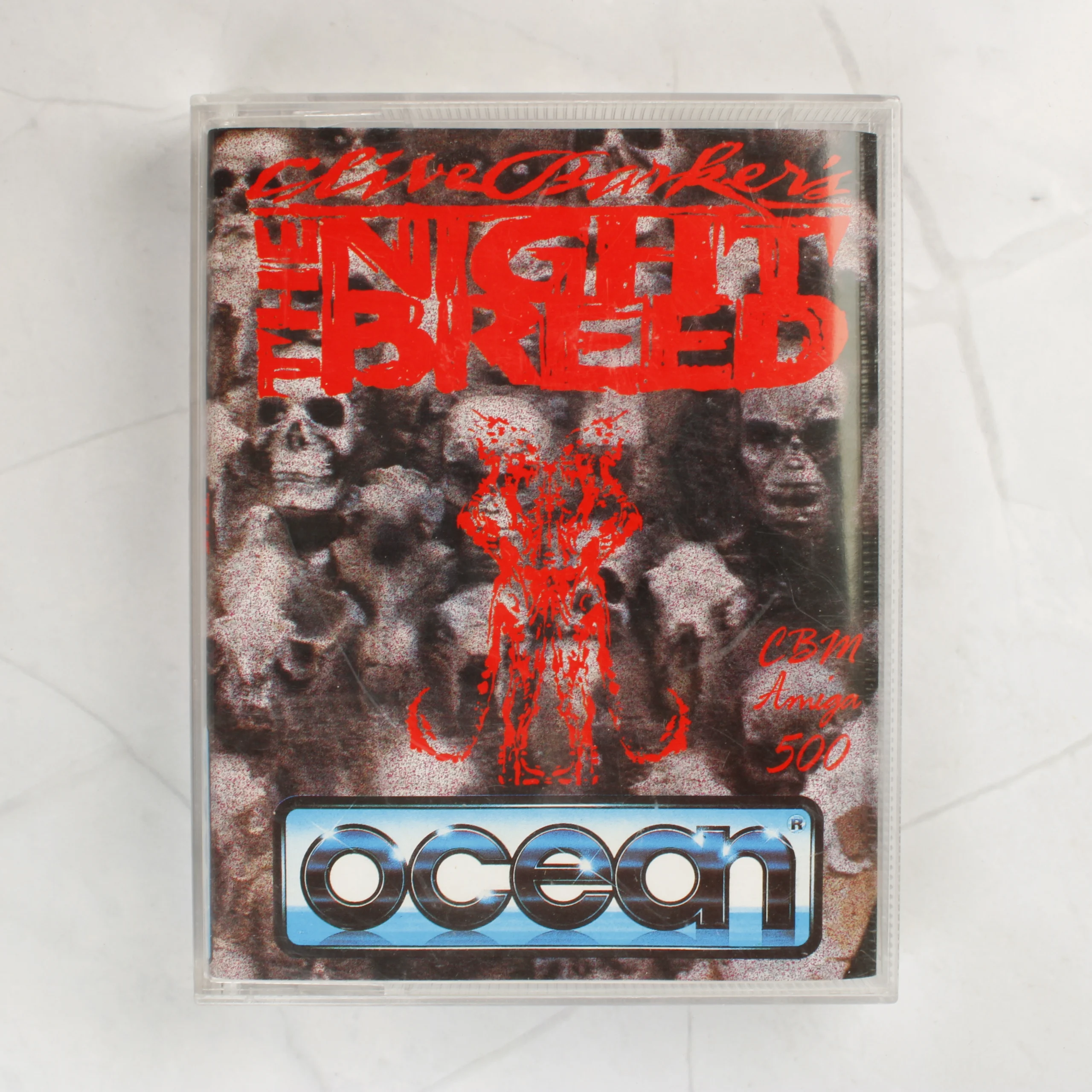 Clive Barker Nightbreed videójáték Commodore Amiga platformra. A csomag két darab kék színű, 3,5 colos floppy lemezt tartalmaz, amelyek az Ocean Software gondozásában jelentek meg 1990-ben. A lemezeken fehér felirat olvasható, amely jelzi, hogy a Screen Gems Amiga Pack részeként kerültek forgalomba. A játékhoz tartozik egy átlátszó műanyag tok, amelyben egy koponyákat ábrázoló, vörös feliratos borító található. A borítón jól látható az Ocean logó, valamint a CBM Amiga 500 jelzés. A fizikai adathordozók és a papírborító állapota korának megfelelő, a műanyag tokon apróbb felületi karcok és használati nyomok észlelhetők.