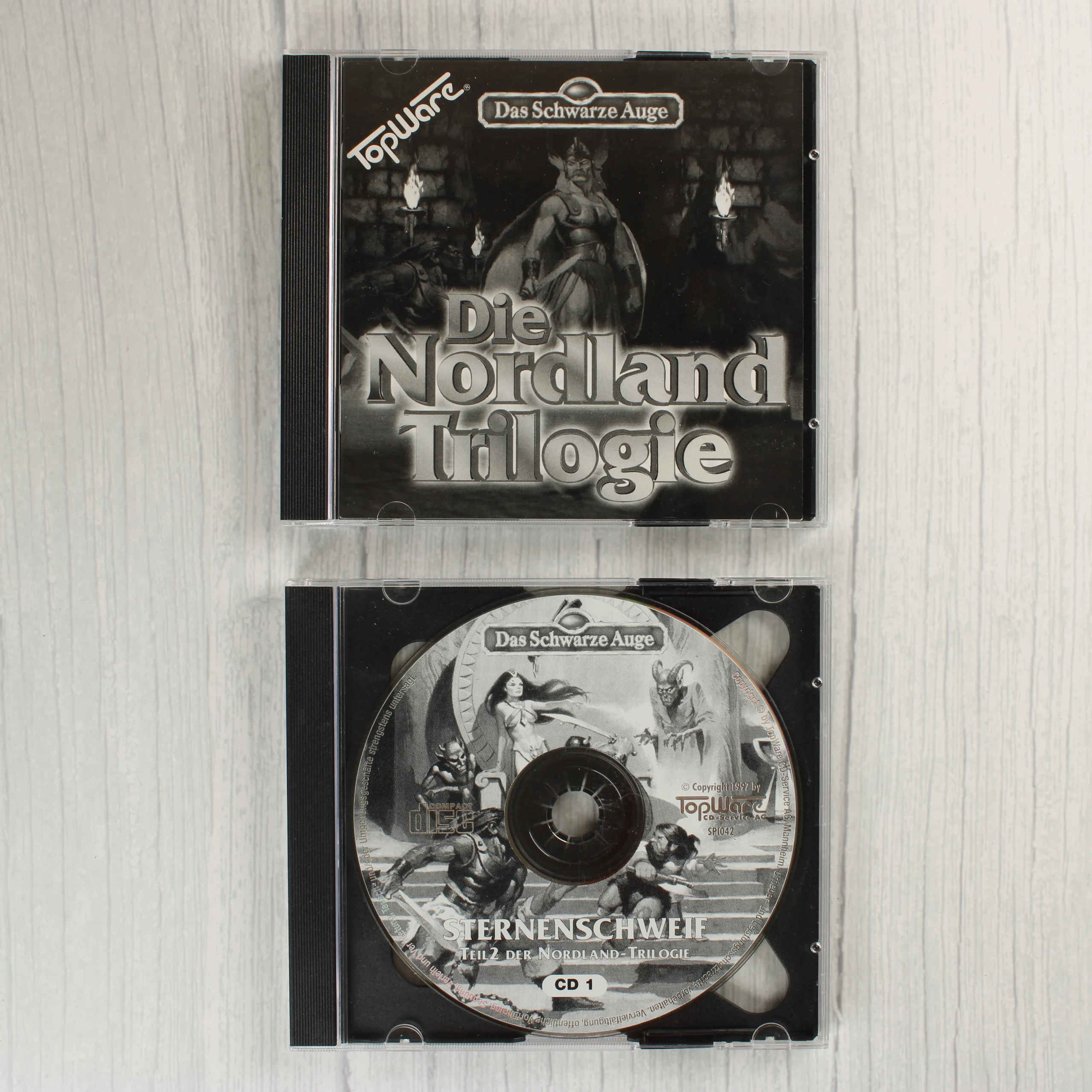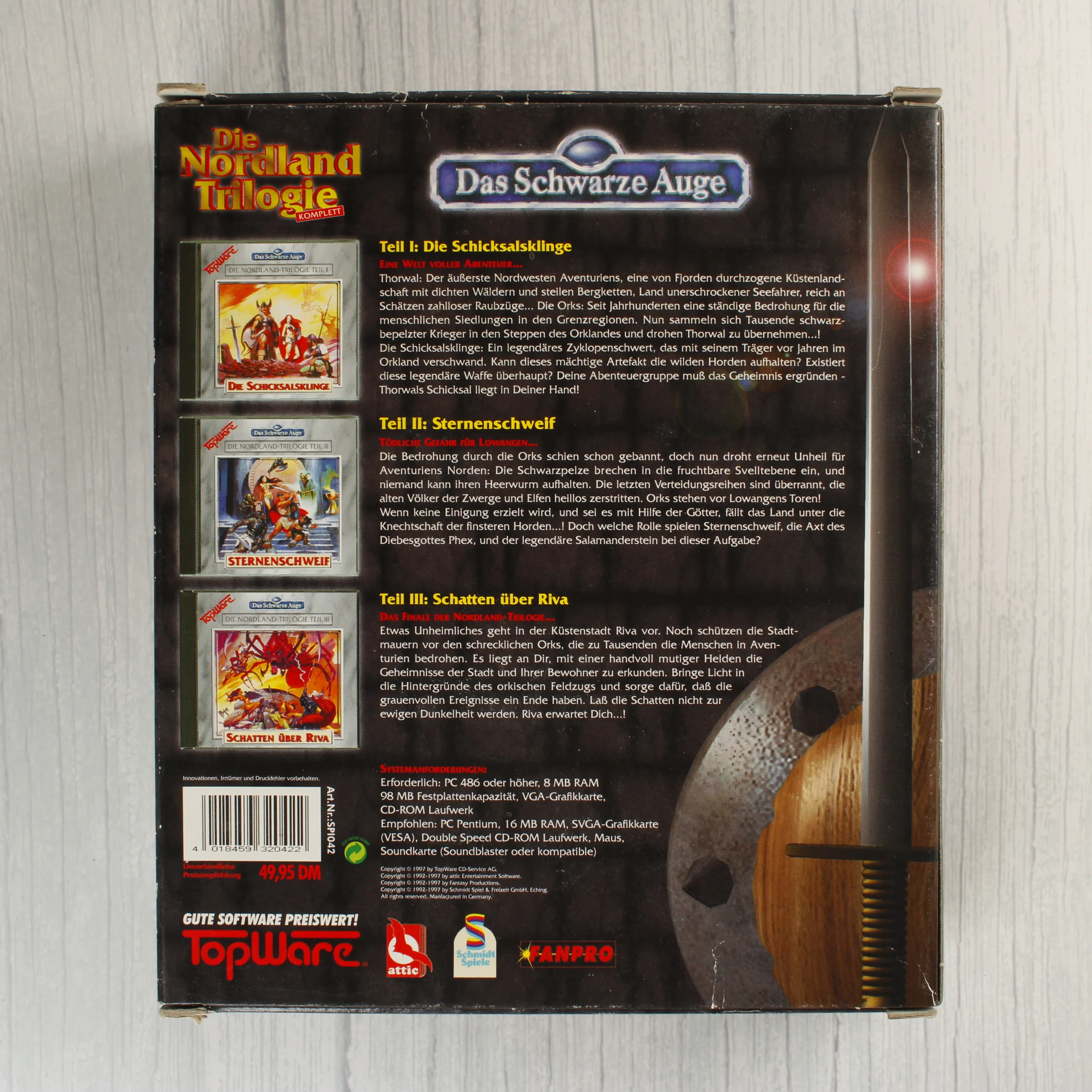 A Das Schwarze Auge: Die Nordland Trilogie Komplett egy német nyelvű PC-s videójáték-gyűjtemény, amely három klasszikus szerepjátékot tartalmaz: Die Schicksalsklinge, Sternenschweif és Schatten über Riva. A csomag egy nagyméretű kartondobozból, egy kiegészítő könyvből (Clue-Book) és több CD-ROM-ból áll, amelyek normál CD-tokokban kaptak helyet. A doboz grafikája színes, harcosokat és fáklyákkal megvilágított belső tereket ábrázol. A hátoldalon részletes német nyelvű leírás olvasható a játékokról és a rendszerkövetelményekről. A lemezek felülete fekete-fehér illusztrációkkal díszített. A csomag tartalmazza a TopWare kiadó logóját és a Schmidt Spiele emblémáját is. A kiadvány az 1990-es évek végéről származik.