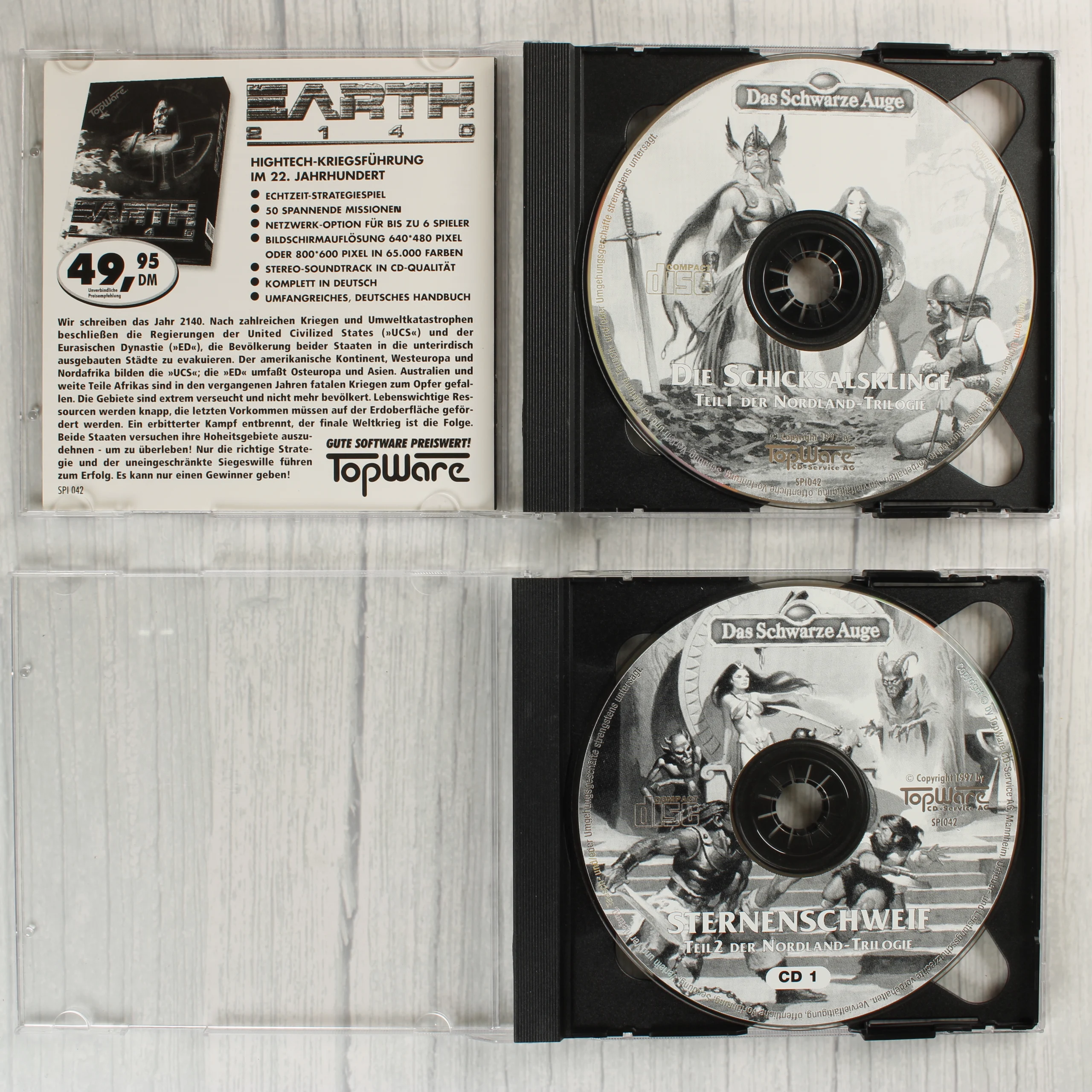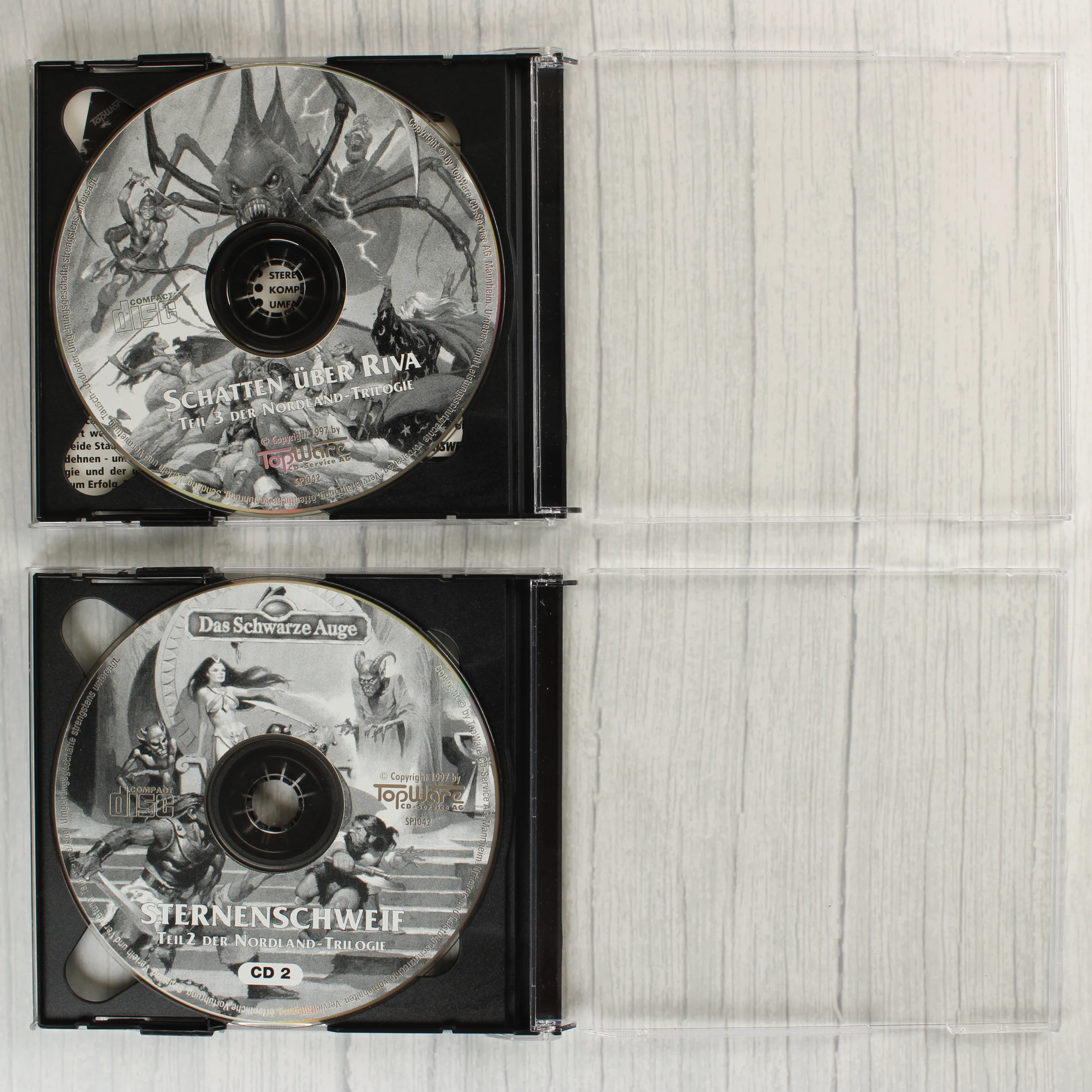Das Schwarze Auge: Die Nordland Trilogie Komplett német nyelvű PC videójáték-gyűjtemény kartondobozban, CD-ROM formátumban, Clue-Book kiegészítővel.