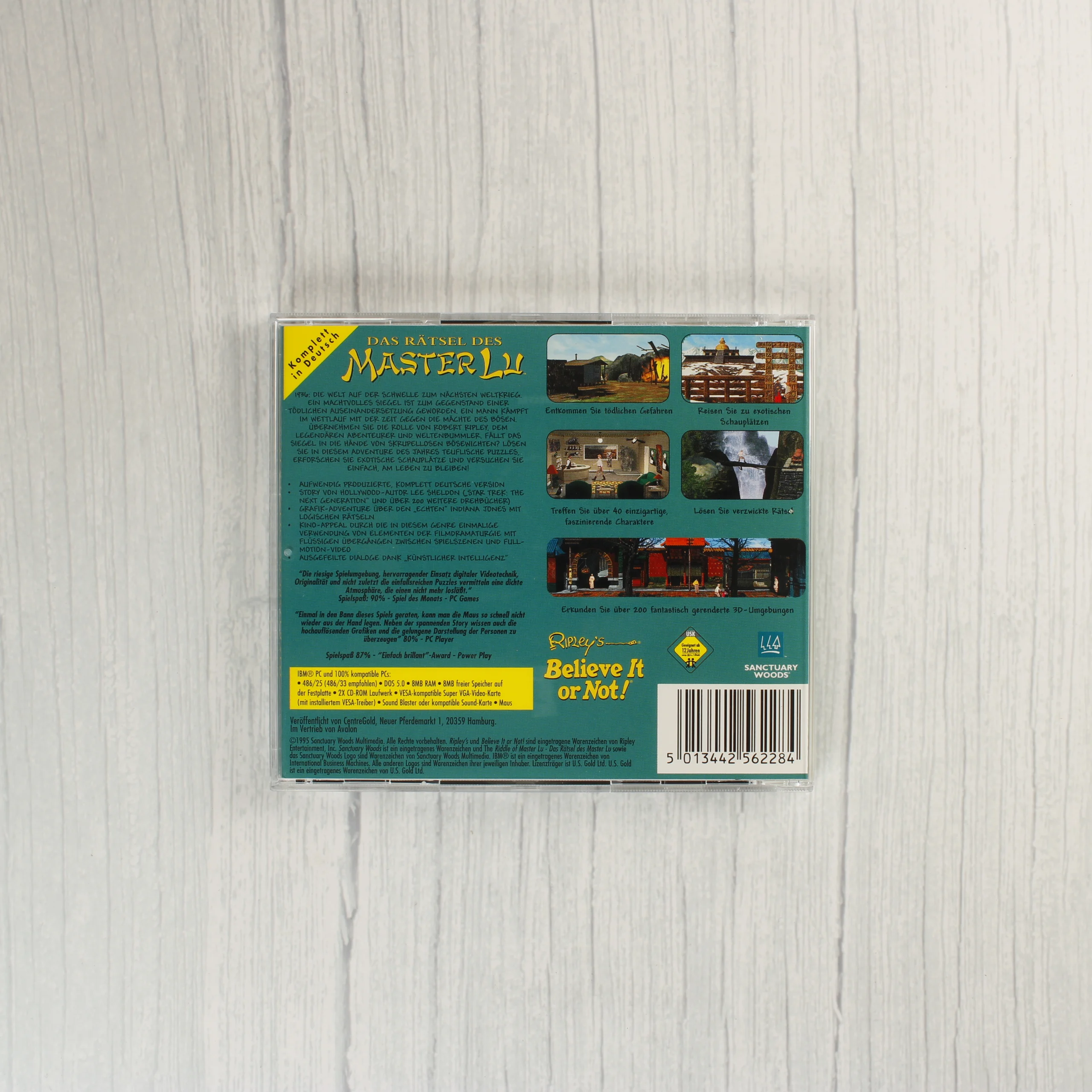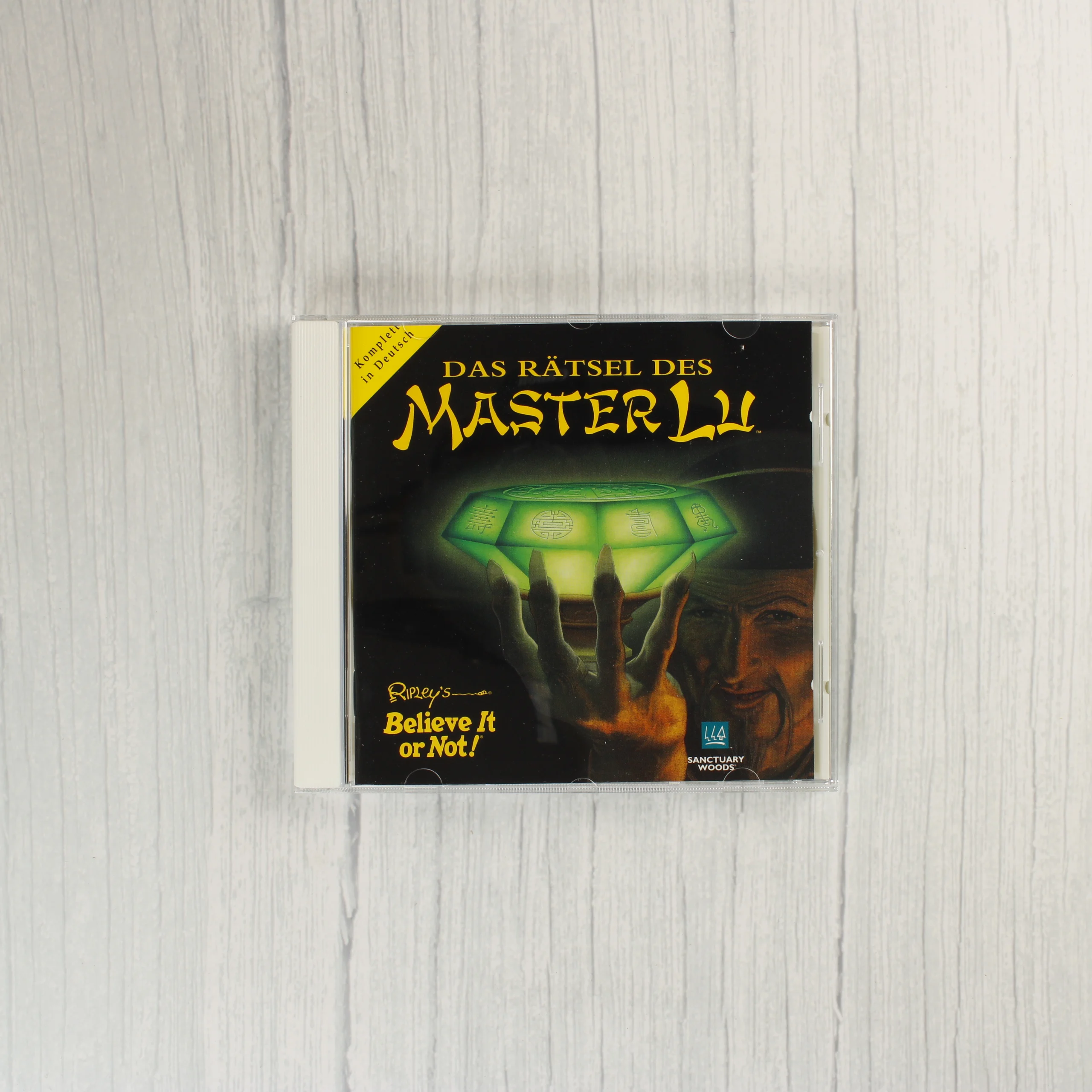 A Das Rätsel des Master Lu egy PC-re megjelent grafikus kalandjáték német nyelvű kiadása. A csomag tartalmazza az eredeti kartondobozt, egy fehér műanyag tokos CD-t és egy többnyelvű használati útmutatót. A doboz elején Robert Ripley látható, amint egy világító zöld ereklyét tart a kezében. A hátoldalon játékmenet-képernyőképek és német nyelvű leírás olvasható a történetről és a technikai jellemzőkről. A CD-ROM felülete piros alapszínű, fekete és fehér feliratokkal. A kiadvány a Sanctuary Woods és a CentreGold gondozásában jelent meg 1995-ben. A doboz sarkain és élein kisebb kopások láthatóak, de a készlet hiánytalannak tűnik.
