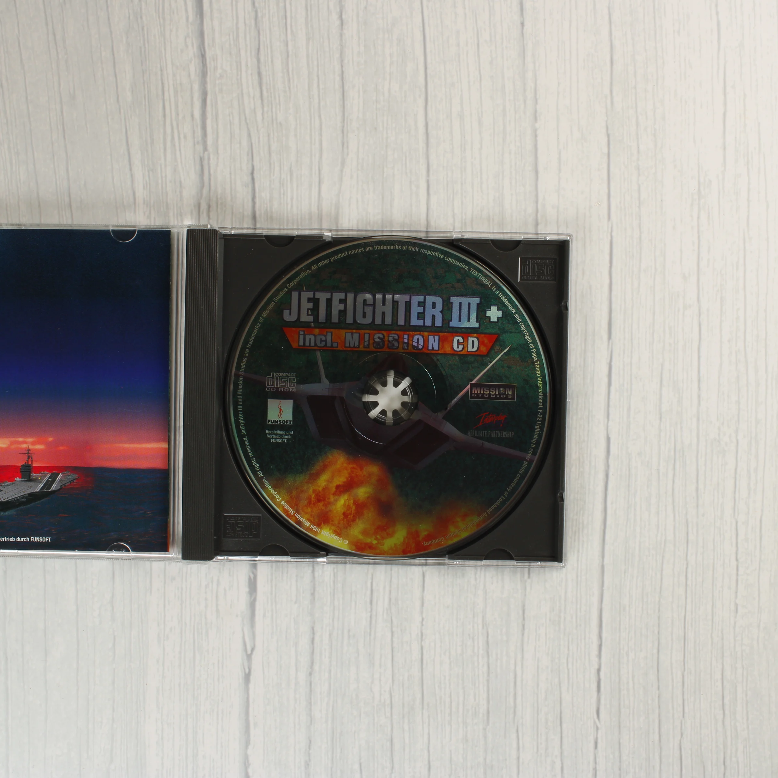 A Jetfighter III + incl. Mission CD egy PC-re megjelent harci repülőgép-szimulátor német nyelvű kiadása. A csomag egy nagyméretű kartondobozt tartalmaz, amelyben egy normál CD-tokban elhelyezett szoftver, egy részletes német nyelvű használati útmutató (Spielanleitung), egy hardver- és kiegészítő katalógus, valamint egy kiegészítő füzet található. A doboz elején egy F-22-es vadászgép látható akció közben, a hátoldalon pedig játékmenet-felvételek és technikai leírások szerepelnek. A kiadvány a Mission Studios és a Funsoft gondozásában jelent meg, Windows 95 operációs rendszerhez optimalizálva. A készlet hiánytalannak tűnik, tartalmazza az eredeti CD-ROM lemezt is.