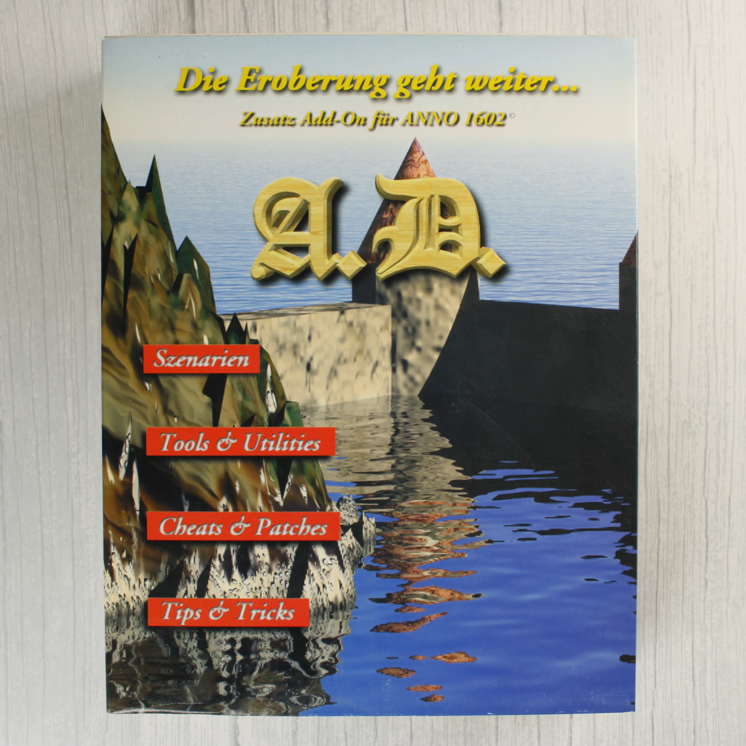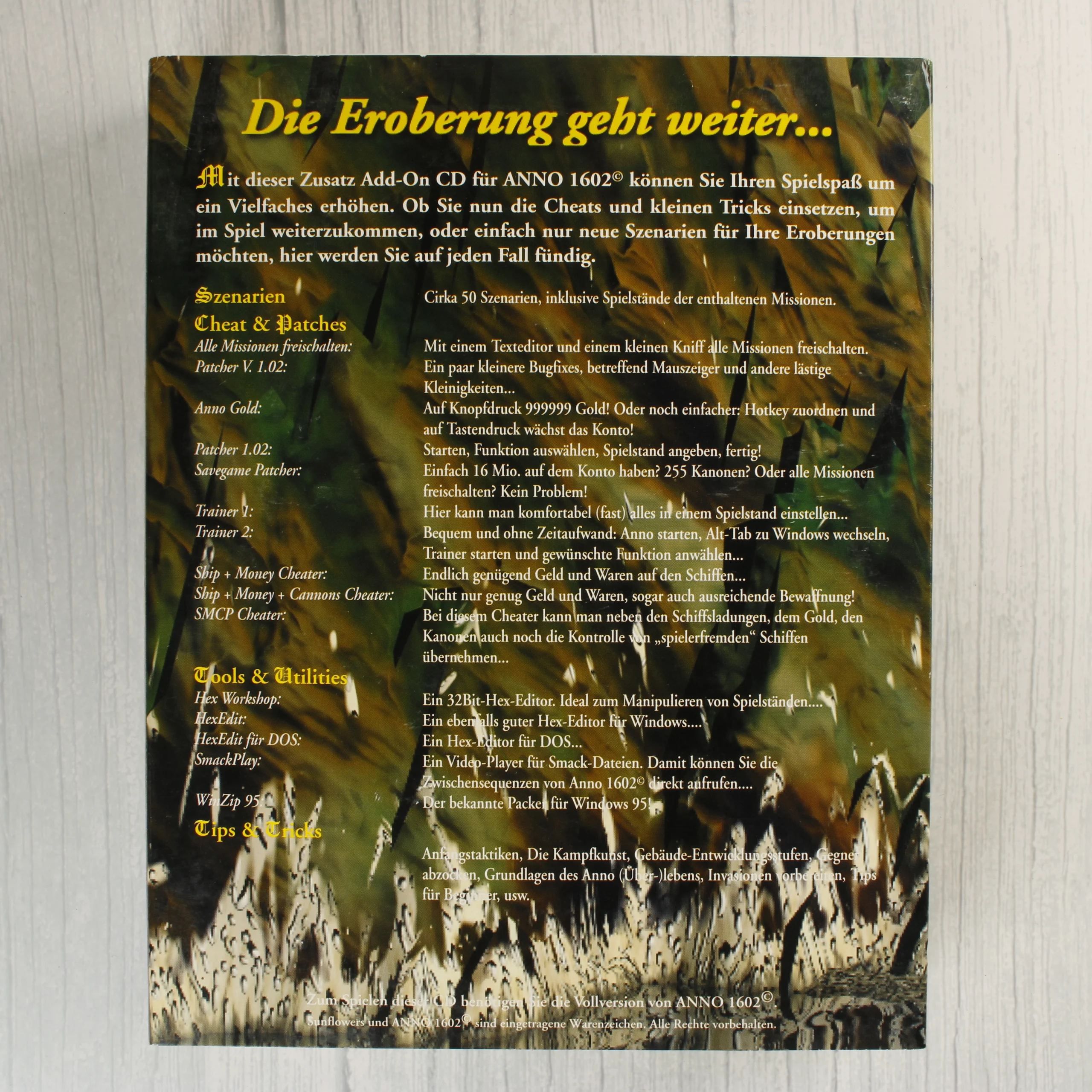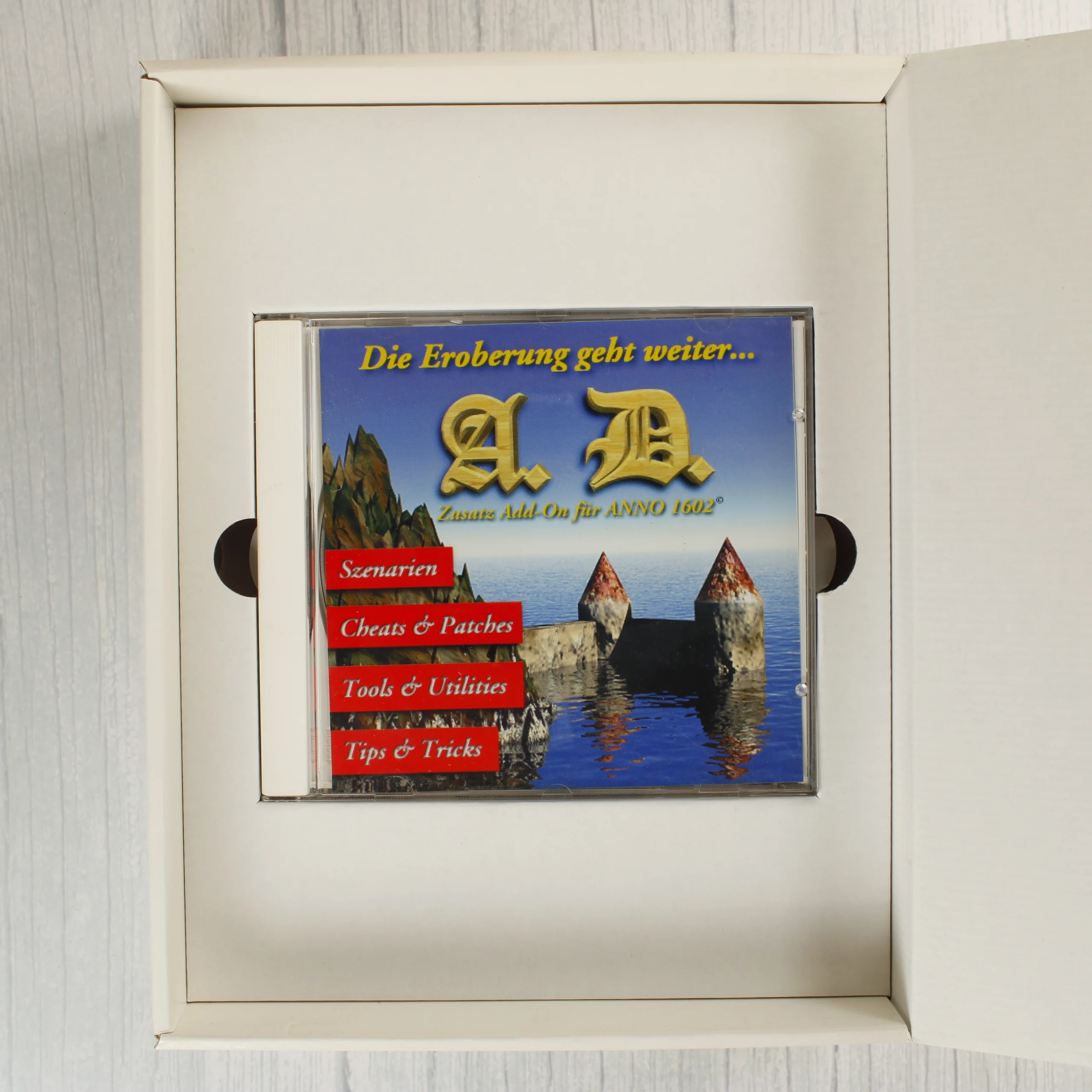 Ez a termék az Anno 1602 videójátékhoz készült német nyelvű kiegészítő csomag, amely egy nagyméretű kartondobozban érkezik. A csomag tartalmaz egy normál CD-tokot, benne a szoftvert tartalmazó CD-vel és egy rövid telepítési útmutatóval. A borítón egy tengerparti erődítmény látható, a kiegészítő címe pedig aranyszínű betűkkel van feltüntetve. A hátoldali leírás alapján a lemez forgatókönyveket, segédprogramokat, javításokat és tippeket tartalmaz a játékhoz. A külső kartondoboz élei mentén enyhe kopás látható, de szerkezetileg ép. A belső műanyag tok tiszta, karcmentesnek tűnik, a CD felülete pedig megkímélt állapotú.