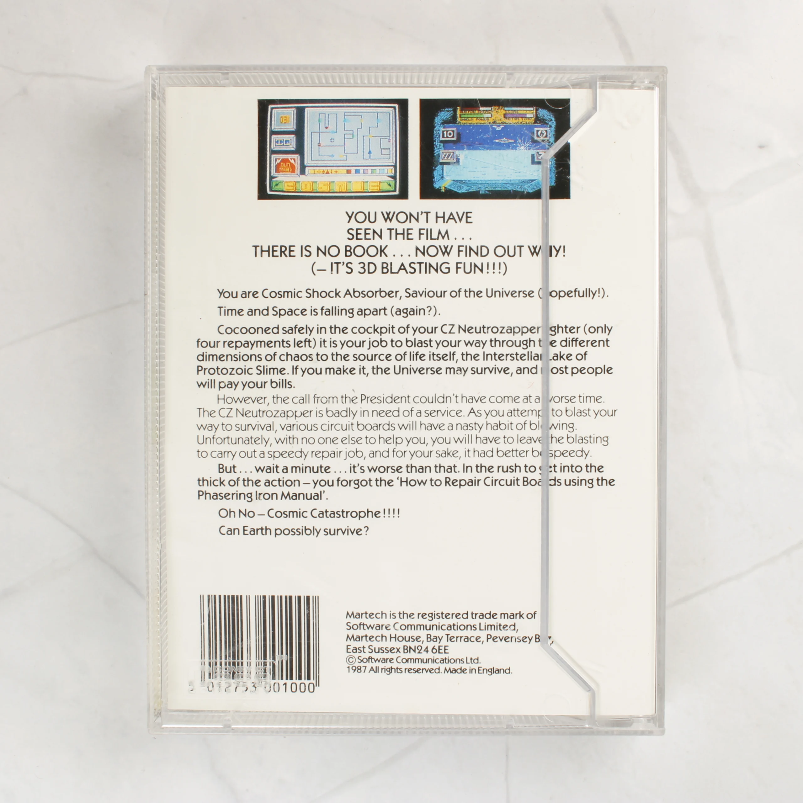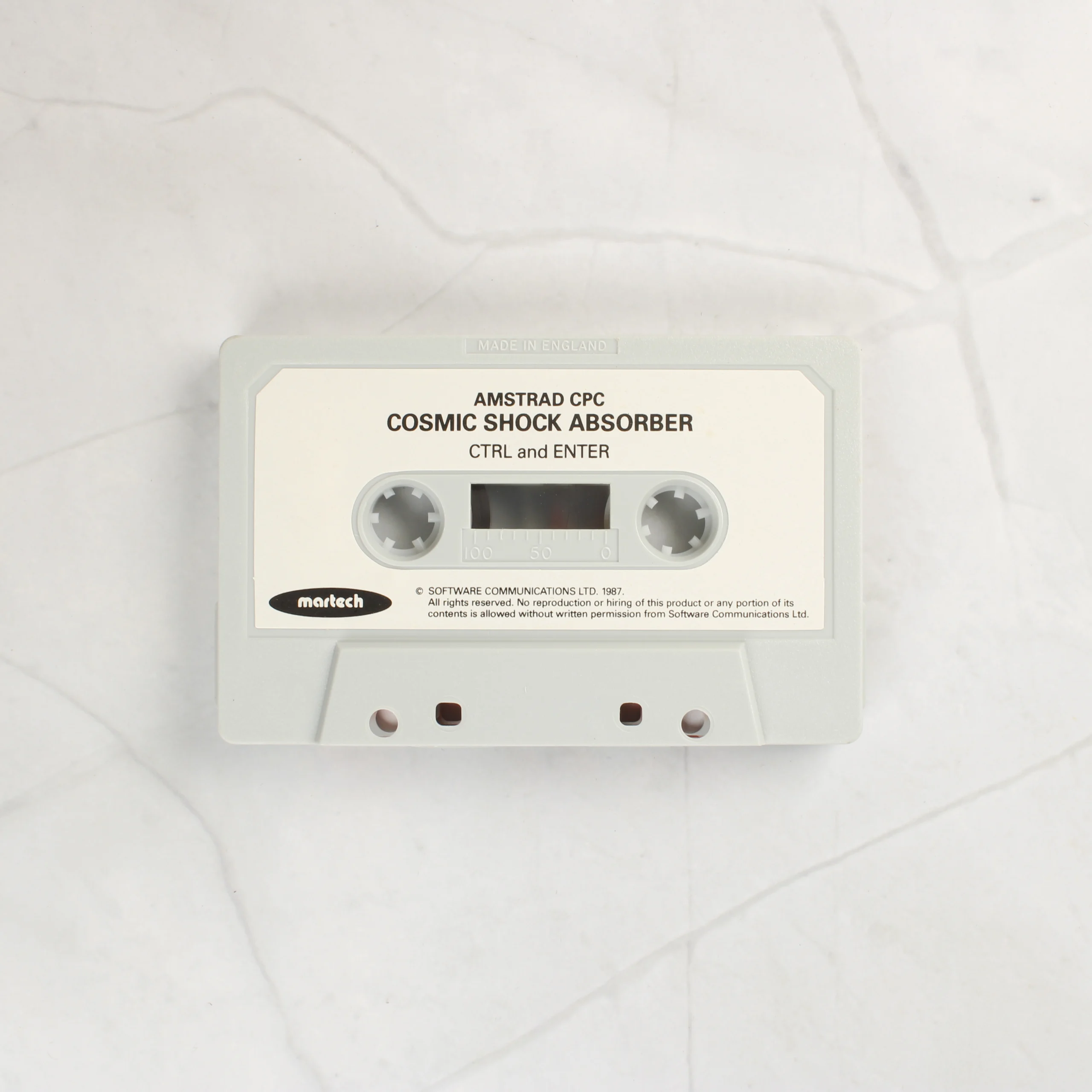 A Cosmic Shock Absorber egy Amstrad CPC platformra megjelent videójáték, amely kazetta formátumban került forgalomba. A termék egy átlátszó műanyag tokban található, amelyben egy színes, illusztrált papírborító kapott helyet. Az előlapon egy sci-fi stílusú grafika látható, amely egy űrhajóst és különféle idegen lényeket ábrázol sárga, lila és kék színek dominanciájával. A borító hátoldalán angol nyelvű leírás és két képernyőkép látható a játékmenetből. A csomag tartalmazza az eredeti, szürke színű műanyag kazettát is, amelyen fehér címke jelzi a játék címét, a Martech márkajelzést és a gyártási adatokat. A kazetta felirata szerint a szoftver az Amstrad 464, 664 és 6128 modellekkel kompatibilis. A kiadvány 1987-es évszámmal van ellátva, és Angliában készült.