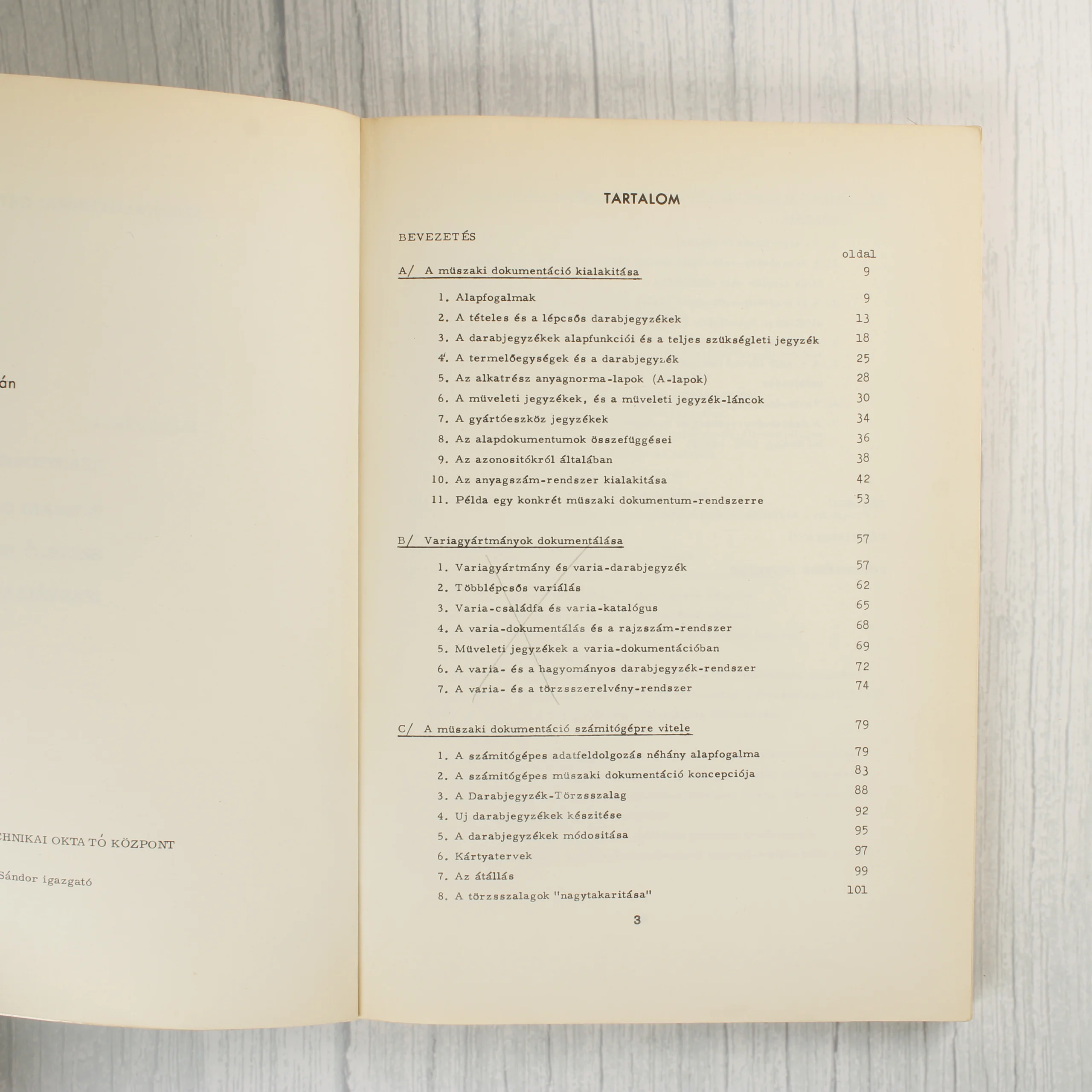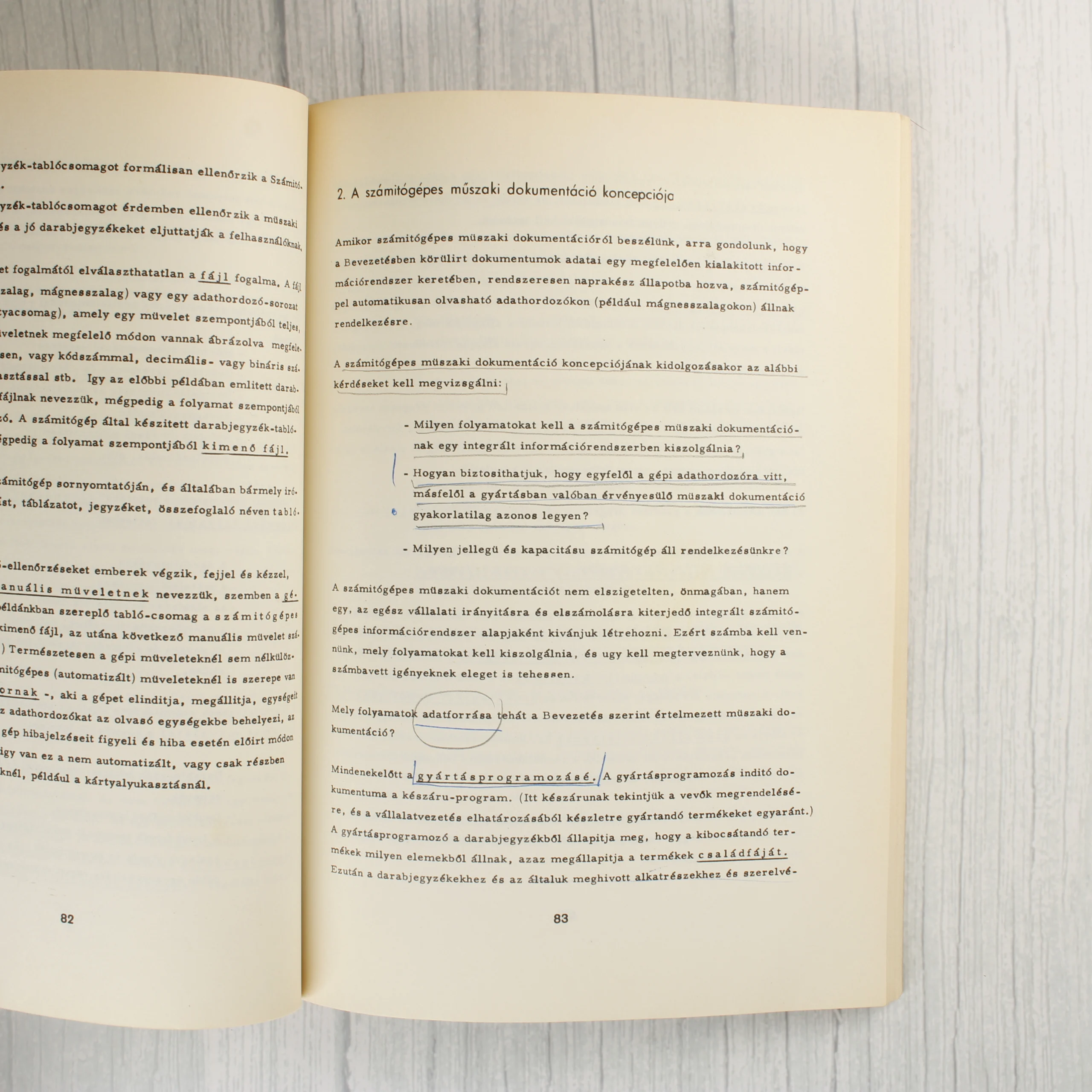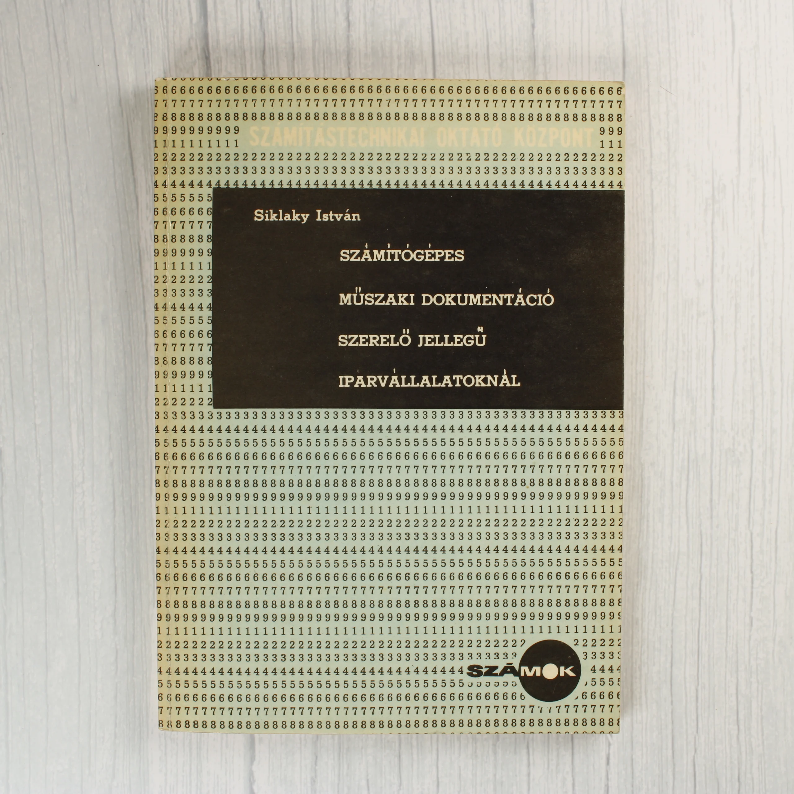 Siklaky István Számítógépes műszaki dokumentáció szerelő jellegű iparvállalatoknál című szakkönyve. A kiadvány a Számítástechnikai Oktató Központ (SZÁMOK) gondozásában jelent meg. A borító sárgás alapszínű, amelyet sűrűn nyomtatott számsorok díszítenek, a közepén pedig egy fekete téglalapban fehér betűkkel olvasható a szerző és a cím. A könyv belső oldalai enyhén sárgultak, a tartalomjegyzék és a szöveges részek jól olvashatók. A 83. oldalon kék tollal történő aláhúzások és jelölések láthatók, ami a korábbi használat nyoma. A kötés ragasztott, a sarkok és élek minimálisan kopottak.