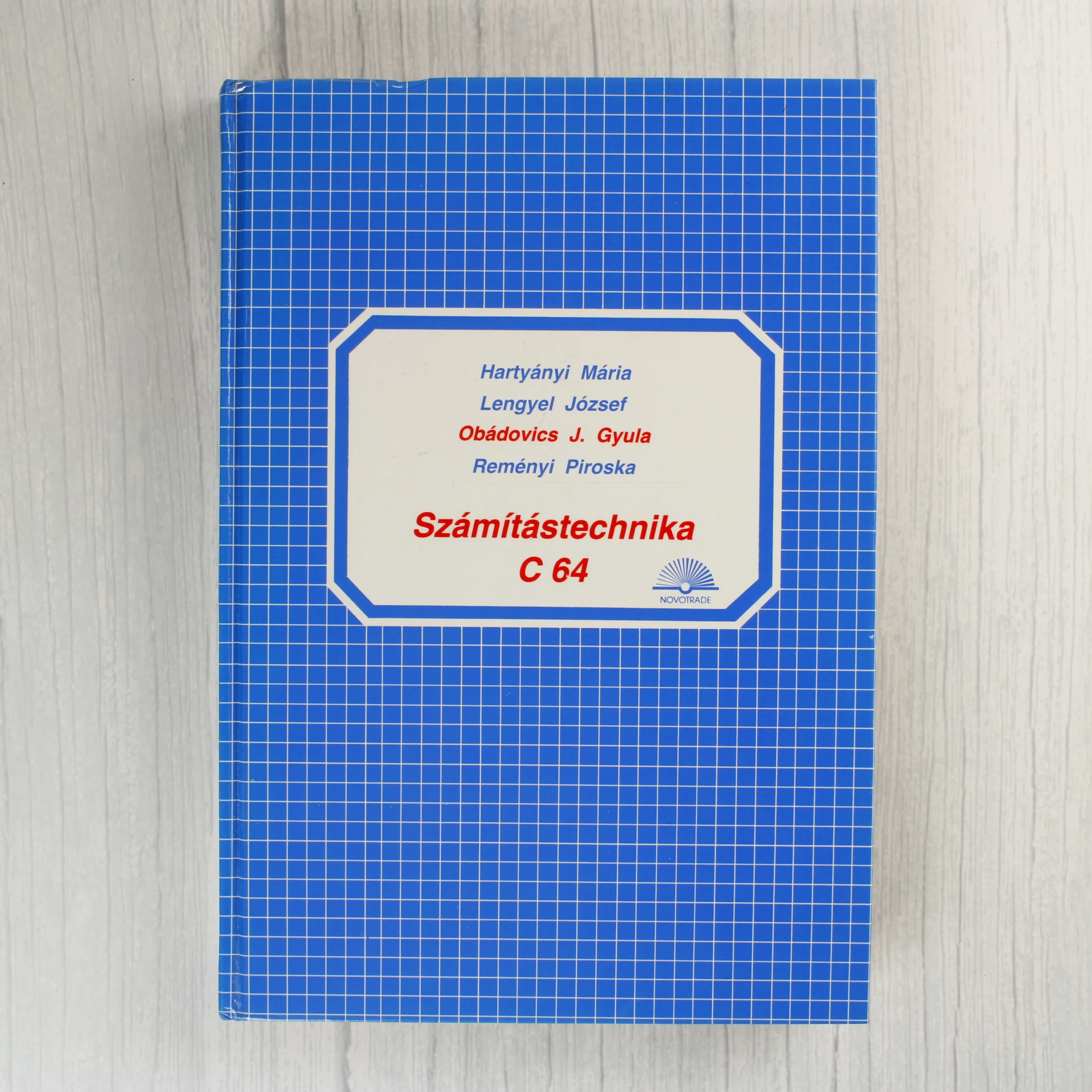 A Számítástechnika C 64 című szakkönyv keménytáblás borítóval rendelkezik, amely kék alapon fehér négyzethálós mintázatot mutat. A borító közepén fehér keretben olvashatók a szerzők nevei: Hartyányi Mária, Lengyel József, Obádovics J. Gyula és Reményi Piroska, valamint a cím és a Novotrade logója. A belső oldalak enyhén sárgultak, ami a papír korára utal. A könyv a Commodore 64 programozását mutatja be a BASIC nyelvtől a gépi kódig. A szöveg jól olvasható, fekete betűkkel nyomtatott, ábrákat és programkód-részleteket is tartalmaz. A kötés épnek tűnik, a sarkokon minimális kopás látható.