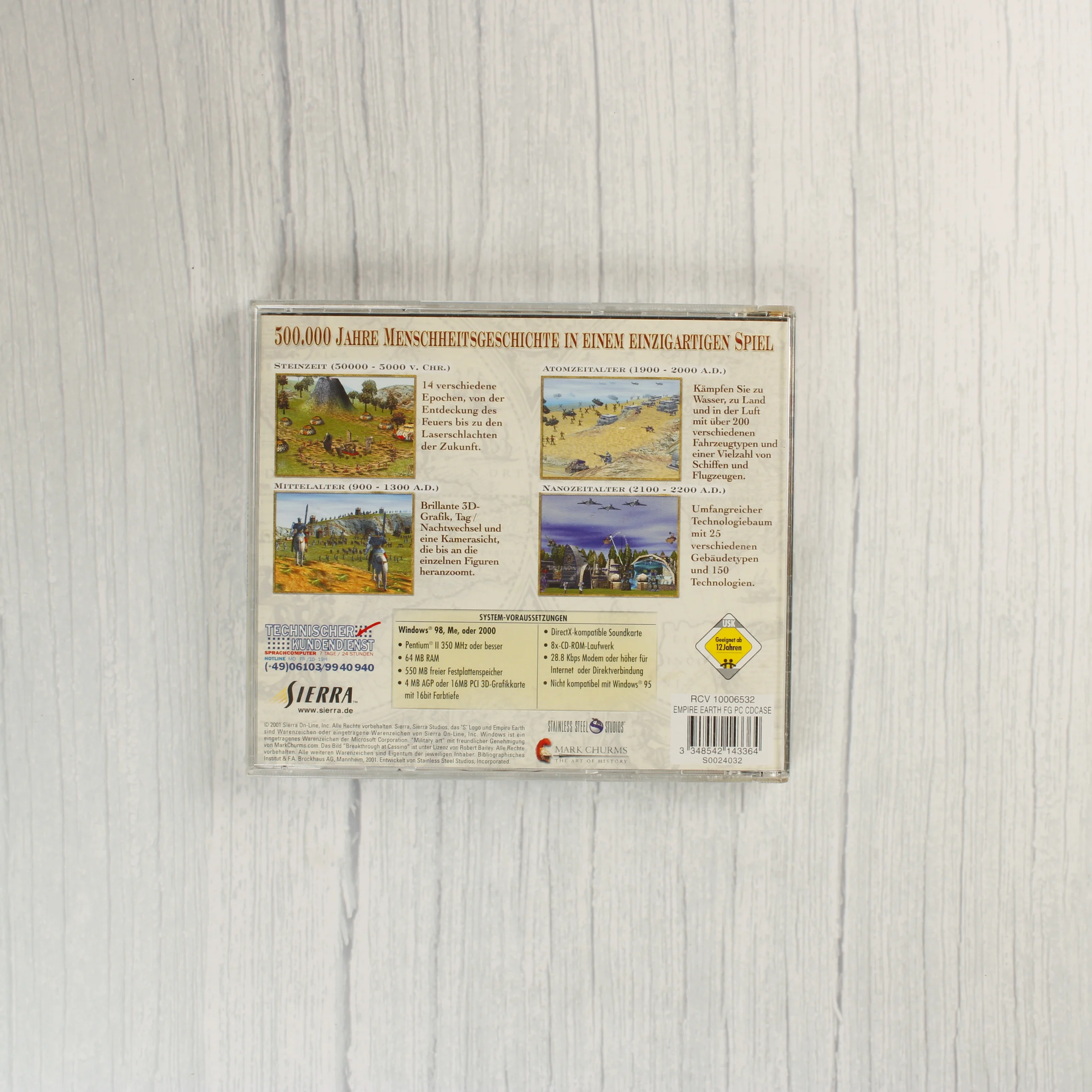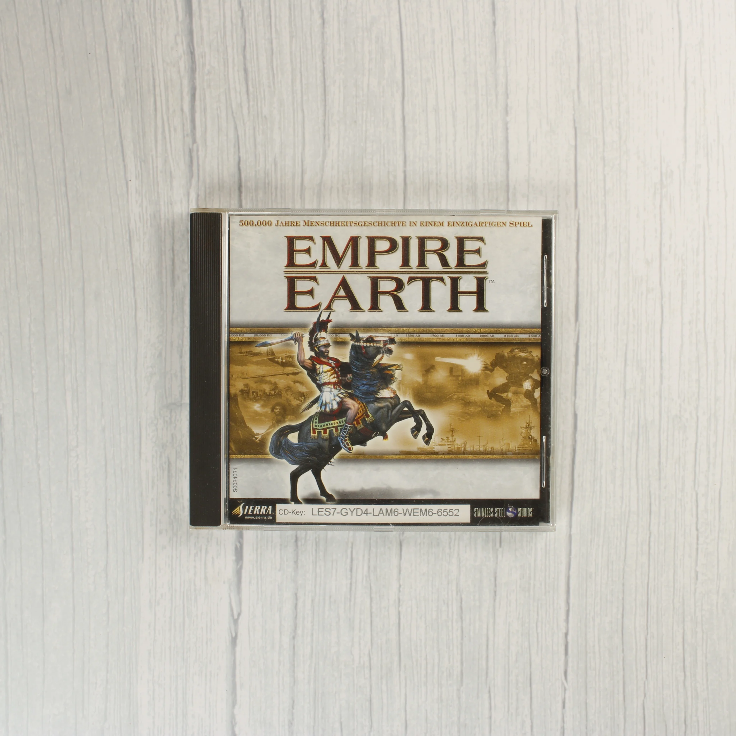 Az Empire Earth egy PC-re megjelent valós idejű stratégiai videójáték, amelynek német nyelvű kiadása látható a képeken. A csomag tartalmazza az eredeti kartondobozt, egy normál CD-tokot a telepítőlemezzel, egy kézikönyvet és egy nagyméretű, színes technológiai fát ábrázoló posztert. A doboz elején egy lovas harcos látható, háttérben különböző történelmi korszakok jeleneteivel. A Sierra és a Stainless Steel Studios logói jól láthatóak a csomagoláson. A szoftver Windows 98, Me és 2000 operációs rendszerekkel kompatibilis. A lemez felülete arany és barna tónusú grafikával díszített, rajta a játék címével és a technikai adatokkal.