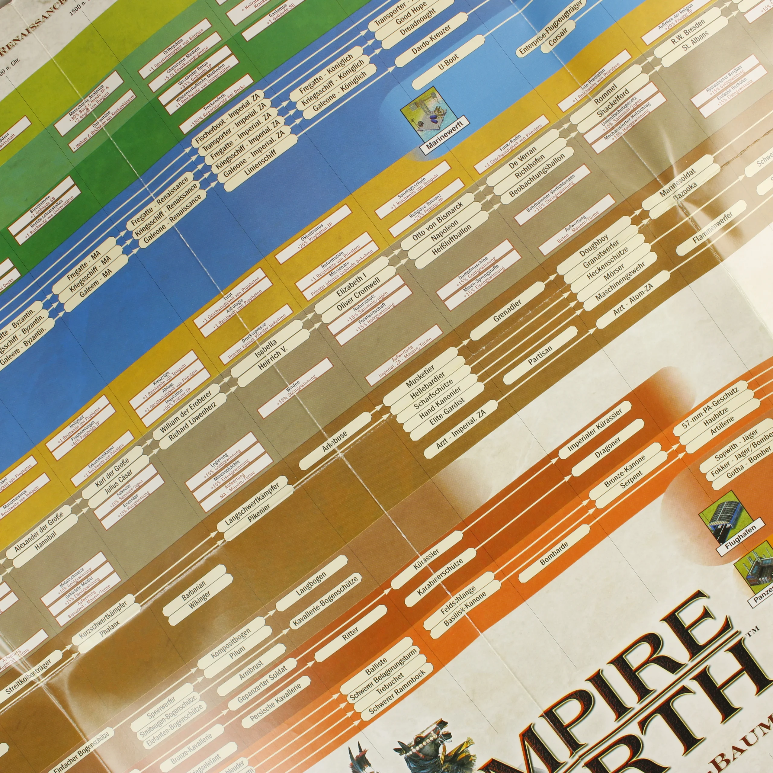 Empire Earth PC-s stratégiai videójáték német nyelvű kiadása dobozban, lemezzel, kézikönyvvel és technológiai poszterrel.