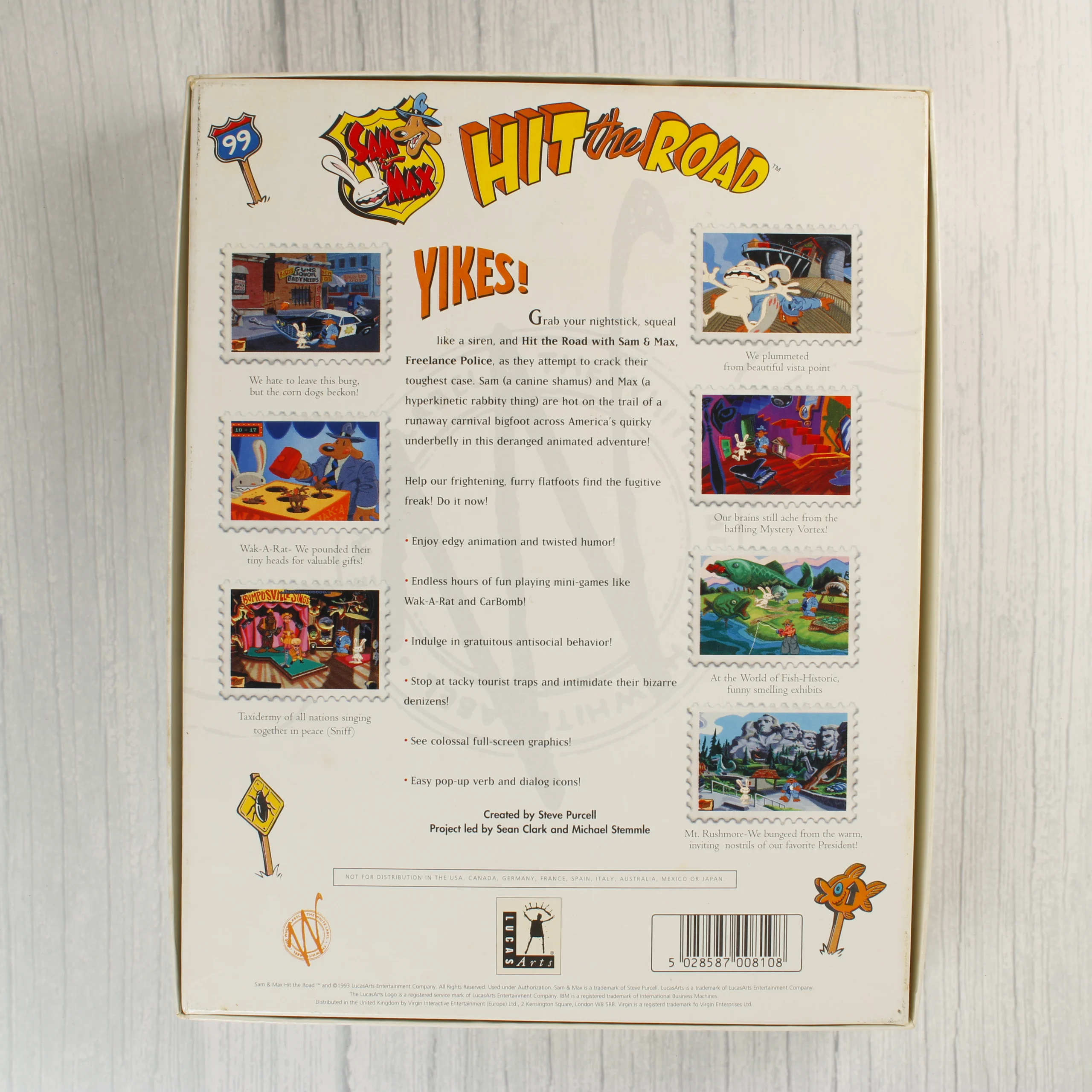 A Sam & Max Hit the Road című videójáték PC CD-ROM kiadása a The White Label sorozatból. A csomag egy nagyméretű, fehér kartondobozt tartalmaz, amelynek elején a játék illusztrációja látható egy bélyegszerű keretben, mellette narancssárga logóval. A doboz hátoldalán színes képernyőmentések, leírás és vonalkód található. A belső tartalom egy ezüst színű CD-t, egy IBM referencia kártyát és egy regisztrációs ívet foglal magában. A doboz anyaga karton, a lemezé műanyag. A csomagoláson látható a LucasArts logója is.