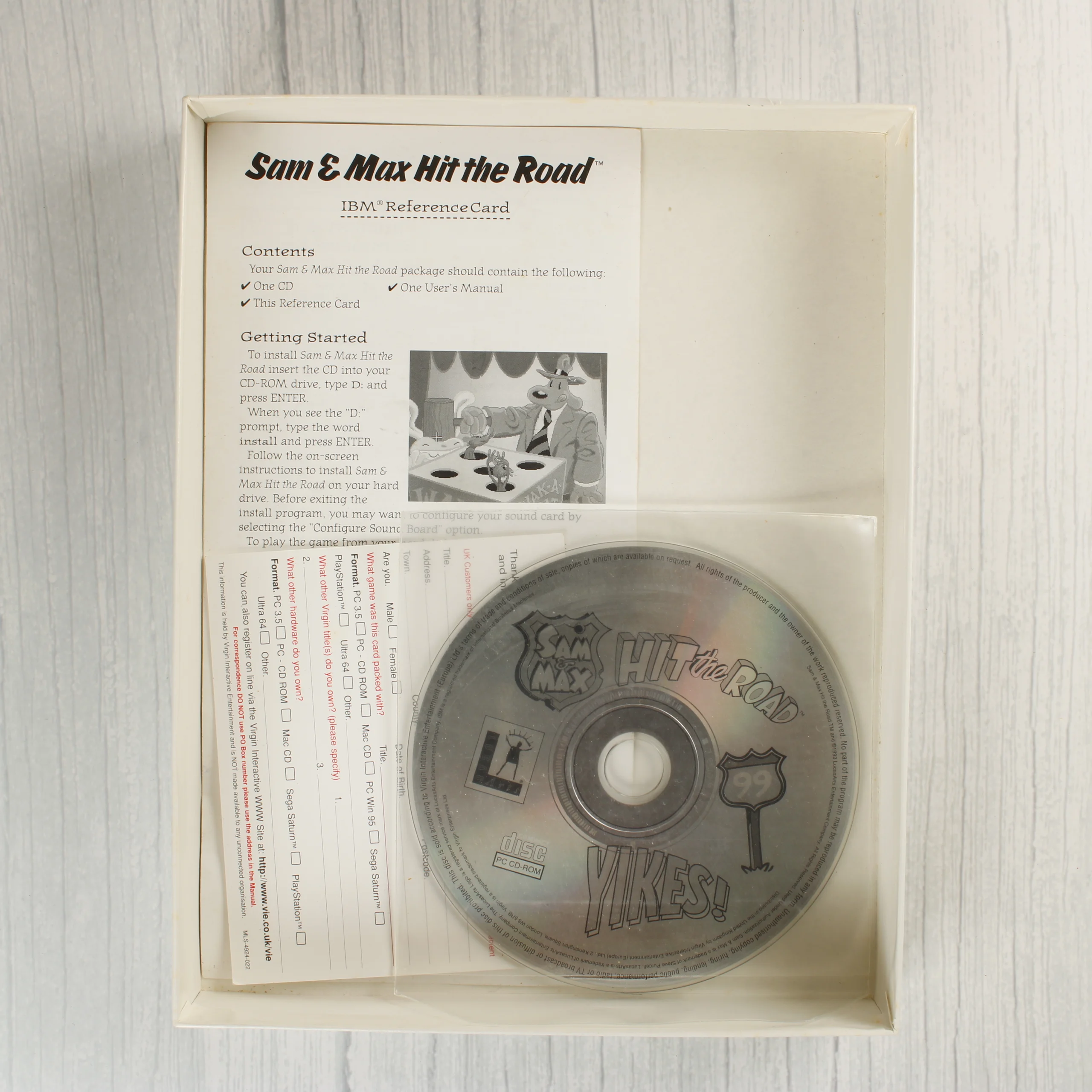 Sam & Max Hit the Road PC CD-ROM videójáték a The White Label kiadásában, eredeti dobozban, referencia kártyával és lemezzel.