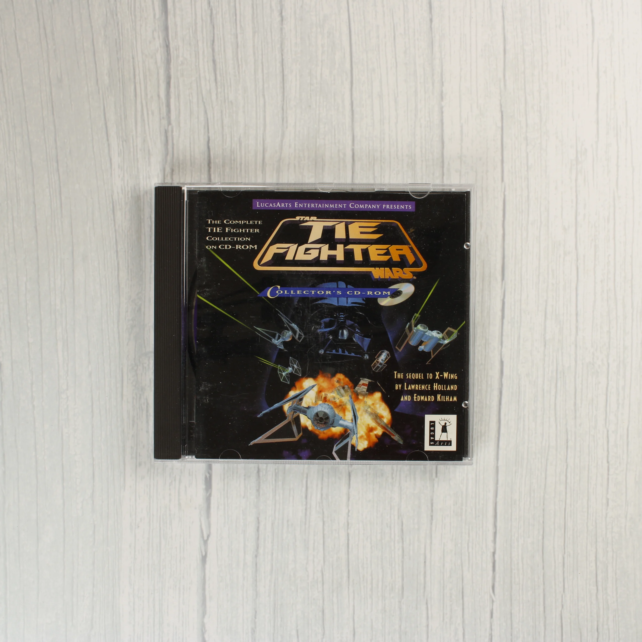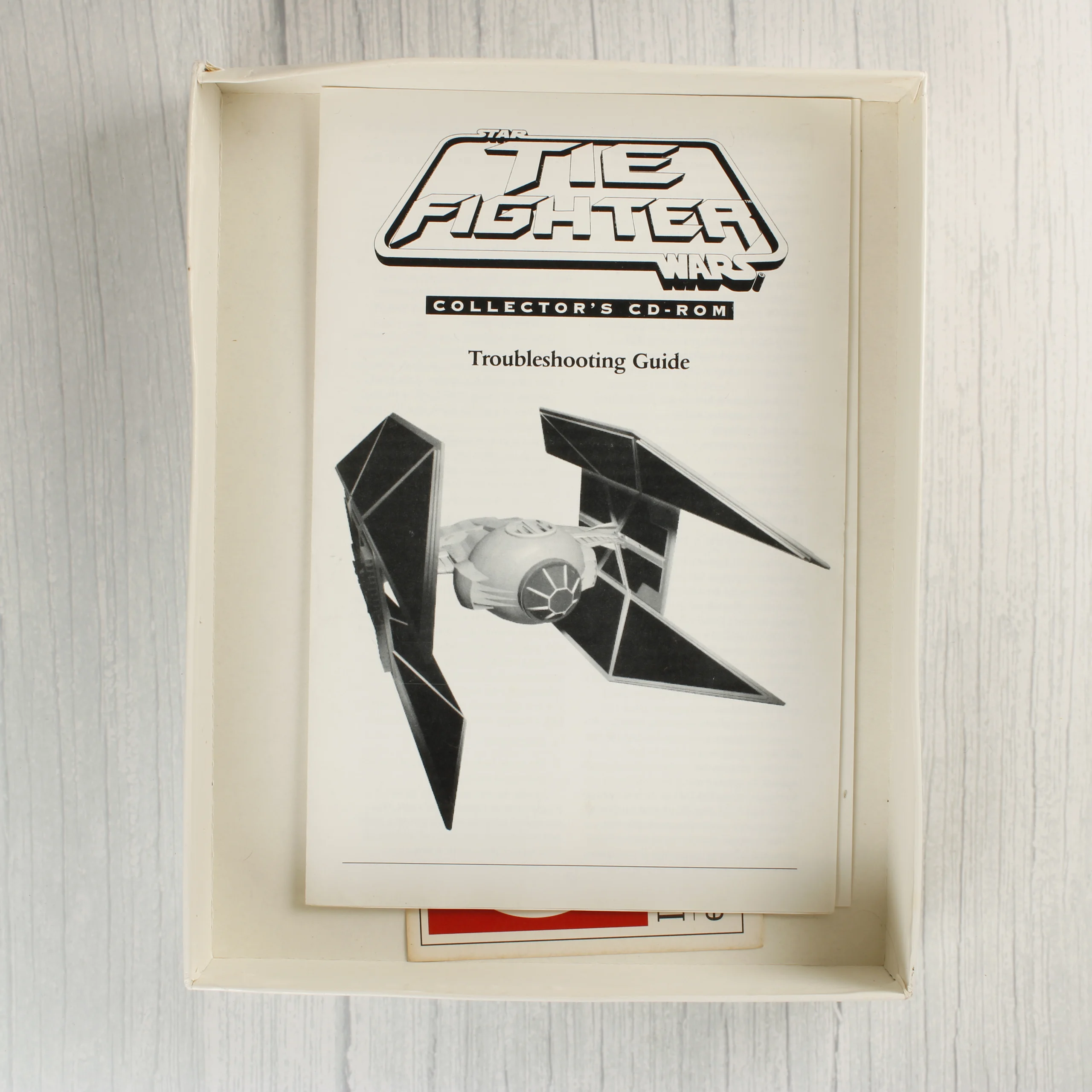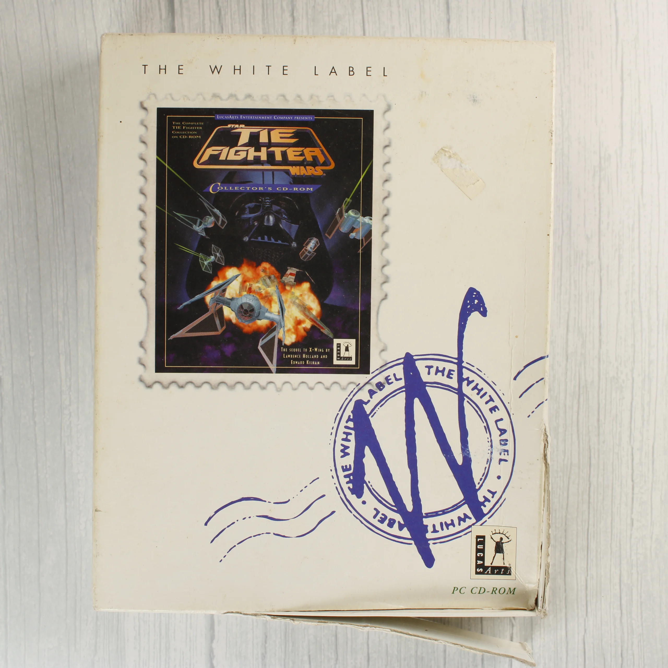 A Star Wars: TIE Fighter Collector's CD-ROM videójáték PC-re, a The White Label kiadásában. A csomag tartalmazza az eredeti, nagyméretű kartondobozt, amelyen a játék illusztrációja és a sorozat jellegzetes bélyegszerű grafikái láthatók. A doboz belsejében egy normál CD-tok található, benne a színes nyomású CD-ROM lemezzel. A mellékelt dokumentáció egy fekete-fehér Troubleshooting Guide füzetet is tartalmaz. A külső doboz fehér alapszínű, rajta a LucasArts logója és a The White Label sorozat kék körpecsétes emblémája látható. A hátoldalon játékmenetből származó képernyőmentések és angol nyelvű leírás olvasható. A kiadvány az alapjáték mellett kiegészítőket is tartalmaz.