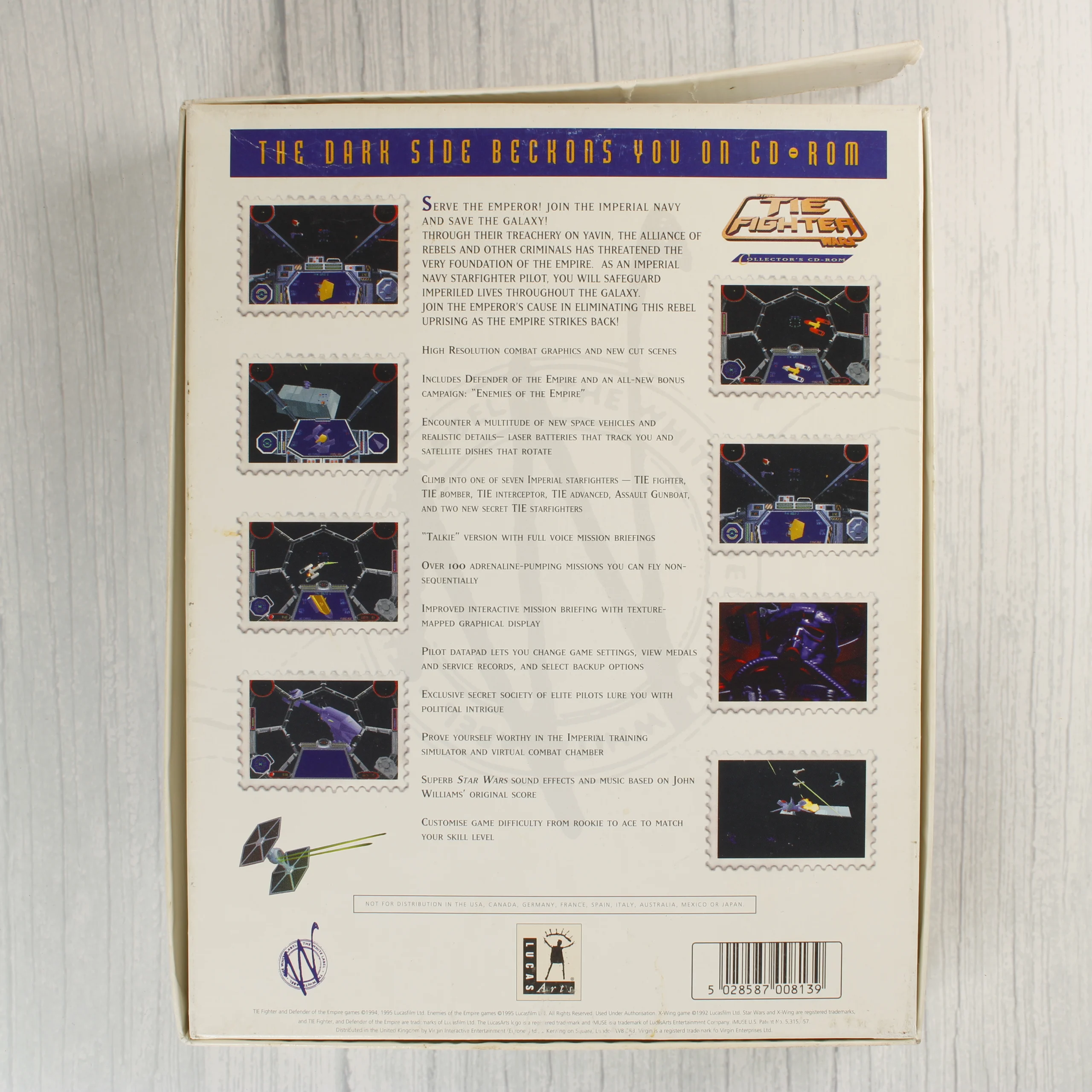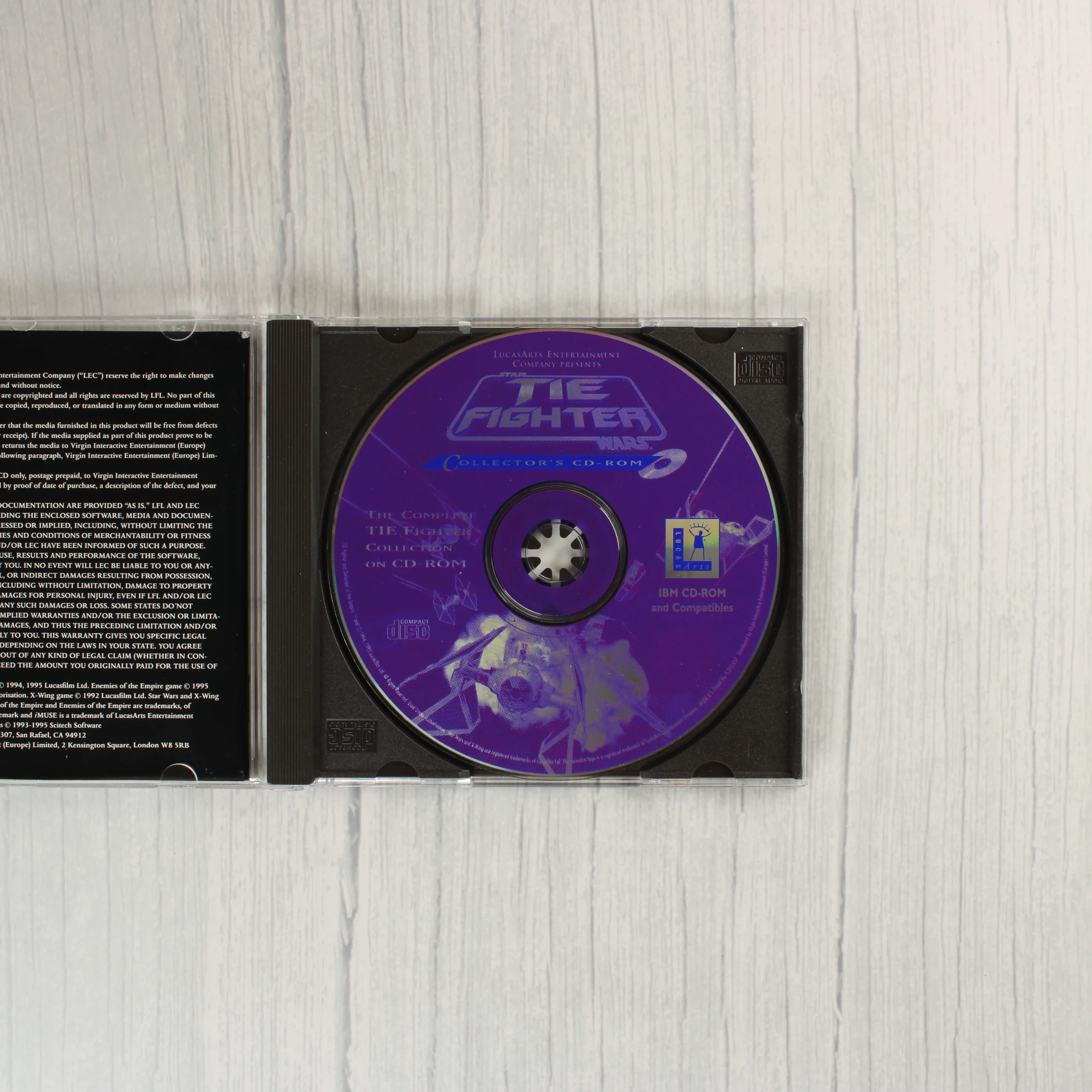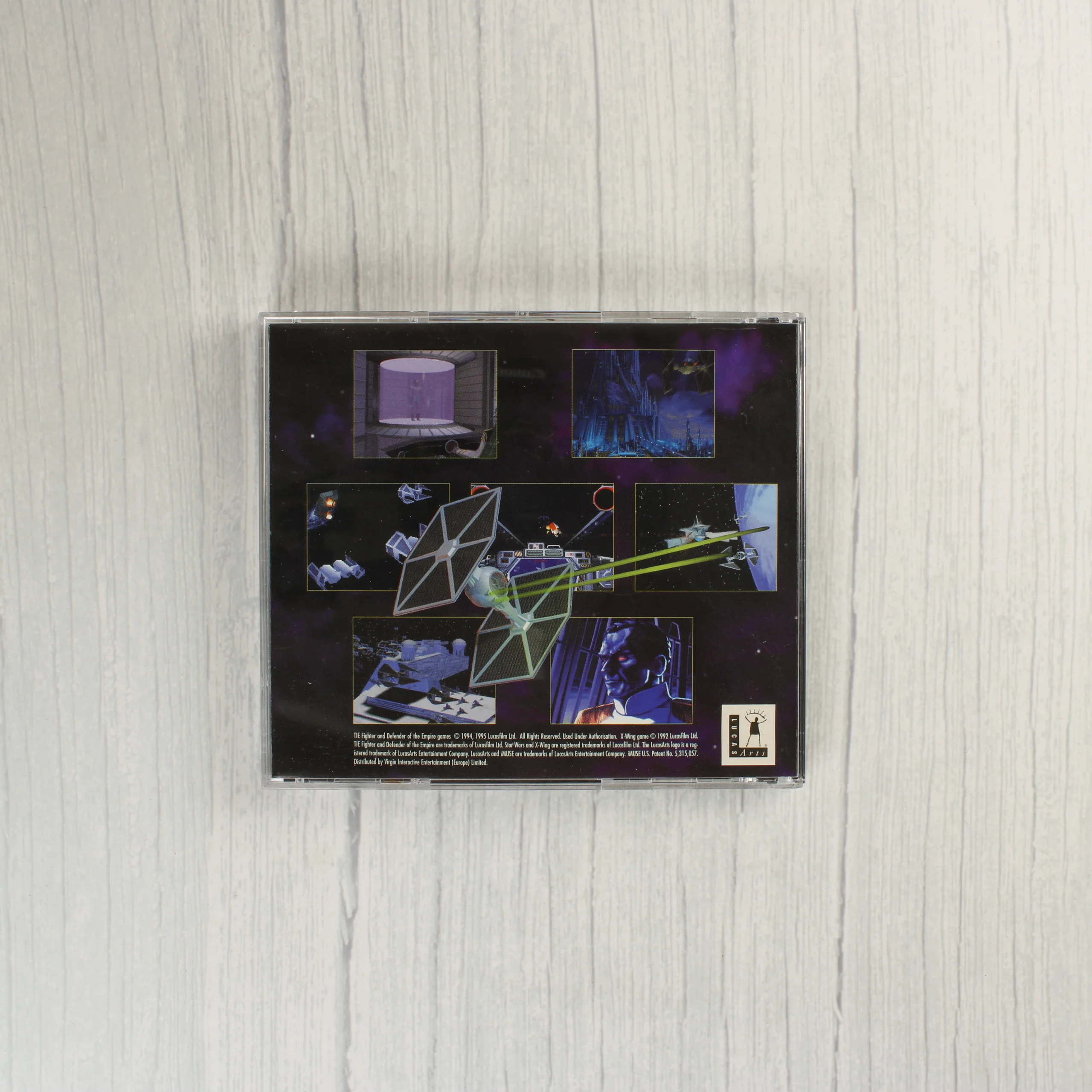 A Star Wars: TIE Fighter Collector's CD-ROM videójáték PC-re, a The White Label kiadásában. A csomag tartalmazza az eredeti, nagyméretű kartondobozt, amelyen a játék illusztrációja és a sorozat jellegzetes bélyegszerű grafikái láthatók. A doboz belsejében egy normál CD-tok található, benne a színes nyomású CD-ROM lemezzel. A mellékelt dokumentáció egy fekete-fehér Troubleshooting Guide füzetet is tartalmaz. A külső doboz fehér alapszínű, rajta a LucasArts logója és a The White Label sorozat kék körpecsétes emblémája látható. A hátoldalon játékmenetből származó képernyőmentések és angol nyelvű leírás olvasható. A kiadvány az alapjáték mellett kiegészítőket is tartalmaz.
