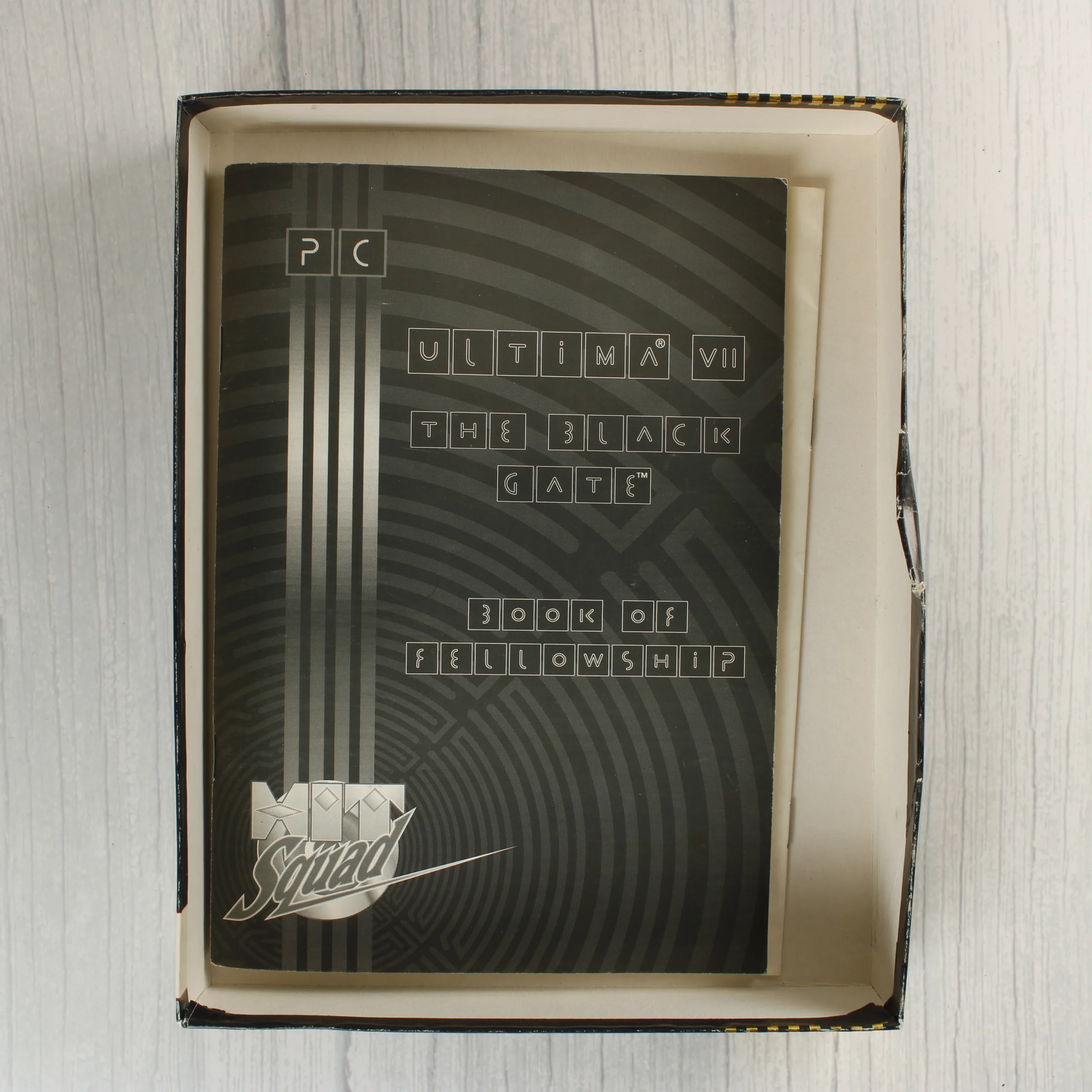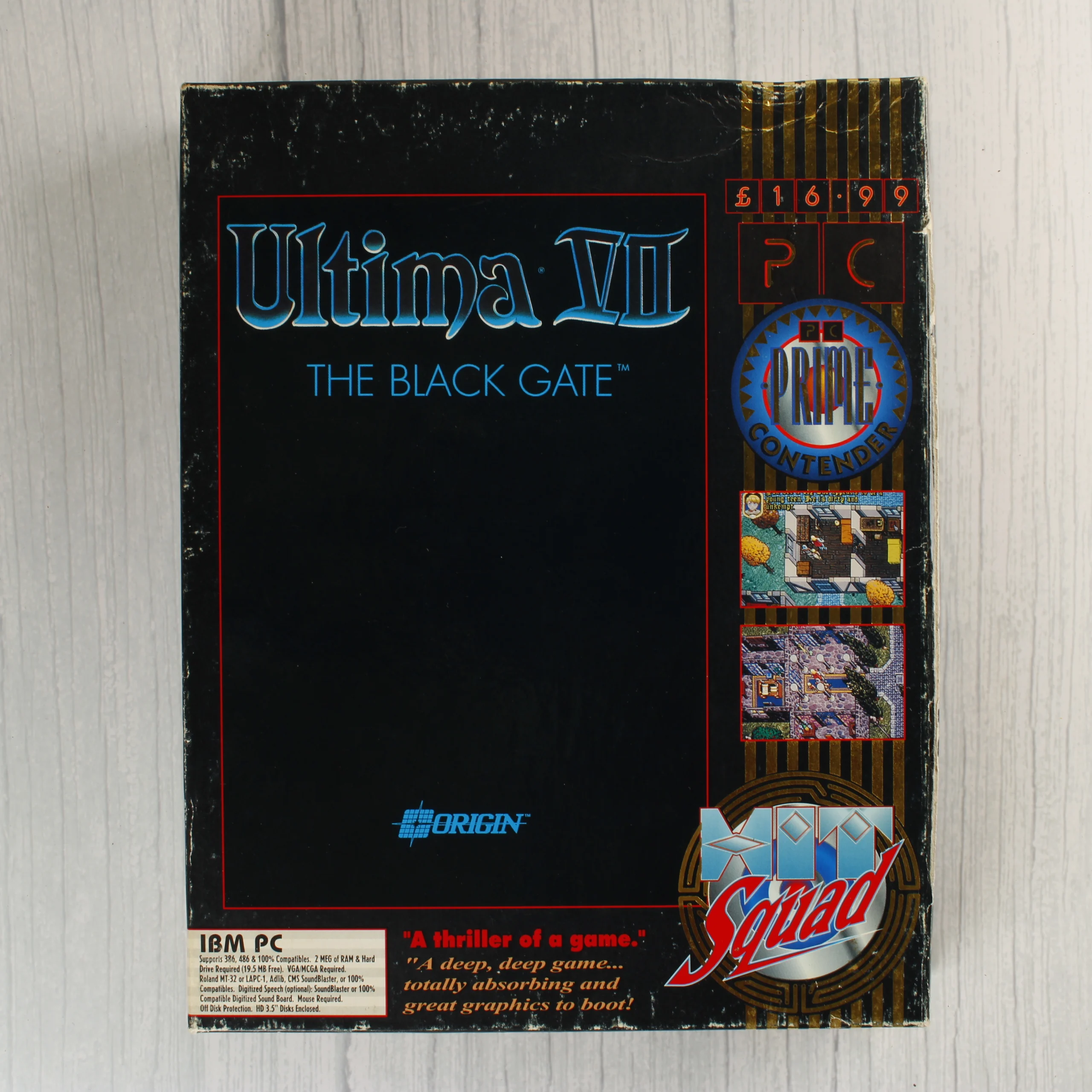 Az Ultima VII: The Black Gate videójáték IBM PC kiadása, a Hit Squad Prime Contender sorozatának részeként. A csomag tartalmazza az eredeti kartondobozt, amelyen láthatóak a használat nyomai, különösen a széleken és a sarkokon jelentkező kopások formájában. A készlet része hat darab 3,5 colos floppy lemez, amelyek fekete műanyag házzal és fém védőlemezzel rendelkeznek. Mellékelve van továbbá a 'Book of Fellowship' című fekete-fehér kézikönyv és egy színes, hajtogatott papírtérkép, amely a játék világát ábrázolja. A doboz hátoldalán többnyelvű leírás és képernyőmentések láthatóak. A lemezek és a nyomtatott anyagok esztétikailag megkímélt állapotban vannak.