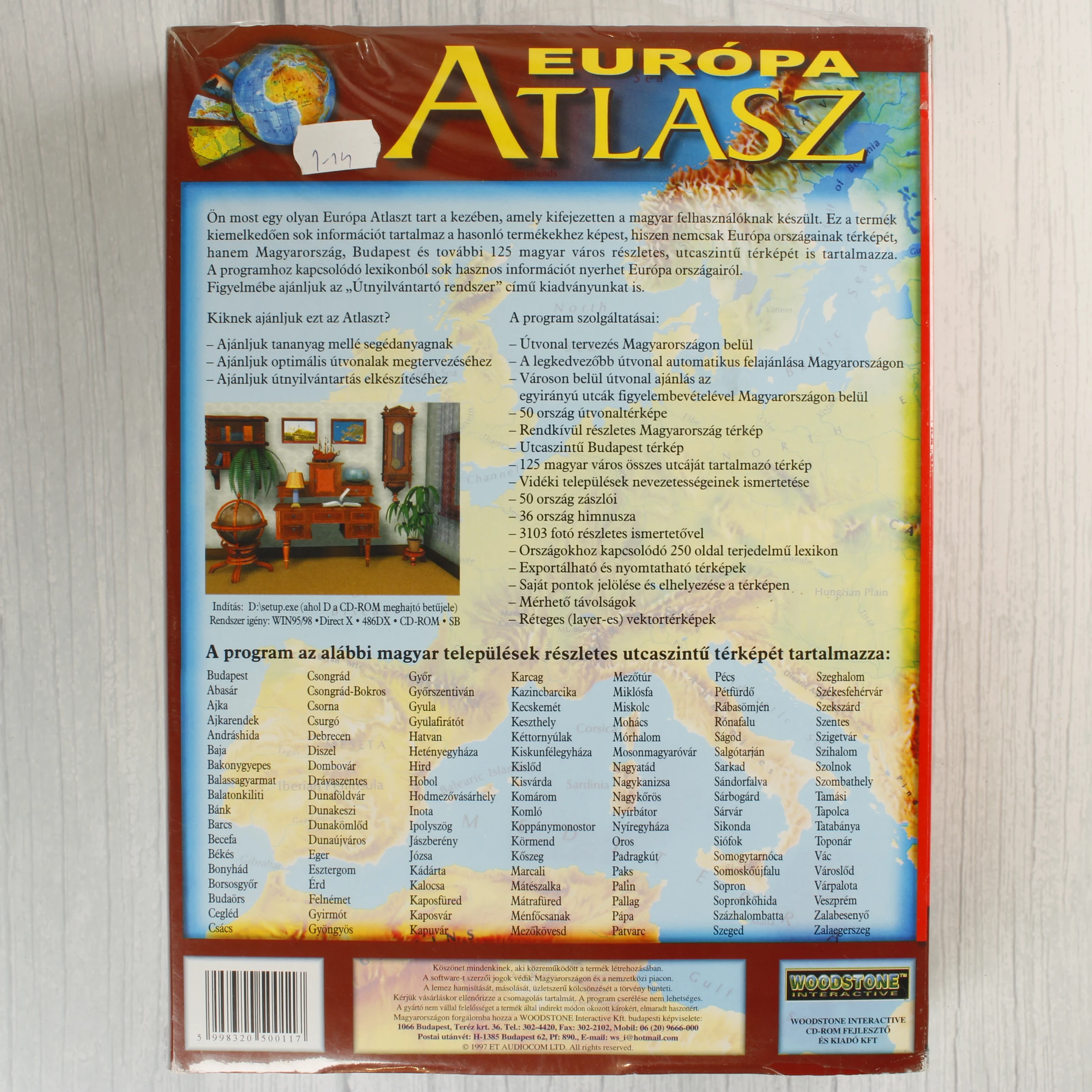 Az Európa Atlasz egy magyar nyelvű multimédiás szoftver PC CD-ROM formátumban, amelyet a Woodstone Interactive jelentetett meg. A termék eredeti, nagyméretű kartondobozos csomagolásban látható, amelyen színes grafika, egy földgömb és Magyarország térképe szerepel. A doboz eleje részletezi a szoftver tartalmát, beleértve 50 ország vektorizált térképét, Budapest és 125 magyar város utcaszintű térképét, valamint egy 250 oldalas lexikont. A hátoldalon részletes településlista és a program szolgáltatásai olvashatók. A csomagolás fóliázott, ami megőrizte a színek élénkségét és a felület épségét. A doboz élei és sarkai határozottak, jelentős fizikai sérülés nem látható a külső borításon.
