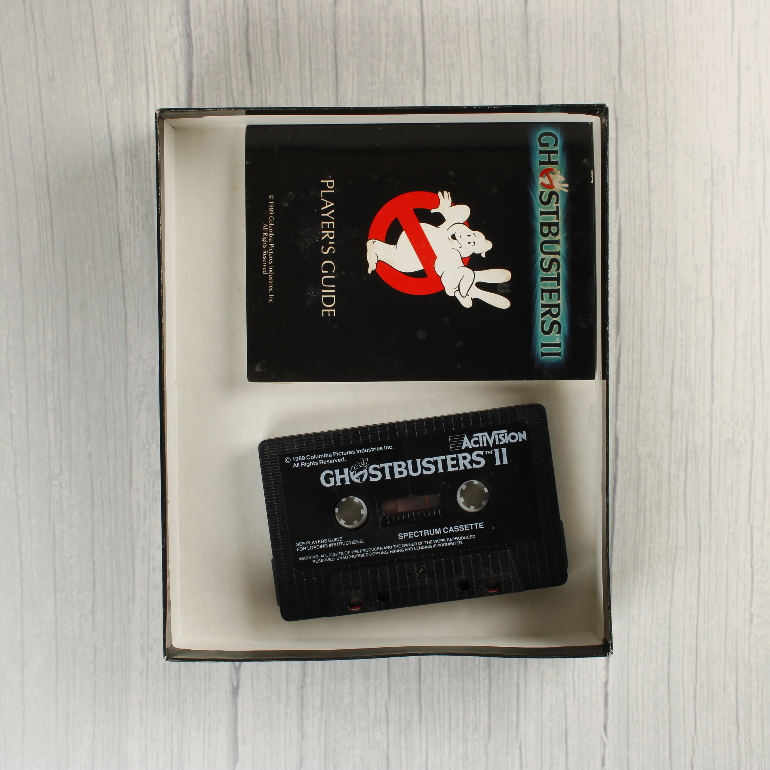 A Ghostbusters II videójáték ZX Spectrum platformra kiadott változata, eredeti kartondobozos csomagolásban. A fekete alapszínű doboz elején a film jól ismert logója látható, ahol a szellem két ujjával győzelmi jelet mutat. A csomag tartalmazza a játékot hordozó fekete színű magnókazettát, amelyen fehér feliratok jelzik a címet és a kiadót. Mellékelve van továbbá egy Player's Guide feliratú, fekete borítású használati útmutató is. A doboz hátoldalán angol nyelvű leírás és játékmenetből vett képernyőfotók láthatóak. A kiadvány az Activision gondozásában jelent meg 1989-ben.