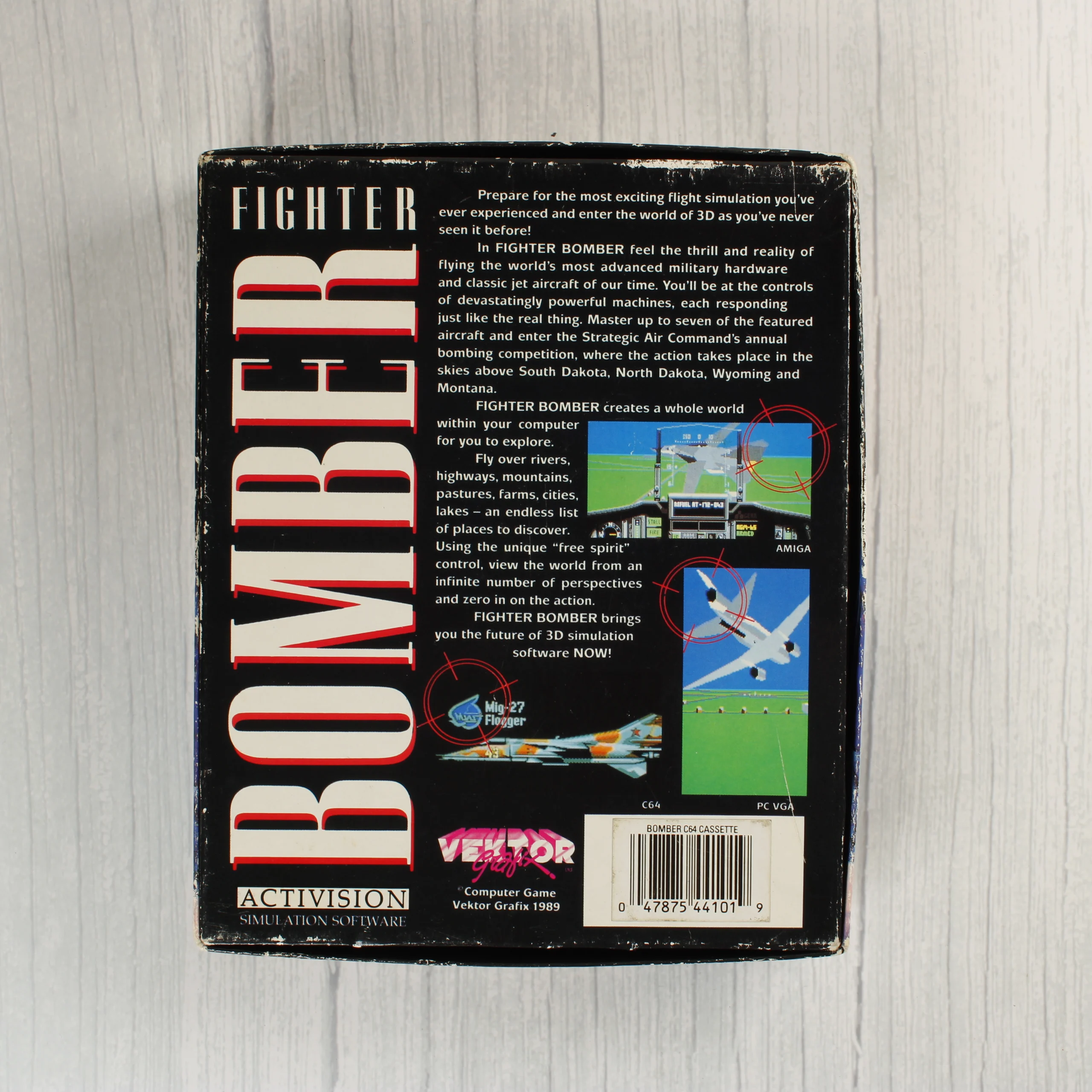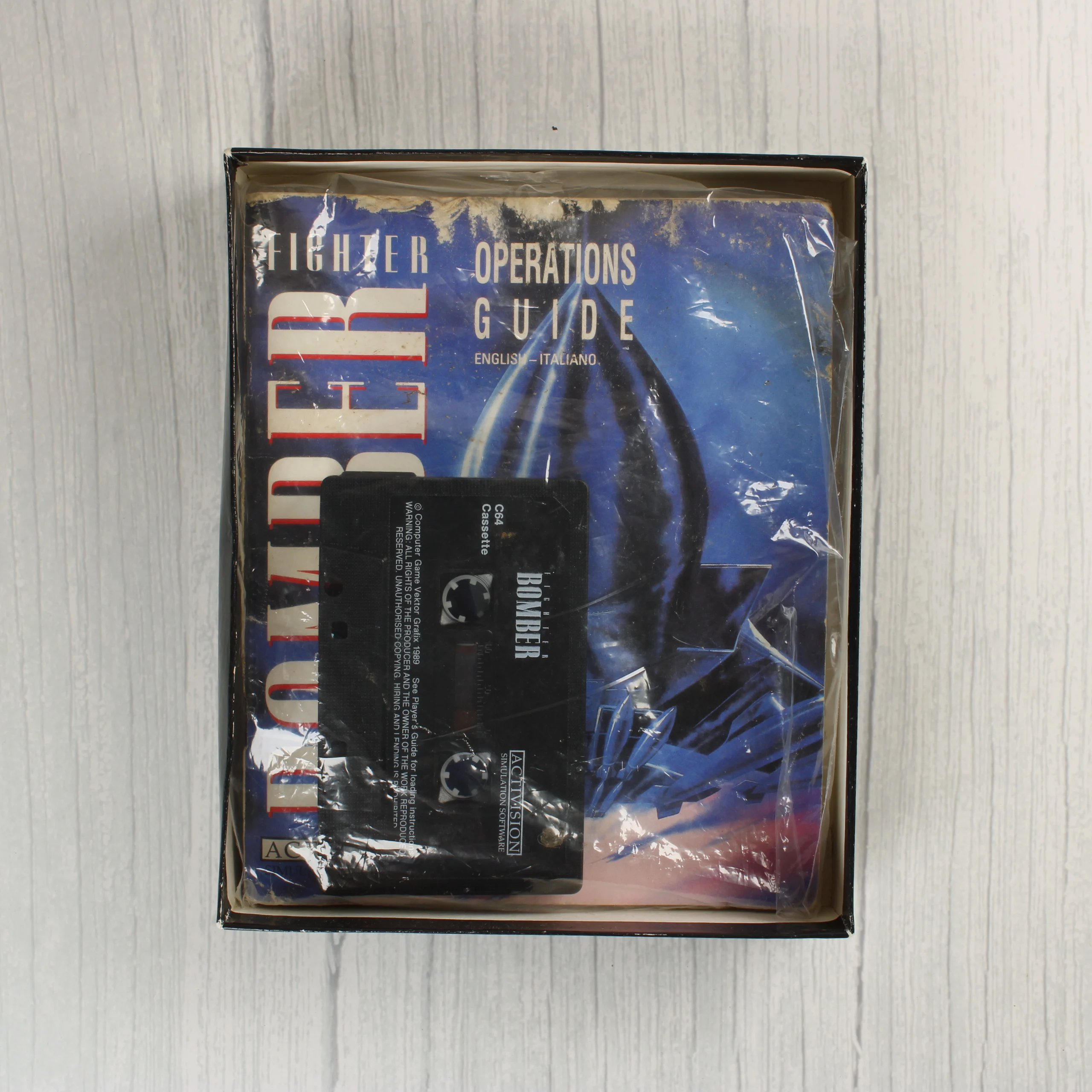 A Fighter Bomber című repülőgép-szimulátor videójáték Commodore 64 platformra készült kiadása. A csomag tartalmazza az eredeti kartondobozt, egy fekete színű magnókazettát és egy többnyelvű használati útmutatót. A doboz elején egy stilizált vadászgép látható kék és fekete tónusokban, a hátoldalon pedig játékmenet-fotók és angol nyelvű leírás olvasható. A termék az Activision gondozásában jelent meg 1989-ben. A doboz élei mentén látható kopások és kisebb benyomódások találhatók, a belső papíralapú útmutató pedig enyhén hullámos és foltos.