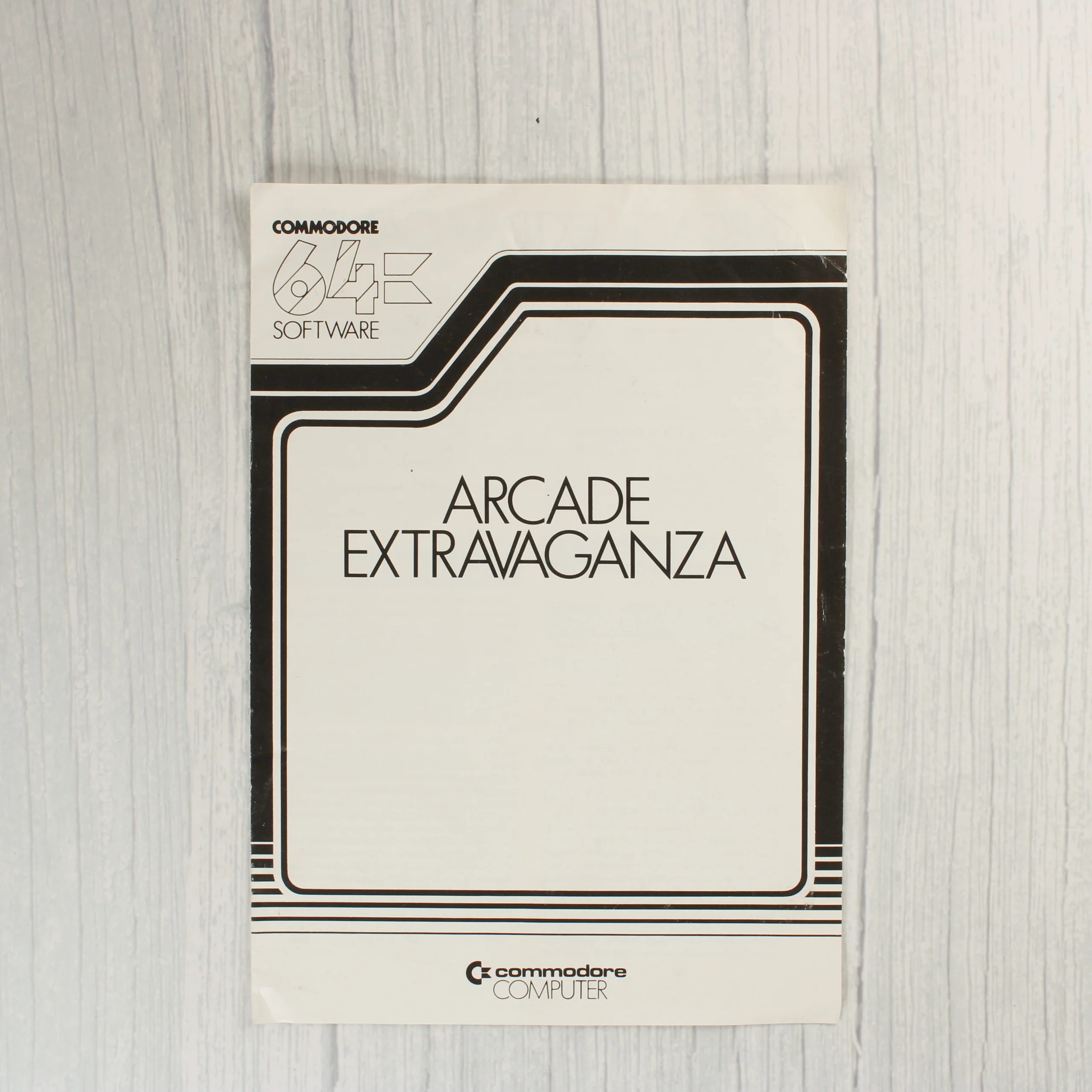 Egy eredeti Commodore 64 videójáték szoftver, amely egy 5,25 colos floppy lemezen található. A fekete színű lemez egy fehér, kék feliratos Commodore védőtasakban helyezkedik el. A lemezen lévő címke fehér alapon kék és piros feliratokkal jelzi az Arcade Extravaganzer címet és az AEX 6440 katalógusszámot. A csomag részét képezi egy nyomtatott használati útmutató vagy füzet is, amelynek borítóján a Commodore 64 Software logó és a játék címe látható fekete-fehér grafikával. A papír alapú kiegészítőkön enyhe sárgulás és használatból eredő kopás nyomai fedezhetők fel.