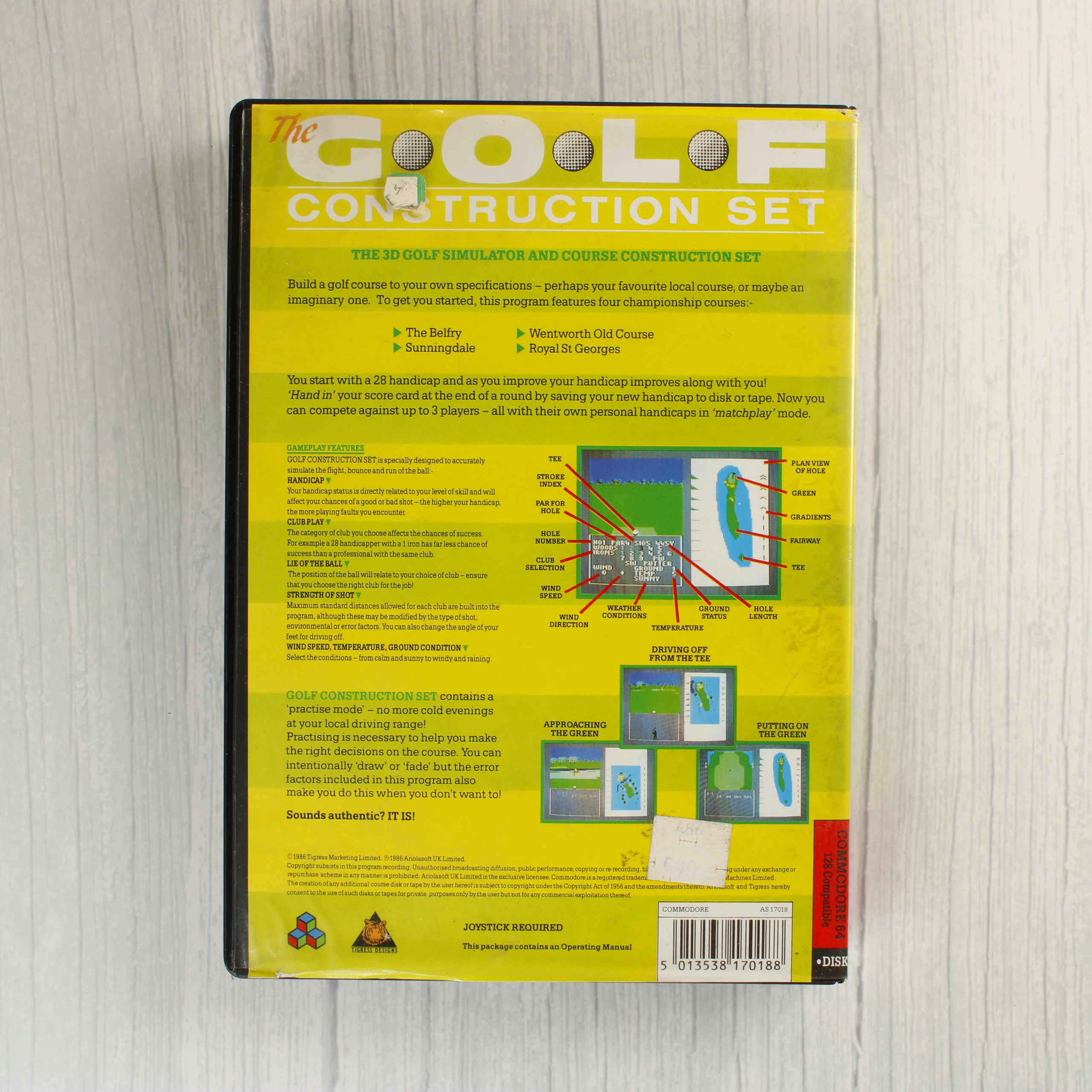 A The Golf Construction Set egy 1986-os kiadású videójáték Commodore 64 és 128 számítógépekhez. A csomag tartalmaz egy fekete műanyag tokot, amelyben a színes borító és a használati útmutató található. A játék egy 5,25 colos floppy lemezen érkezett, amely fehér papírtokban van elhelyezve. A borítón egy golfozó látható a pályán, a háttérben kék égbolttal. A tok elején és hátulján régi árcímkék és ragasztómaradványok láthatók. A hátoldalon részletes leírás olvasható a játékmenetről, valamint képernyőképek mutatják be a szimulátort. A kiadó az Ariolasoft, a fejlesztő pedig a Tigress Marketing Ltd.