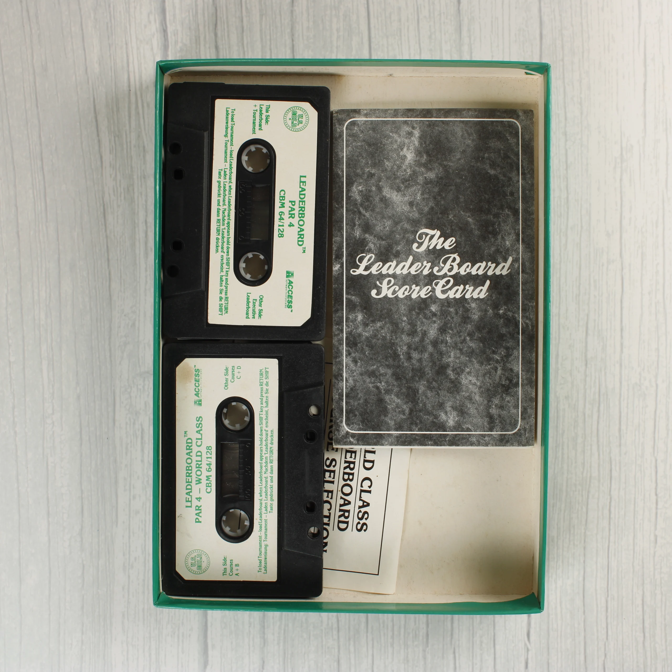 Leader Board Par 4 golfszimulátor gyűjtemény Commodore 64/128 gépekhez, két kazettával és kiegészítőkkel, eredeti dobozban.