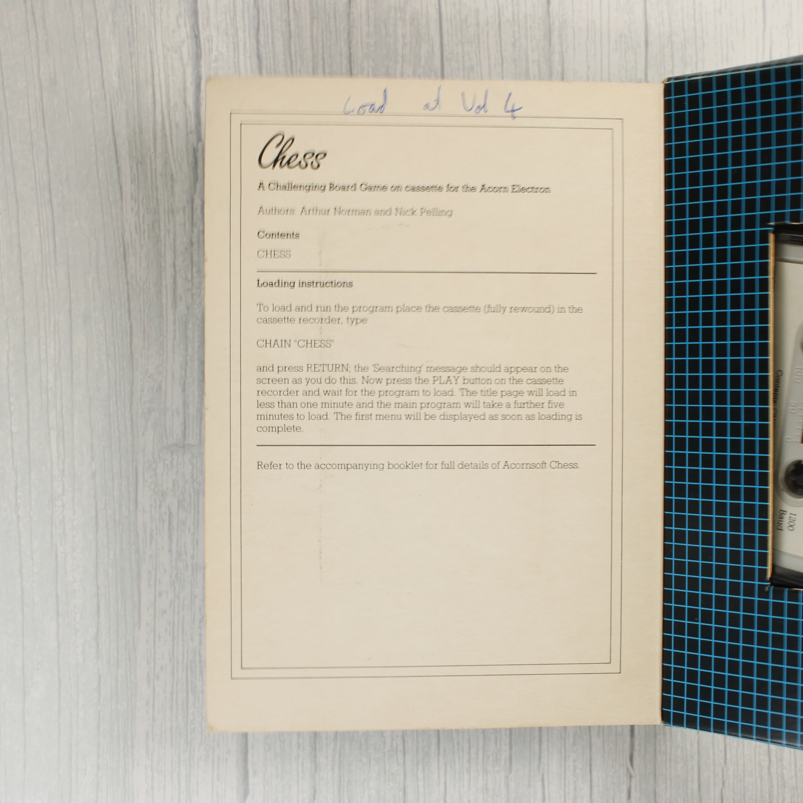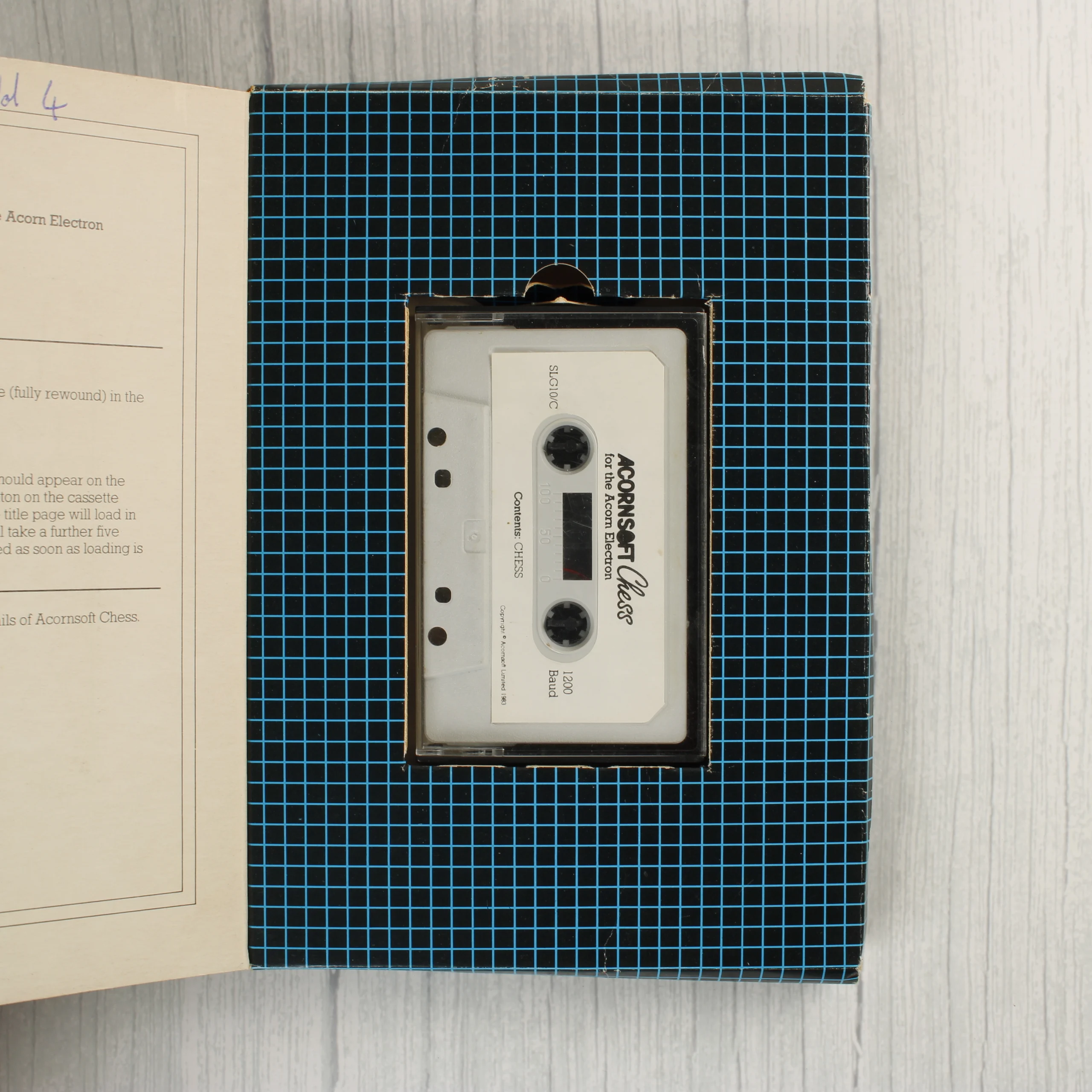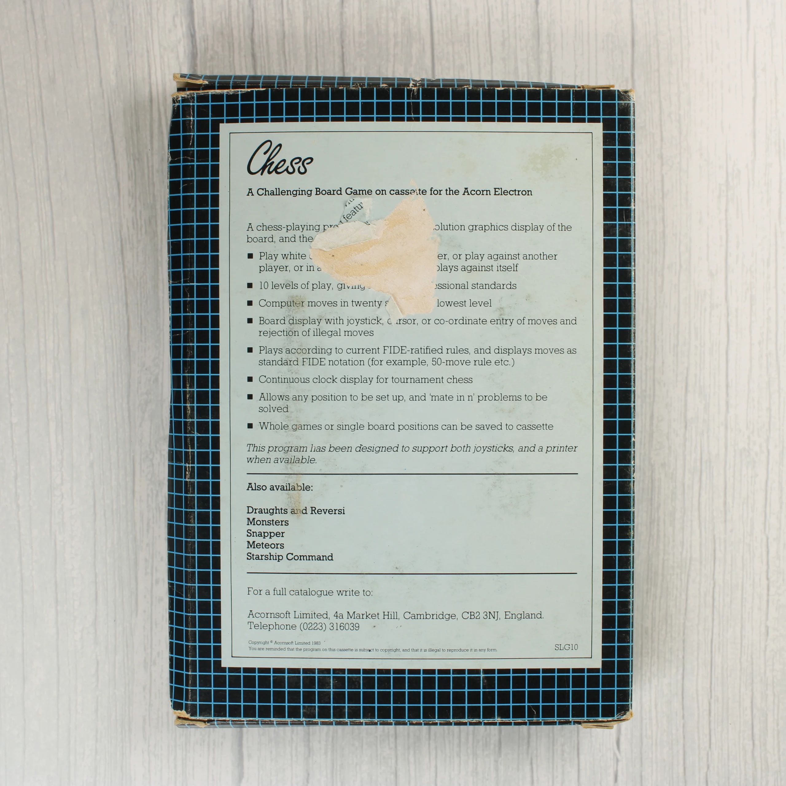 Az Acornsoft által kiadott Chess egy klasszikus sakkprogram Acorn Electron számítógépre. A szoftver egy kék rácsmintás kartondobozban található, amelynek elején egy neonrózsaszín felirat és egy képernyőfotó látható a játékmenetről. A csomag tartalmazza az eredeti magnókazettát, amely egy speciálisan kialakított belső mélyedésben helyezkedik el. A doboz hátoldalán részletes angol nyelvű leírás olvasható a játék funkcióiról, például a tíz nehézségi szintről és a FIDE szabályoknak megfelelő működésről. A belső borítón kézzel írt kék tintás megjegyzés látható a betöltési hangerőre vonatkozóan. A kazetta fehér címkével rendelkezik, amelyen fekete feliratok jelzik a címet és a technikai adatokat.