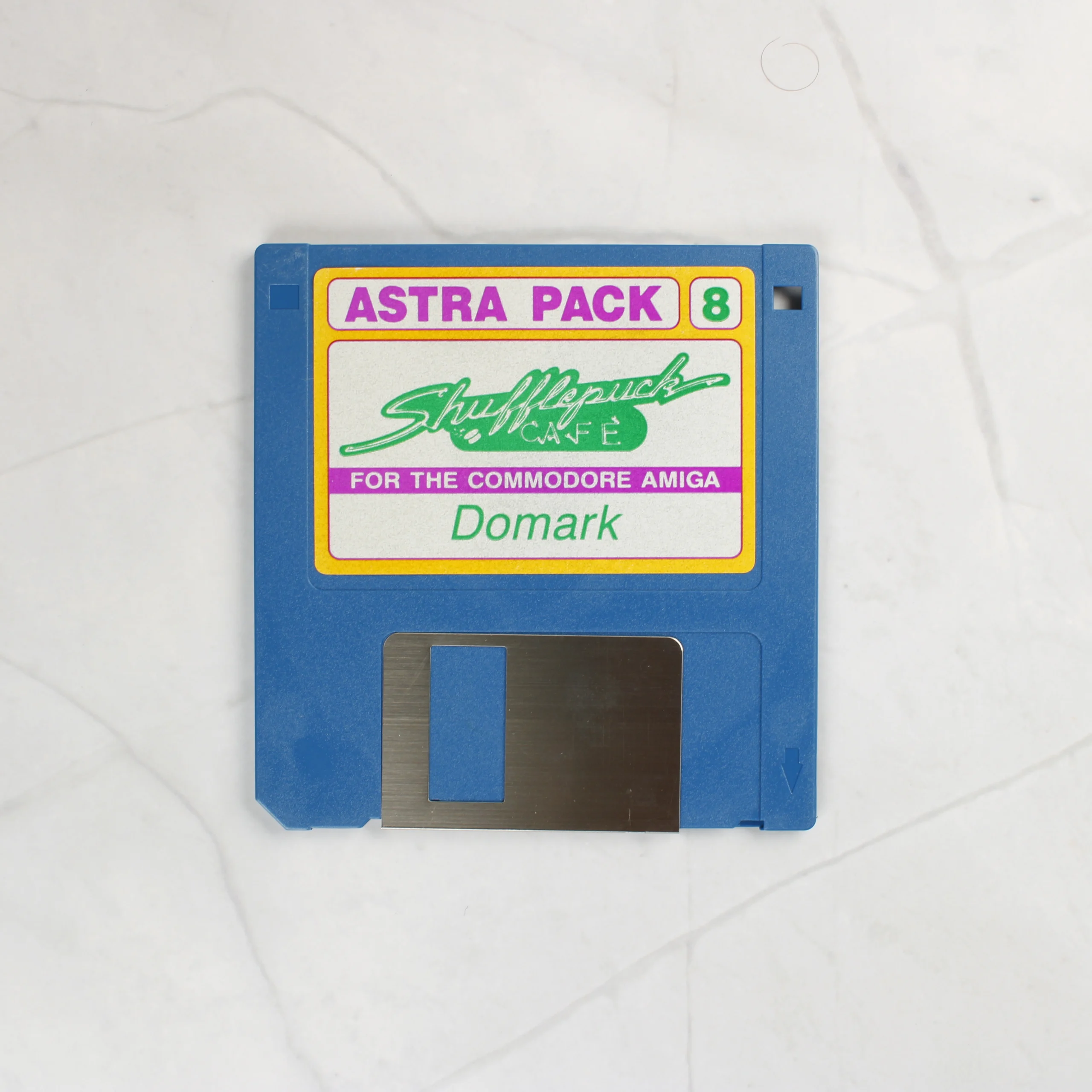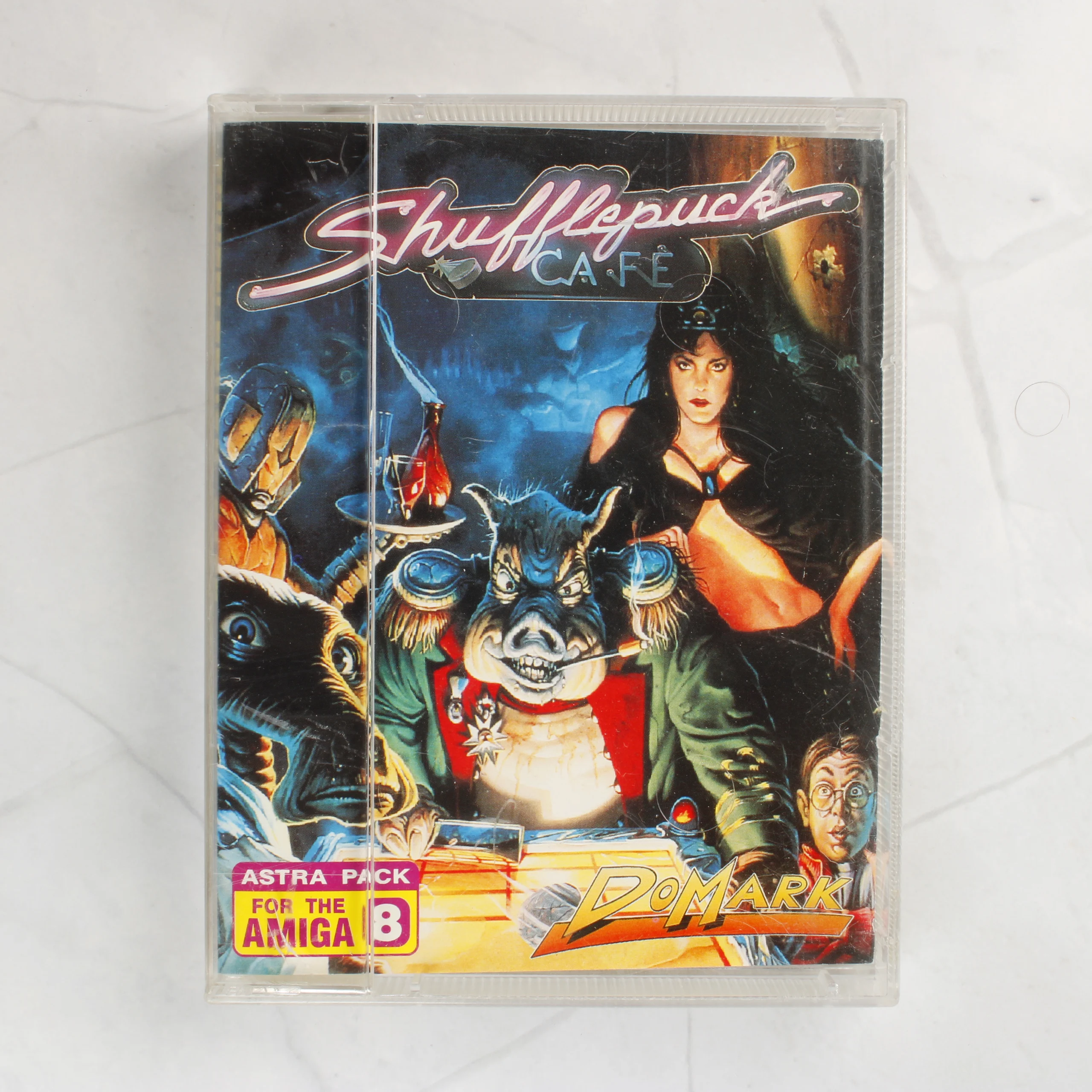 A Shufflepuck Café című videójáték Commodore Amiga platformra készült kiadása. A csomag tartalmaz egy 3,5 colos kék színű floppy lemezt és egy átlátszó műanyag tokot a hozzá tartozó színes borítóval. Az előlapon a játékra jellemző sci-fi stílusú illusztráció látható különféle karakterekkel, míg a hátoldalon sárga alapon egy játékmenet-fotó és angol nyelvű leírás szerepel. A kiadvány az Astra Pack sorozat 8. darabja, a Domark gondozásában jelent meg. A floppy lemezen fehér alapú címke található zöld és lila feliratokkal. A tok és a borító állapota megkímélt, a lemez fém védőlemeze ép.