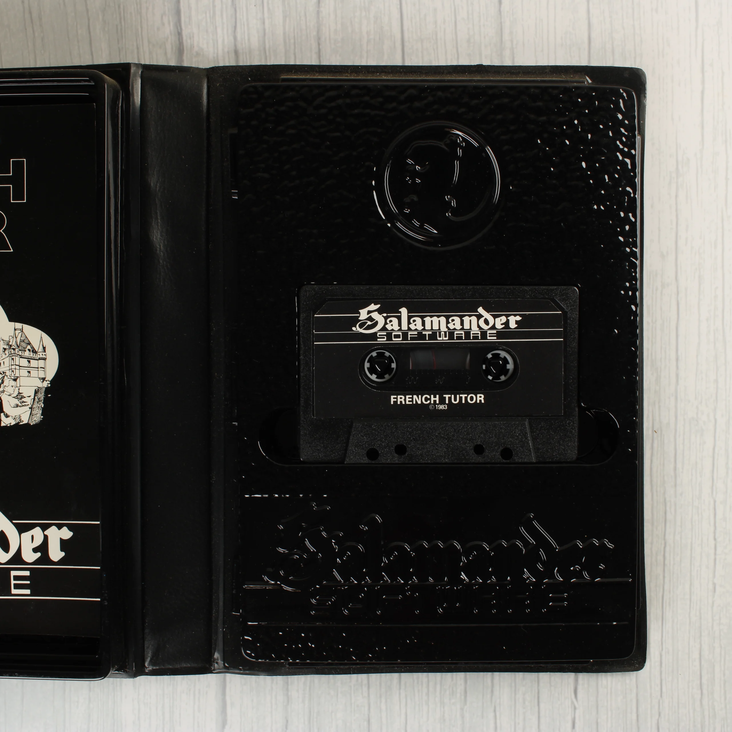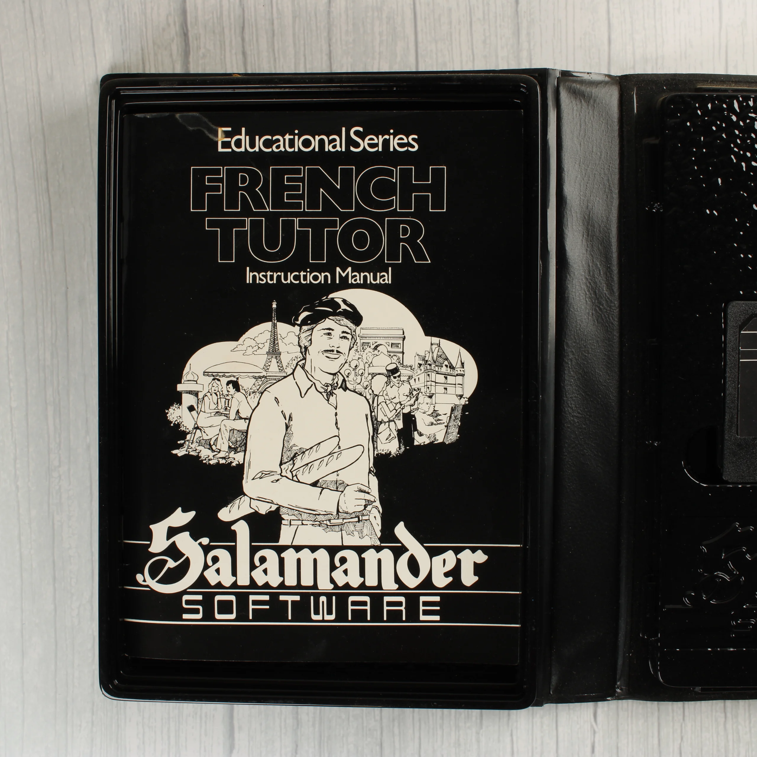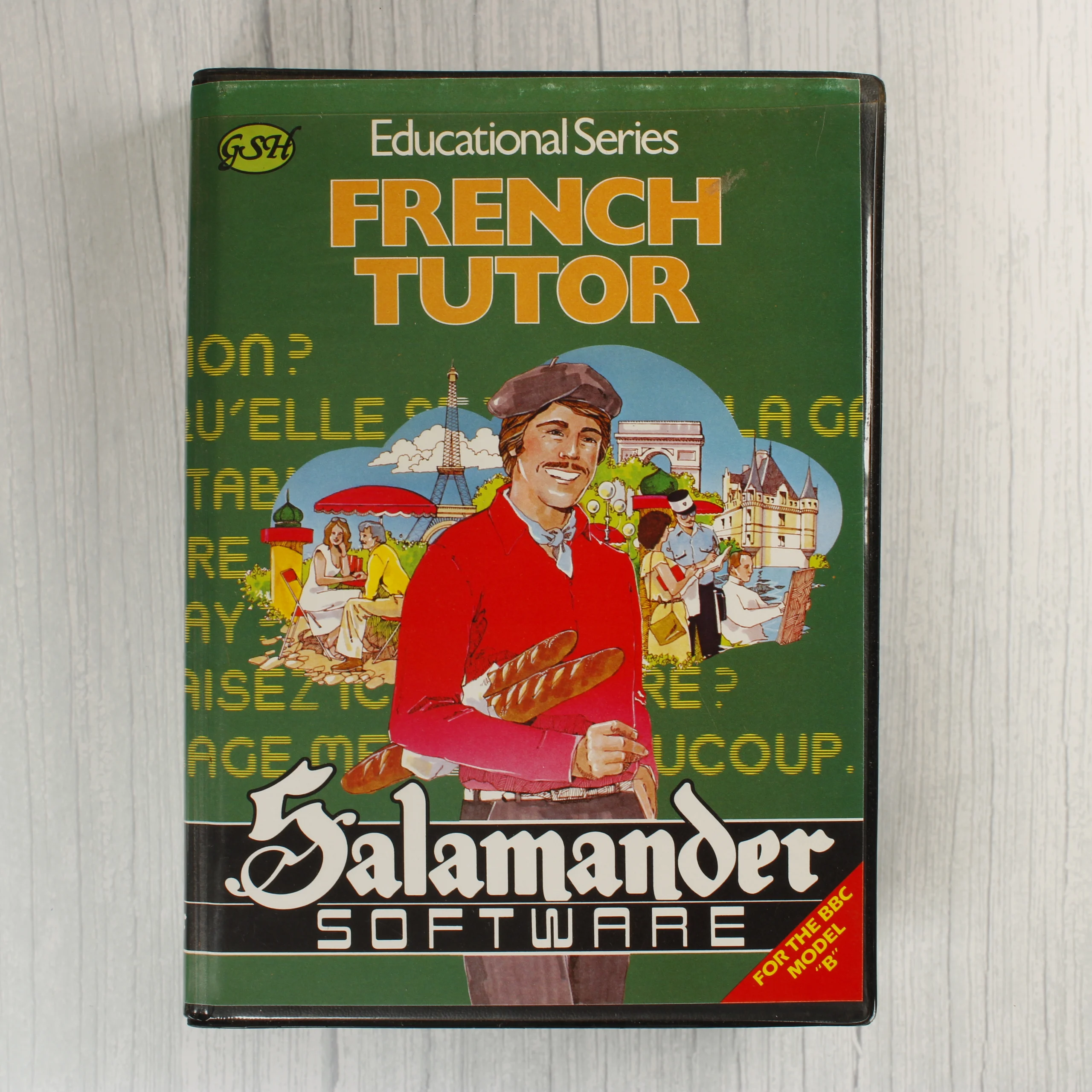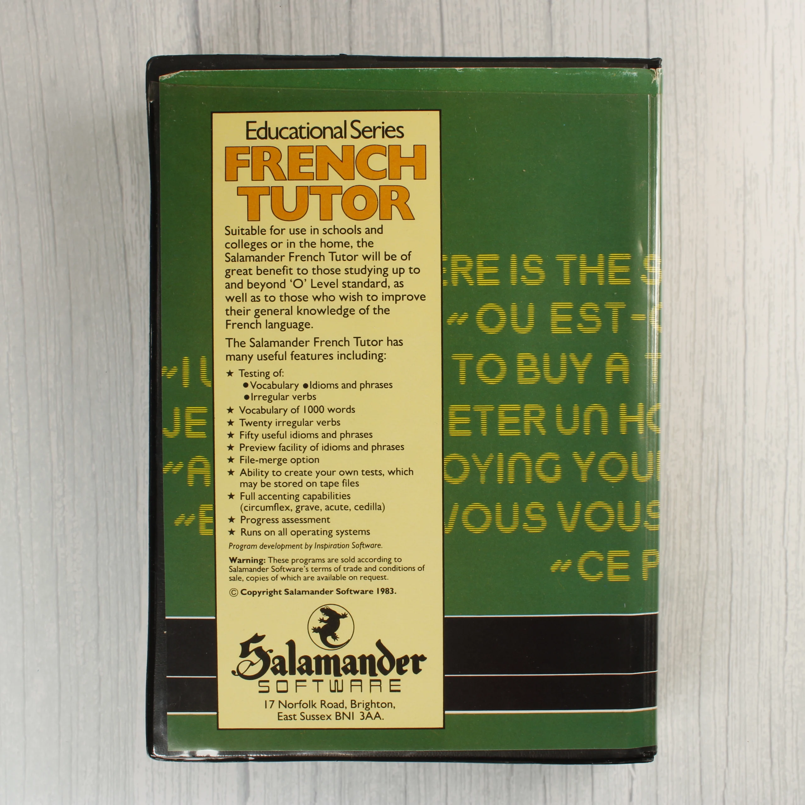 A Salamander Software által kiadott French Tutor egy oktatóprogram BBC Model B számítógéphez. A csomag egy zöld alapszínű, műanyag borítású tokban található, amelynek elején egy francia életképet ábrázoló illusztráció látható: egy férfi bagettel a kezében, a háttérben pedig az Eiffel-torony és egy kávézó jelenik meg. A tok belseje fekete, formázott műanyag, amely helyet biztosít a fekete színű mágneskazettának és a hozzá tartozó használati útmutatónak. A kazettán fehér felirattal szerepel a szoftver címe és a kiadó neve. A hátoldalon részletes leírás olvasható a program funkcióiról, többek között a szókincs- és nyelvtani tesztekről. A termék az 1983-as évből származik, a Salamander Software Educational Series sorozatának része.