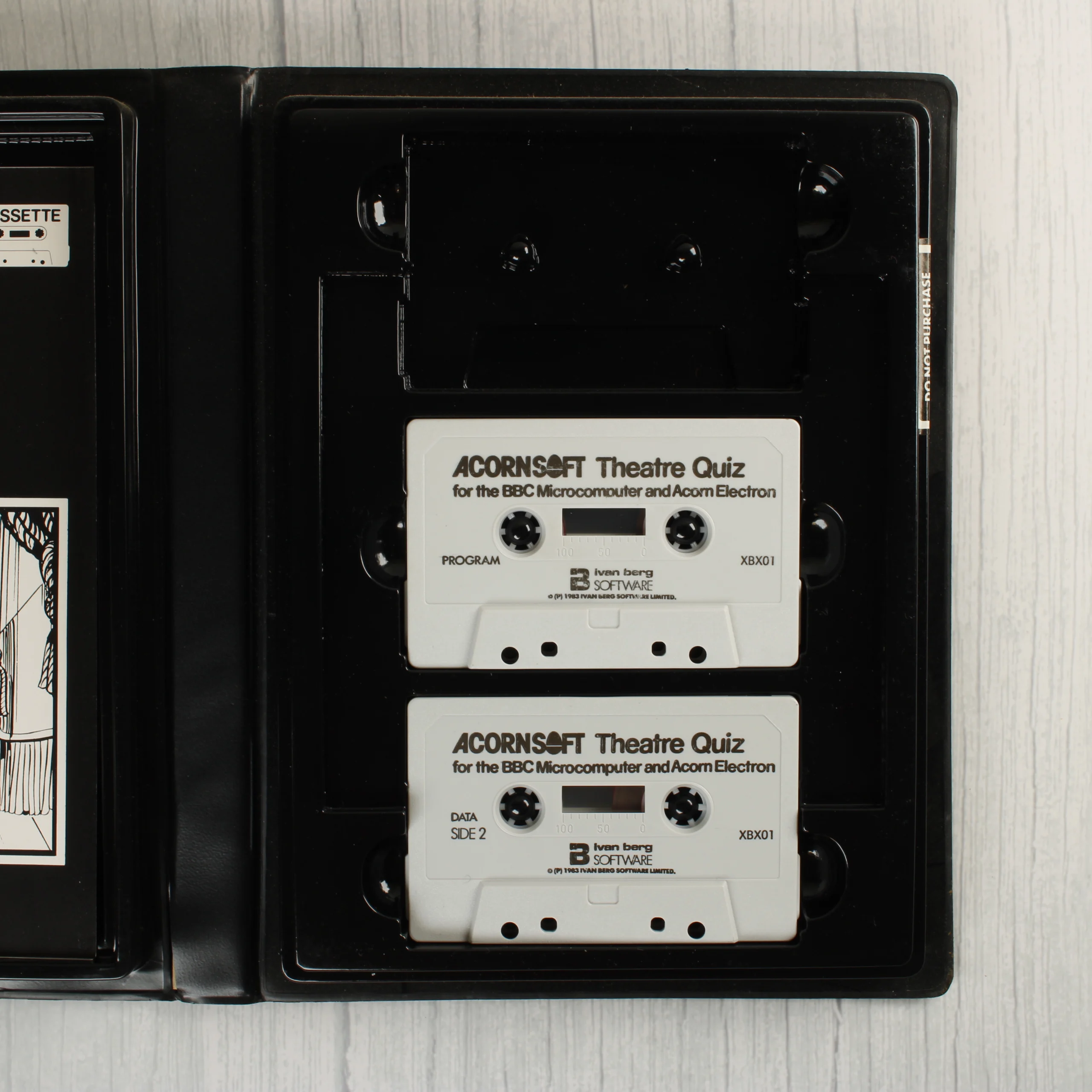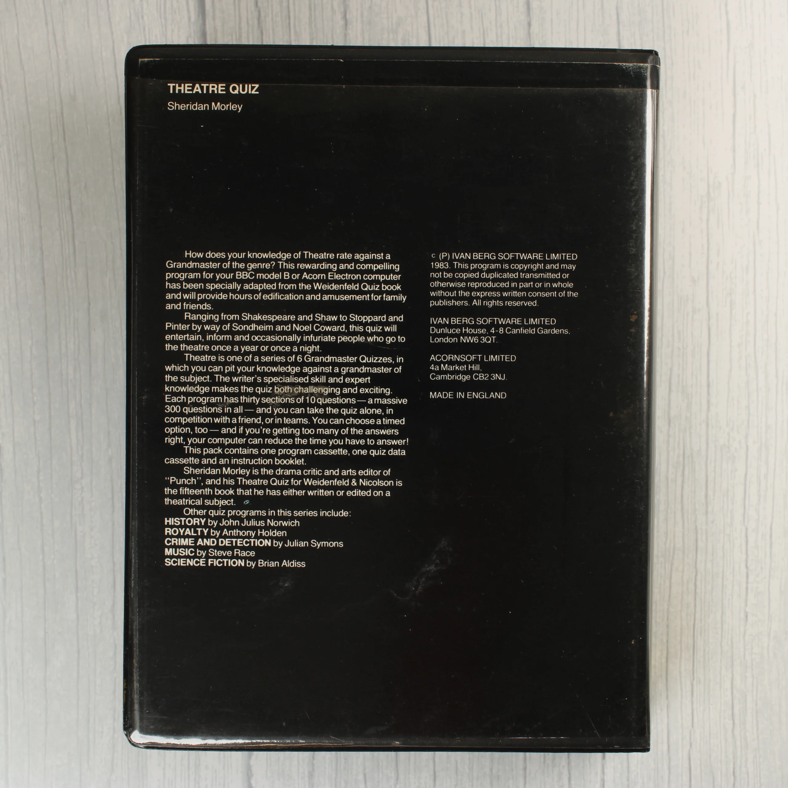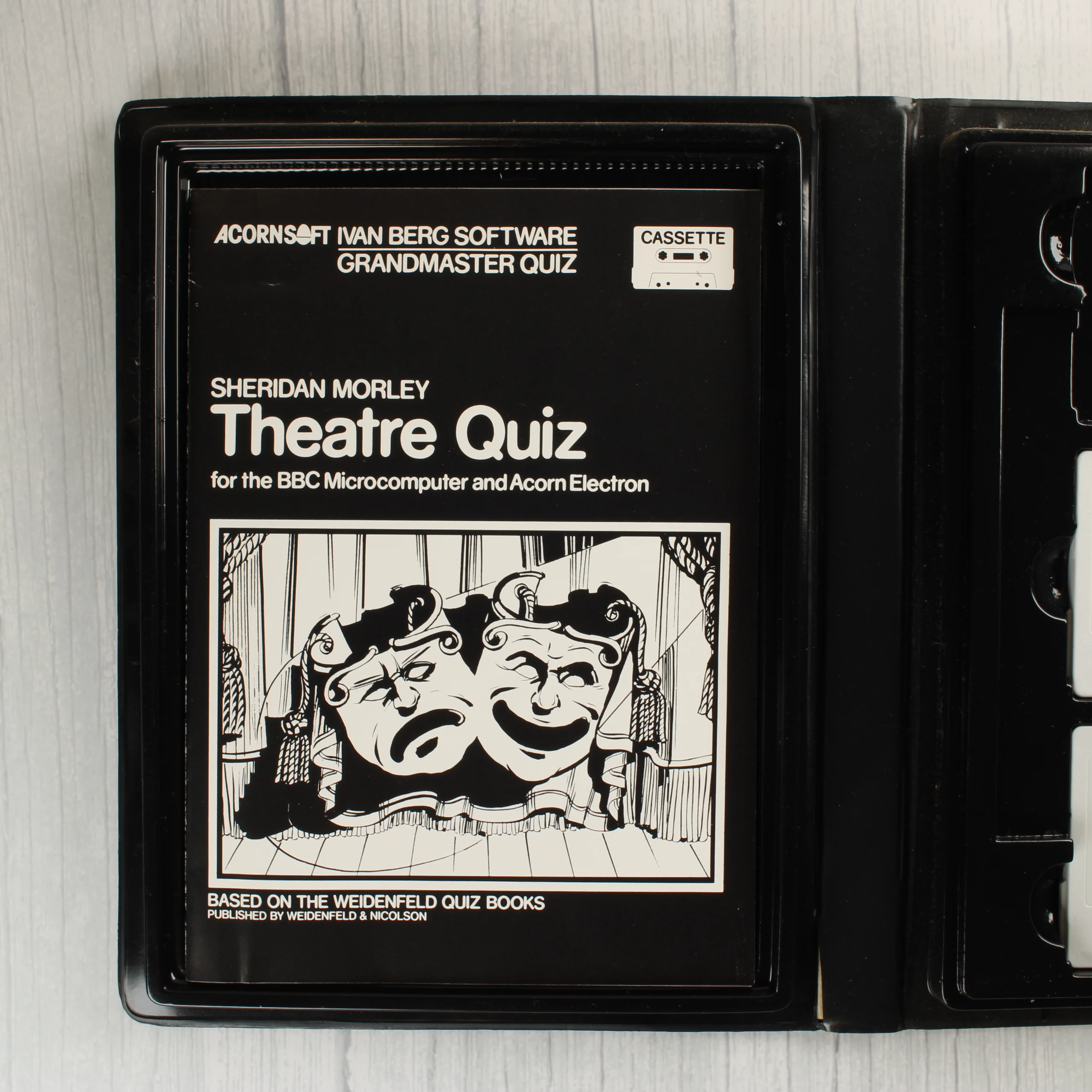 Az Acornsoft és az Ivan Berg Software által kiadott Theatre Quiz egy videójáték BBC Microcomputer és Acorn Electron platformokra. A csomag egy fekete, műanyag tokban található, amelynek elején Sheridan Morley neve és egy színházi maszkokat ábrázoló illusztráció látható. A készlet két darab fehér színű kazettát tartalmaz, amelyek közül az egyik a programot, a másik az adatokat tárolja. A belső részben egy fekete-fehér borítójú használati útmutató is helyet kapott. A tok hátoldalán részletes leírás olvasható a játékról és a sorozat többi tagjáról. A terméken egy sárga színű W.H. Smith árcímke maradványa látható a jobb felső sarokban. A csomagolás és a kazetták állapota megkímélt, a korának megfelelő használati nyomokkal.