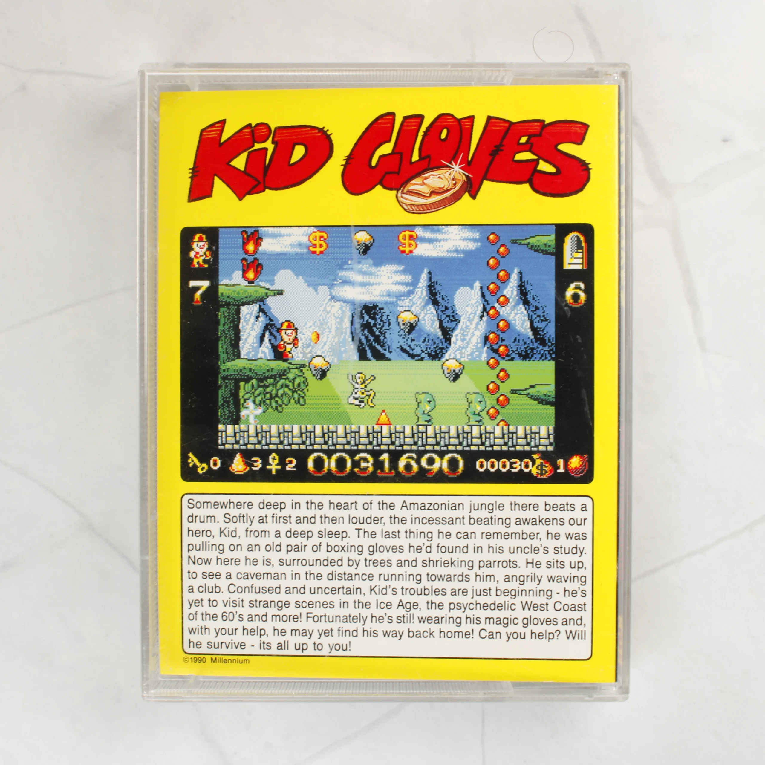 A Kid Gloves egy 1990-es kiadású videójáték Commodore Amiga platformra, amely az Astra Pack 5 sorozat részeként jelent meg. A csomag egy átlátszó műanyag tokot tartalmaz, amelyben egy színes, illusztrált borító és egy kék színű, 3,5 colos floppy lemez található. A borító elején rajzolt grafika látható, amely a főhőst, egy barlanglakót és egy kígyót ábrázol dzsungelkörnyezetben. A hátoldalon sárga alapon egy játékmenet-fotó és angol nyelvű leírás olvasható. A floppy lemezen fehér címke található zöld és lila feliratokkal, rajta a Millennium logójával. A hordozófelületet védő fémlemez tiszta és karcmentesnek tűnik.